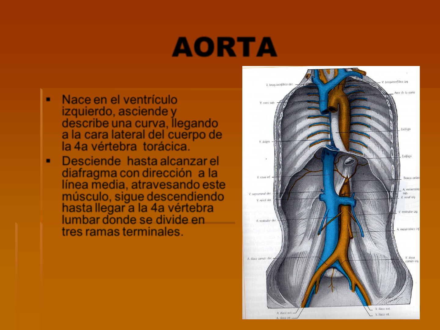 * * * AORTA Nace en el ventrículo izquierdo, asciende y describe una curva, llegando a la cara lateral del cuerpo de la 4a vértebra torácica. Desciende hasta alcanzar el diafragma con dirección a la línea media, atravesando este músculo, sigue descendiendo hasta llegar a la 4a vértebra lumbar donde se divide en tres ramas terminales. * * * AORTA Porción ascendente Arterias coronarias. * * * AORTA Arco Tronco braquiocefálico: Nace en el inicio del arco ligeramente hacia la derecha. asciende 3cm aprox. y a nivel de la art. Esternoclavcular derecha se divide en dos ramos terminales, carótida común y subclavia derecha. * * * AORTA Arco Carótida común izq. Nace en la cara sup del arco, posterior e izq. Sube en sentido superior y lateral de anterior a posterior, hasta la base del cuello. Mide 3cm. Aprox. Forma un triangulo junto con el tronco braquiocefálico en cuyo fondo esta la traquea. * * * AORTA Arco Subclavia izquierda Nace del arco posterior a la CCI. Sigue un trayecto vertical hasta la base del cuello. Ligeramente inclinada lateral y anteriormente. * * * AORTA Torácica. Ramas bronquiales: Nacen de la parte inferior del arco o de la parte superior de la aorta torácica.(cara anterior) Son tres. Penetran a los pulmones y se ramifican en los bronquios y pueden dar ramificaciones a órganos vecinos, linfáticos y traquea * * * AORTA Torácica Ramas esofágicas: Nacen en la cara anterior, son delgadas. Se distribuyen en el esófago y se anastomosan con las esofágicas bronquiales, frenicas y la gástrica izq. * * * AORTA Torácica Mediastínicas: Son finas e irrigan los órganos vecinos, pericardio, pleura y órganos linfáticos. * * * AORTA Torácica Intercostales posteriores: Son nueve a cada lado. Irrigan los espacios intercostales 3º a 11º. Nacen en la cara posterior cerca de la línea media, siguen por el espacio intercostal horizontalmente. Son mas largas las del lado derecho por la ubicación de la aorta * * * AORTA torácica * * * AORTA Torácica Intercostales posteriores: Al llegar al área posterior se dividen en: Duro espinal.- se divide en dos: Espinal .-penetra en las vértebras y el conducto vertebral a los que irriga. Dorsal.- Corre por la apófisis transversas y llega a los músculos y y tegumentos del dorso. * * * AORTA Torácica Intercostales posteriores: Intercostal propiamente dicha: Corre por el borde inferior de la costilla, se acompaña por arriba de la vena intercostal y por debajo del nervio intercostal. Alcanza la parte anterior donde se anastomosa con la intercostal anterior, nacida de la torácica interna. Irriga, los músculos intercostales, el área cutánea lateral del tronco y la parte media de la axila * * * AORTA Abdominal Se dividen en: PARIETALES.- Frenicas inferiores, lumbares y sacra media. VISCERALES.- Tronco celíaco, mesentérica sup e inf., Suprarenales medias, renales, testiculares u ovaricas. * * * AORTA Abdominal FRÉNICA INFERIORES.- Son dos, nacen inmediatamente despues que la arteria cruza el diafragma. Se dirigen hacia arriba, lateral y anteriormente aplicadas hacia el diafragma. Se divide en 2 ramas terminales: Medial .-Se anastomosa a la del lado opuesto. Lateral.- Se dirigen laterl y anteriormente hasta unirse con las intercostales. * * * AORTA Abdominal LUMBARES: Son cinco pares, La primera irriga parte del diafragma. Las otras llegan al canal vertebral. * * * AORTA Abdominal Se divide en dos ramas terminales: Espinal.- Irriga el conducto vertebral y la vértebra. Dorsal.- Irriga músculos y tegumentos de la región dorsal. Rama anterior o abdominal.- Se distribuye en los músculos de la pared lateral dorsal. * * * AORTA Abdominal SACRA MEDIA.- Corre delante de la ultima vertebra lumbar. Irriga los músculos espínales, iliacos, hueso sacro, cara posterior del recto, y termina en el curepo coccígeo. * * * AORTA Abdominal Tronco celíaco.- Nace en la cara anterior, mide de 1 a 3 cm, y llega hasta el borde superior del cuerpo del páncreas donde termina. Irriga al hígado, estomago, Bazo y páncreas. Ramas terminales: Gástrica izquierda.-Curva interna del estomago. Hepática común.- páncreas e hígado. Esplénica.- Pancreas y el estomago. * * * AORTA Abdominal MESENTERICA SUPERIOR: Irriga parte del páncreas, intestino delgado, y parte derecha del intestino grueso. Desciende hacia la derecha pero con una convexidad hacia la izq. * * * AORTA Abdominal MESENTERICA INFERIOR.- S e dirige hacia abajo y hacia la izquierda. Irriga la parte izquierda del colón y todo el recto. * * * AORTA Abdominal SUPRARENALES MEDIAS: Son dos, derecha e izq. Irrigan las glándulas suprarrenales. * * * AORTA Abdominal RENALES.- Son dos , derecha e izq., corren lateralmente hasta alcanzar su riñón respectivo. Sus ramas terminales son la anterior y la posterior. * * * AORTA Abdominal TESTICULAES U OVARICAS.- Son dos, derecha e izq. Testiculares.- Son mas largas Ováricas.- irrigan el ovario y su trompa uterina