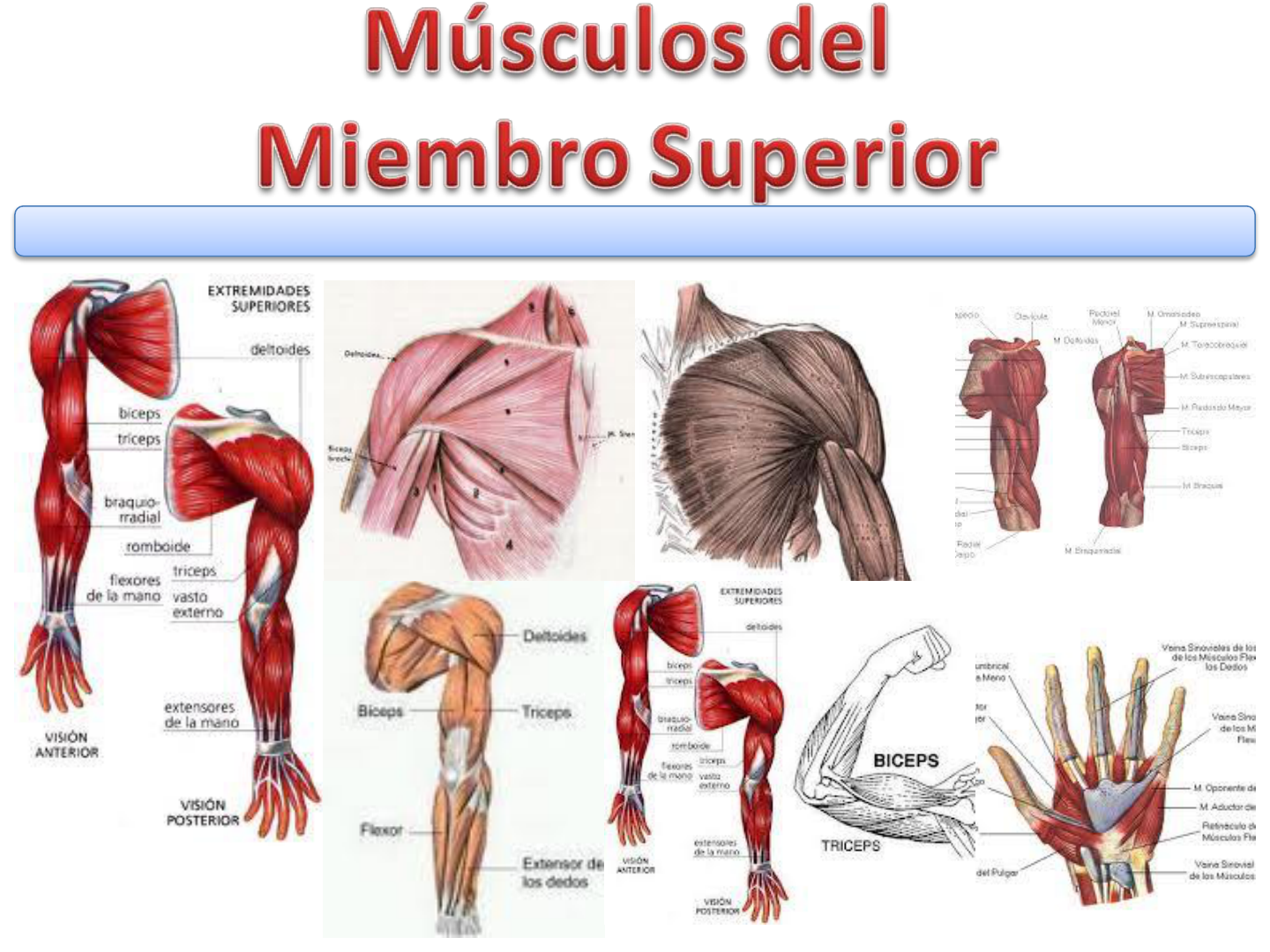 Músculos del Miembro Superior Todos los músculos del miembro superior son pares, uno para cada miembro Músculos del hombro: Ubicación: En la cara superior del hombro, debajo de la piel. Características: Robusto, triangular, de vértice externo e inferior. Origen: En el tercio lateral de la clavícula, borde lateral de acromio, borde inferior de la espina escapular. Inserción: En la tuberosidad deltoidea del húmero. Relaciones: La cara externa es superficial, la interna cubre la articulación del hombro, y tendones musculares, esta separada del húmero por una bolsa denominada subdeltoidea. Inervación: Por el nervio axial. Acción: Abducción, aducción, flexión, extensión y rotación del brazo. Deltoides Ubicación: En la posición posterosuperior del hombro, por la fosa supraespinosa de la escapula. Características: Triangular. Origen: En la fosa supraespinosa. Inserción: En el tubérculo mayor del húmero (troquiter). Relaciones: Esta cubierto por el trapecio, el deltoides y la piel. Inervación: Por el nervio supraescapular. Acción: Abducción, rotación interna y externa del brazo. supraespinoso Ubicación: En la región posterior del hombro, ocupa la fosa infraespinosa de la escápula. Características: Aplanado, triangular, de vértice externo. Origen: En la fosa infraespinosa de la escápula. Inserción: En el tubérculo mayor del húmero (troquiter). Relaciones: Esta cubierto por el trapecio, el deltoides y la piel, esta en relación con el redondo mayor y menor. Inervación: Por el nervio supraescapular. Acción: Rotación externa del brazo. infraespinoso Ubicación: En la región posterior del hombro. Características: Pequeño en forma de cilindro. Origen: Se origina en los dos tercios superiores del borde lateral de la escápula, lateral al infraespinoso. Inserción: En el tubérculo mayor del húmero (troquiter). Relaciones: Esta cubierto por la piel y el deltoides y cubre la porción larga del tríceps. Inervación: Por el nervio axilar. Acción: Aducción y rotación externa del brazo. Redondo menor Ubicación: En la región posterior del hombro. Características: Robusto y cilíndrico. Origen: En el borde de la escápula. Inserción: En el labio interno de la corredera bicipital del húmero. Relaciones: La cara posterior esta en relación con el dorsal ancho, la piel y la porción larga del tríceps; la cara anterior con el dorsal ancho. Acción: Aductor del brazo, elevador de la escápula. Redondo mayor Ubicación: En la región del hombro, ocupa la fosa escapular. Características: Ancho, grueso y triangular. Origen: En la fosa escapular. Inserción: En el tubérculo menor del húmero (troquín). Relaciones: Esta en relación, por delante, con el serrato mayor y con los órganos del hueco axilar. Inervación: Por el nervio subescapular. Acción: Rotatorio del brazo hacia dentro y es aductor del húmero. subescapular Músculos del brazo: Ubicación: En la región anterior y superficial del brazo. Características: Largo y cilíndrico. Constituido en su parte superior por dos porciones o cabezas, interna o corta y externa o larga. Origen: - La cabeza larga en el tubérculo supragleniodeo y la cabeza corta en la apófisis coracoides. Inserción: En la tuberosidad del radio y la aponeurosis del bíceps braquial en el cúbito. Relaciones: El tercio superior entre el deltoides y el pectoral mayo por delante; el subescapular, redondo mayor y el dorsal ancho por detrás. La parte media es superficial y esta sobre el braquial anterior. Inervación: Por el nervio musculocutáneo. Acción: Elevador y aductor del brazo; flexor y supinador del codo. Bíceps braquial Ubicación: En la región anterior del brazo, por dentro de la porción corta del bíceps. Características: Grueso y prismático. Origen: Apófisis coracoides. Inserción: En la parte media del borde interno del húmero. Relaciones: Inervación: Por el nervio musculocutáneo. Acción: Flexor y elevador del brazo, depresor del hombro. Coracobraquial Ubicación: En la región anterior e inferior del brazo debajo del músculo bíceps. Características: Ancho, aplanado. Origen: En los dos tercios inferiores de la superficie anterior del húmero. Inserción: En la apófisis coronoides del cúbito. Relaciones: La cara anterior con el bíceps, la cara posterior esta sobre el húmero y la articulación del codo. El borde interno, con el tríceps por arriba, y con el pronador redondo por abajo. El borde externo con el tríceps por arriba y con el braquirradial por abajo. Inervación: Por el nervio musculocutáneo. Acción: Flexor del antebrazo sobre el brazo. braquial Ubicación: En la región posterior del brazo. Características: Esta constituido por tres porciones: cabeza larga, cabeza lateral y cabeza medial. Origen: La cabeza larga, en el tubérculo infraglenoideo; la cabeza lateral en la superficie lateral y posterior del húmero; la cabeza medial en la superficie posterior del húmero debajo del surco radial. Inserción: En la cara posterior y borde del olécranon. Relaciones: En su origen, el tríceps esta cubierto por el deltoides, en el brazo con el húmero. La cara posterior con el braquirradial y el braquial anterior. Inervación: Por el nervio radial. Acción: Extensor del antebrazo, y aductor del hombro Tríceps braquial Ubicación: En la cara superficial de la región posterior del antebrazo. Características: Aplanado y corto adopta la, adopta la forma de una pirámide. Origen: En el epicóndilo lateral del húmero. Inserción: En el borde lateral del olécranon y la cara posterior del cúbito. Inervación: Por el nervio radial. Acción: Extensor del antebrazo. ancóneo Músculos del antebrazo: Ubicación: En la parte externa del primer plano de la región anterior del antebrazo. Características: Aplanado, oblicuo, presenta dos regiones, la cabeza humeral y la cubital. Origen: La cabeza humeral en el epicóndilo medial del húmero, y la cabeza cubital en la apófisis coronoides. Inserción: En la pa