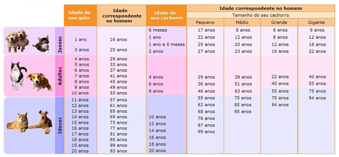 Idade de cães e gatos correspondente à idade dos seres humanos