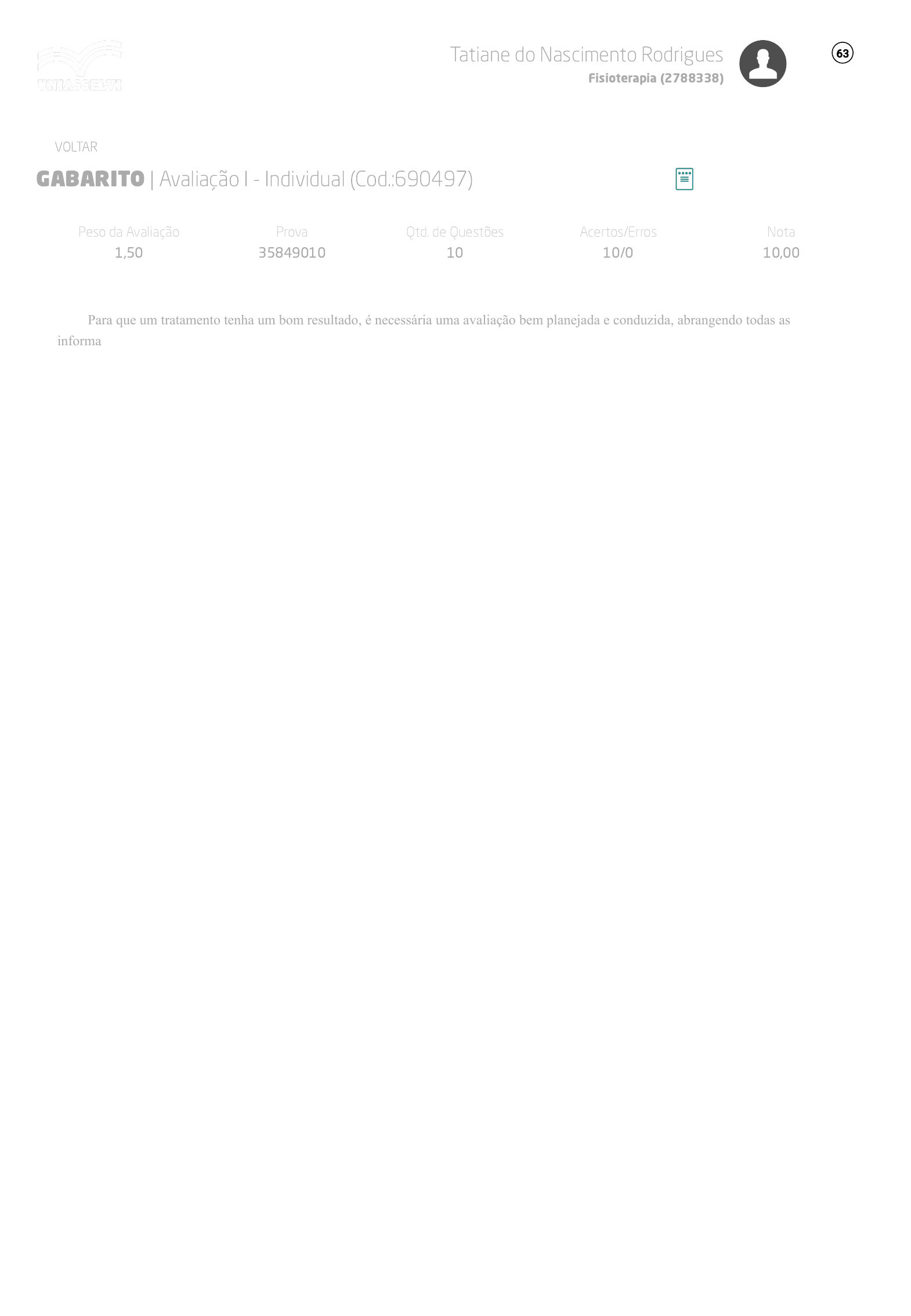 GABARITO | Avaliação I - Individual (Cod.:690497) Peso da Avaliação 1,50 Prova 35849010 Qtd. de Questões 10 Acertos/Erros 10/0 Nota 10,00 Para que um tratamento tenha um bom resultado, é necessária uma avaliação bem planejada e conduzida, abrangendo todas as informações necessárias. Um programa de fisioterapia efetivo começa com uma coleta de informações sobre o paciente, de modo a poder avaliar com precisão a gravidade da disfunção apresentada e determinar se ele será beneficiado com a fisioterapia. Uma avaliação ampla e minuciosa é essencial para a construção de um plano de tratamento adequado para as necessidades e limitações de cada paciente (BARBOSA et al., 2006). Sobre a palpação, analise as sentenças a seguir: I- Para verificar a temperatura da pele, você deve deslocar a pele e os tecidos moles com as pontas dos dedos. II- O objetivo da palpação é avaliar a sensibilidade e flexibilidade dos tecidos. III- Para verificar a mobilidade miofacial, você deve utilizar o dorso da mão. IV- Na palpação, você utilizará pressão leve para palpar a pele e utilizará pressão mais forte para palpar ossos. Assinale a alternativa CORRETA: FONTE: BARBOSA, Andreane Daniele et al. Avaliação fisioterapêutica aquática. Fisioterapia em Movimento, Curitiba, v. 19, n. 2, p. 135- 147, abr. 2006. Disponível em: https://periodicos.pucpr.br/index.php/fisio/article/view/18723/18144. Acesso em: 21 jun. 2020. A As sentenças I e III estão corretas. B As sentenças II e IV estão corretas. C As sentenças I e IV estão corretas. D As sentenças II e III estão corretas. A avaliação fisioterapêutica é essencial para a reabilitação do paciente. A avaliação deve ser minuciosa e individualizada, sendo necessária para identificar possíveis comprometimentos que necessitem de intervenção do terapeuta. A reabilitação depende de uma avaliação eficaz para identificar os déficits e, assim, proporcionar um tratamento apropriado (GAVIM et al., 2013). Sobre o exame físico, classifique V para as sentenças verdadeiras e F para as falsas: ( ) No exame físico, você deve realizar palpação, que é a medição dos ângulos articulares encontrados no corpo humano. ( ) No exame físico, você deve realizar teste de força muscular. É através dele que se avalia a capacidade de um músculo desenvolver tensão contra uma resistência. ( ) No exame físico, não é necessário avaliar as atividades de vida diária. ( ) No exame físico, a avaliação postural é importante para observar alinhamentos, simetrias, através de vista anterior, posterior, lateral esquerda e direita. Assinale a alternativa que apresenta a sequência CORRETA: FONTE: GAVIM, André et al. A influência da avaliação fisioterapêutica na reabilitação neurológica. Saúde em Foco, São Paulo, v. 5, n. 6, p. 71-77, jan. 2013. Disponível em: http://portal.unisepe.com.br/unifia/wp-content/uploads/sites/10001/2018/06/9influencia_avaliacao.pdf. Acesso em: 21 jun. 2020. A V - V - V - V. B F - V - F - V. C V - V - F - F. D F - F - V - V. VOLTAR A+ Alterar modo de visualização 1 2 Tatiane do Nascimento Rodrigues Fisioterapia (2788338) 63 O punho é composto por dois ossos longos, rádio e ulna, com suas epífises distais. A mão compreende vinte e sete ossos, além dos sesamoides, dividindo-se em três partes: carpo, metacarpo e falanges. O carpo é formado por oito ossos, que são: escafoide, semilunar, piramidal, pisiforme, trapézio, trapezoide, grande osso ou capitato e ganchoso ou hamato. O metacarpo compreende cinco ossos longos com suas epífises e diáfises e unem o carpo às falanges, e são numerados ordenadamente de um a cinco, de polegar ao dedo mínimo. Os dedos são cinco, formados por três falanges: proximal, média e distal, exceto o polegar, que é constituído de somente duas: proximal e distal (OSÓRIO et al., 2008). Sobre patologias de punho e mão, classifique V para as sentenças verdadeiras e F para as falsas: ( ) A tenossinovite de Quervain é a compressão do nervo mediano no túnel do carpo, provocando dor e parestesia. ( ) A osteoartrite é caracterizada por lesão articular, dor e degeneração óssea. ( ) A Síndrome do Túnel do Carpo é um processo inflamatório no local que atinge os tecidos sinoviais e também os tendões, gerando dor na região. Assinale a alternativa que apresenta a sequência CORRETA: FONTE: OSÓRIO, A. et al. Avaliação da idade óssea através de radiografia da mão e do punho. Revista Uningá, Maringá, v. 26, n. 1, p. 77- 94, abr. 2008. Disponível em: http://34.233.57.254/index.php/uninga/article/view/672/321. Acesso em: 5 jul. 2020. A V - F - V. B V - F - F. C F - F - V. D F - V - F. A dor lombar representa, hoje, uma das principais queixas na clínica diária. As consequências econômicas da lombalgia foram estimadas nos Estados Unidos em gastos de 16 a 50 bilhões de dólares por ano. Nesses gastos estão incluídos serviços de saúde e prejuízos pela falta no trabalho (BARBOSA et al., 2002). Sobre a avaliação da amplitude de movimento da coluna lombar, assinale a alternativa CORRETA: FONTE: BARBOSA, Luís Guilherme et al. Prevalência de lombalgia em acadêmicos de fisioterapia no ambulatório de um hospital universitário. Fisioterapia Brasil, Rio de Janeiro, v. 3, n. 6, p. 371-376, nov. 2002. Disponível em: http://www.portalatlanticaeditora.com.br/index.php/fisioterapiabrasil/article/view/2986. Acesso em: 25 jun. 2020. A Goniometria, mensuração com fita métrica, análise radiológica. B Análise radiológica, pesquisa de anticorpos anti-Rh, goniometria. C Hemograma, mensuração com fita métrica, análise radiológica. D Mensuração com fita métrica, análise radiológica, eletrocardiograma. A lombalgia crônica inespecífica é um problema comum e incapacitante, que limita a função e as atividades da vida diária. A patogênese da lombalgia crônica inespecífica é desconhecida, e diversos tecidos espinhais podem ser fo