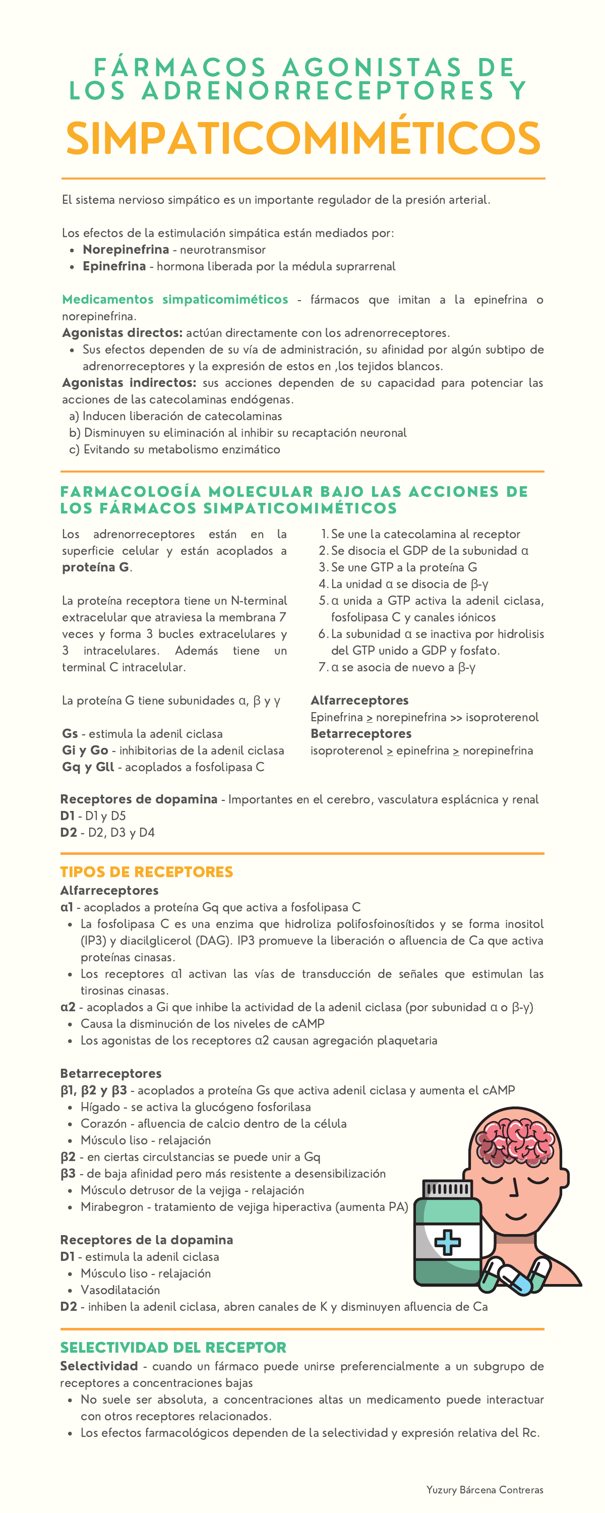 SIMPATICOMIMÉTICOS F Á R M A C O S A G O N I S T A S D E L O S A D R E N O R R E C E P T O R E S Y Los adrenorreceptores están en la superficie celular y están acoplados a proteína G. La proteína receptora tiene un N-terminal extracelular que atraviesa la membrana 7 veces y forma 3 bucles extracelulares y 3 intracelulares. Además tiene un terminal C intracelular. La proteína G tiene subunidades α, β y γ Gs - estimula la adenil ciclasa Gi y Go - inhibitorias de la adenil ciclasa Gq y Gll - acoplados a fosfolipasa C Norepinefrina - neurotransmisor Epinefrina - hormona liberada por la médula suprarrenal Sus efectos dependen de su vía de administración, su afinidad por algún subtipo de adrenorreceptores y la expresión de estos en ,los tejidos blancos. El sistema nervioso simpático es un importante regulador de la presión arterial. Los efectos de la estimulación simpática están mediados por: Medicamentos simpaticomiméticos - fármacos que imitan a la epinefrina o norepinefrina. Agonistas directos: actúan directamente con los adrenorreceptores. Agonistas indirectos: sus acciones dependen de su capacidad para potenciar las acciones de las catecolaminas endógenas. a) Inducen liberación de catecolaminas b) Disminuyen su eliminación al inhibir su recaptación neuronal c) Evitando su metabolismo enzimático Yuzury Bárcena Contreras FARMACOLOGÍA MOLECULAR BAJO LAS ACCIONES DE LOS FÁRMACOS SIMPATICOMIMÉTICOS Se une la catecolamina al receptor Se disocia el GDP de la subunidad α Se une GTP a la proteína G La unidad α se disocia de β-γ α unida a GTP activa la adenil ciclasa, fosfolipasa C y canales iónicos La subunidad α se inactiva por hidrolisis del GTP unido a GDP y fosfato. α se asocia de nuevo a β-γ 1. 2. 3. 4. 5. 6. 7. Alfarreceptores Epinefrina > norepinefrina >> isoproterenol Betarreceptores isoproterenol > epinefrina > norepinefrina Receptores de dopamina - Importantes en el cerebro, vasculatura esplácnica y renal D1 - D1 y D5 D2 - D2, D3 y D4 La fosfolipasa C es una enzima que hidroliza polifosfoinosítidos y se forma inositol (IP3) y diacilglicerol (DAG). IP3 promueve la liberación o afluencia de Ca que activa proteínas cinasas. Los receptores α1 activan las vías de transducción de señales que estimulan las tirosinas cinasas. Causa la disminución de los niveles de cAMP Los agonistas de los receptores α2 causan agregación plaquetaria Hígado - se activa la glucógeno fosforilasa Corazón - afluencia de calcio dentro de la célula Músculo liso - relajación Músculo detrusor de la vejiga - relajación Mirabegron - tratamiento de vejiga hiperactiva (aumenta PA) Músculo liso - relajación Vasodilatación TIPOS DE RECEPTORES Alfarreceptores α1 - acoplados a proteína Gq que activa a fosfolipasa C α2 - acoplados a Gi que inhibe la actividad de la adenil ciclasa (por subunidad α o β-γ) Betarreceptores β1, β2 y β3 - acoplados a proteína Gs que activa adenil ciclasa y aumenta el cAMP β2 - en ciertas circulstancias se puede unir a Gq β3 - de baja afinidad pero más resistente a desensibilización Receptores de la dopamina D1 - estimula la adenil ciclasa D2 - inhiben la adenil ciclasa, abren canales de K y disminuyen afluencia de Ca No suele ser absoluta, a concentraciones altas un medicamento puede interactuar con otros receptores relacionados. Los efectos farmacológicos dependen de la selectividad y expresión relativa del Rc. SELECTIVIDAD DEL RECEPTOR Selectividad - cuando un fármaco puede unirse preferencialmente a un subgrupo de receptores a concentraciones bajas Haplotipos - polimorfismos distintos en combinaciones específicas Los polimorfismos alteran la susceptibilidad a la insuficiencia cardiaca, propensión a la desensibilización, o modulan las respuestas terapéuticas a medicamentos en enfermedades como el asma. Puede darse lentamente en horas o días por cambios transcripcionales o transduccionales del receptor o su migración a la superficie celular. Por fosforilación del adrenorreceptor por receptores cinasa acoplados a proteína G (GRK). Al ser fosforilado es más afín a las arrestinas y su capacidad de activar la proteína G se atenúa. Arrestina interactúa con clatrina y adaptador de catrina AP2 y hay endocitosis del receptor. (Rápida) Por retroalimentación del segundo mensajero - se activa receptor beta, se activa adenil ciclasa, acumulación de cAMP, activación de proteína cinasa A (PKA) que fosforila receptor y lo inhibe. También cambia su afinidad de Gs a Gi y se inhibe aún más la respuesta. REGULACIÓN DEL RECEPTOR La respuesta depende del número y la función de los adrenorreceptores y en la regulación de estos por las catecolaminas, hormonas y fármacos, la edad y una serie de estados de enfermedad. Desensibilización: El tejido se vuelve menos sensible a una estimulación adicional por la exposición durante un tiempo al agonista. Tolerancia, refractariedad, taquifilaxia. Homóloga - pérdida de respuesta exclusivamente de los receptores expuestos repetida o sostenidamente al agonista. Heteróloga - la desensibilización de un agonista provoca desensibilización de otro no activado por el agonista. Agonistas sesgados - activan selectivamente vías de señalización acopladas con la arrestina Yuzury Bárcena Contreras POLIMORFISMOS DE LOS RECEPTORES Elimina 90% de NE en el corazón y 60% en vasculatura (estructuras sinápticas menos desarrolladas) Puede ser bloqueado por cocaína, atomoxetina o reboxetina - aumenta NE. A nivel periférico hay un cuadro de activación simpática pero hay estimulación de α2 en el tronco encefálico y reduce la activación simpática. Anfetaminas - se bloquea la recaptación y se da el transporte inverso de NE. EL TRANSPORTADOR DE LA NOREPINEFRINA El NET es la vía principal por la que se recapta la NE en la membrana neuronal presináptica y se elimina de la hendidura sináptica, después puede reingresar a vesículas o ser metabolizada por la monoamino oxidasa a dihi