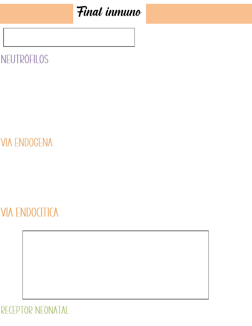 @tricerapuntes fagocitan microorganismos mediante RRps, rc de complemento y receptores para el fragmento fc de las inmunoglobulinas. Se extravasan a través de un endotelio plano. Expresan: l-selectina, siamolucinas, cr1 e integrinas. -Infiltran los tejidos, en respuesta a la infección bacteriana, extravasándose a través de un endotelio plano. - Su producción, en médula ósea, se acelera en respuesta a las infecciones bacterianas. - La adherencia estable de los neutrófilos al endotelio involucra integrinas, miembros de la superfamilia de las inmunoglobulinas y quimiocinas. En cpa PROF Y NO PROFESIONALES. OPERATIVO EN CELULAS ENDOTELIALES Y FIBROBLASTOS. EN AUSENCIA DE INFECCION CMH 1 CARGAN PEPTIDOS PROPIOS. Conduce a la generación de péptidos antigénicos que activan a células TCD8+ Requiere de la presencia de proteosomas. En ausencia de procesos infecciosos, las moléculas de clase CMH I se cargaran de péptidos originados de la degradación de proteínas propias. Operativa en cpa PROFESIONALES Y EN EL EPITELIO TIMICO. EL ANTIGENO ES DEGRADADO A PEPTIDOS EN ENDOSOMAS TARDIOS. Se expresa en el endotelio vascular, Se expresa en la cara luminal del intestino delgado en el neonato. Regula el aumento de la vida media de la IgG sérica en el neonato y el adulto. • Pasaje transplacentario de la IgG. • Tiene homología con CHM Clase I • Pasaje IgG materna desde la luz duodenal a la circulación del lactante. • No estimula el sistema de complemento. Cátedra 1 Recopilación de las respuestas que más aparecen en parciales y finales de inmuno. (Choice) - La presentación cruzada de antígenos es la única vía que permitirá la activación de células T CD8+ en la inmunidad anti-tumoral. - La presentación cruzada de antígenos permite que una célula dendrítica convencional que no es infectada por un virus particular presente péptidos virales a linfocitos T CD8+ específicos. - Las tres vías de procesamiento antigénico pueden ocurrir en forma simultánea en una célula dendrítica. Datos CLAVES, conceptos y definiciones. @tricerapuntes COMPONENTES QUE ACTUAN EN LA DEFENSA DE MICROORGANISMOS EXPRESAN CCR7, CD40, CD27, CD21, CMH II (DP,DQ,DR). No expresan IgM, IgD. Mayor frecuencia en sangre periférica de adultos. Actúan como CPAprof. Pueden extenderse a lo largo de toda la vida. IFN-gamma - TH17 y TH2 + Activan NK junto con IL-2 + promueve retroalimentación de TH2 (NO expansión clonal) + Inmunidad antiviral + Memoria TCD8+ + Maduración de las células dendríticas M. Tuberculosis L-selectina, LFA-1, rag-1 y rag-2, IL-2, cd25, TH1, IL-12, IFN-gamma. NO cd21, ni IL-22, CDCR4 y CXCL12. AERUS TFH, SISTEMA DE COMPLEMENTO, CXCL13, IL-21, C3b, CXCL12 Bacterias capsuladas Mac-1, sistema de complemento, neutrófilos, B1, BZM. NO IFNs-gamma ni tap1/tap2 HONGOS IL-22, IL-23, CRb. NO IFNs-gamma Bacteria de síntesis de exotoxinas IL-21, TFH, CD28, CD40, CXCR5, CCL19. NO IL-13. CMH II >> disminución TCD4+. SIN CMH II no podrán desarrollar respuestas TH2. TAP1/TAP2 >> disminución TCD8+ y CMH I CMH I>> disminución TCD8+ Beta2- microglobulina >> disminución TCD8+ naive. -Es producida por células TH1, TCD8+ y NK -Los macrófagos expresan receptores para el interferón. -Promueve la inmunidad antiviral. @tricerapuntes CENTRALES: Expresan CD3, CD28, CCR7 Y CMH I. Pueden diferenciarse en células T de memoria efectoras. EFECTORAS: Expresan HLA-A. CD3, CD28. (NO CCR7 NI CD40) Il-4> Estimula la activación del macrófago en perfil alternativo. Switch LB hacia IgE. IL-5 >eosinofilia y activación CCDA IL-8 > estimula respuesta antiviral. Interactúa con GAG expresado en la cara luminal del endotelio plano. IL-9 Activación para que mastocitos liberen histamina IL-15 > síntesis y activación de NK y expansión clonal de LT y B ya activadas. IL-17A > Activa macrófagos en un perfil M1, activa células epiteliales, neutrófilos, enterocitos. Estimula síntesis de IL- 8, mucinas. IL-22> Activa células epiteliales, estimula el reclutamiento de neutrófilos a lamina propia. IL-21 > inmunidad antiviral, participa en colaboración t-b, defensa ante bacterias que sintetizan exotoxinas. IL-33 > estimula perfil TH2 a IL-4, 5,13 y al perfil alternativo del macrófago. CELULAS NK -La mayoría de las células NK presentes en sangre periférica expresan la capacidad de migrar, a través de un endotelio plano a tejidos inflamados. -Los receptores KIR reconocen moléculas de histocompatibilidad de clase I (no CMH II) y pueden mediar señales inhibitorias o estimulatorias en las células NK. -Pueden a través de sus receptores estimulatorios pueden reconocer: moléculas de clase I del CMH, anticuerpos IgG y moléculas expresadas por células enfrentadas a estímulos estresores. - La mayoría no expresan CCR7 en sangre periférica. - NKG2D es un receptor expresado por células nk que media una señal estimulatoria al reconocer MICA y MICB IL-2 Expansión clonal TH1 No es posible generar células T de memoria específicas hacia hidratos de carbono. La frecuencia de células T de memoria frente a un epitope antigénico particular es de 100 a 1000 veces mayor respecto de la frecuencia de células T naive frente al mismo epitope. La expresión persistente de PD-1 en las células T de memoria se asocia con un deterioro funcional. La IL-7 previene la apoptosis de las células T de memoria centrales. La IL-15 induce la proliferación de las células T de memoria centrales en órganos linfáticos secundarios y en médula ósea. @tricerapuntes - La citotoxicidad celular dependiente de anticuerpos, mediada por las células NK contra células infectadas por virus, es activada por anticuerpos que reconocen epitopes virales en la superficie de la célula infectada. - Los principales ligandos inhibitorios de las células NK son las moléculas del CMH de clase I. CELULA DENDRITICA PLASMACITOIDE -Expresan TLR 7 y 9 a través de los cuales reconocen ADN y ARN virales. -La mayor productora de IFNs TIPO 1 -Se ubican en sa