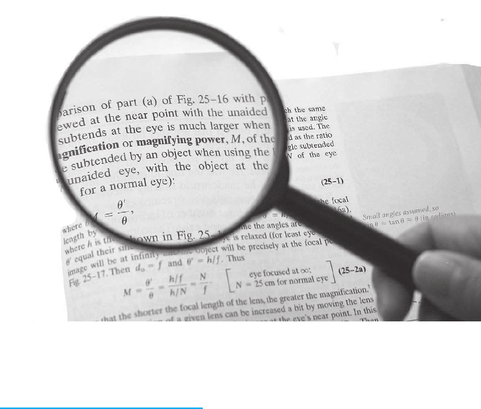 696 E n la explicación del comportamiento de la luz en los dos capítulos anterio- res, también se describieron algunos instrumentos como el espectrómetro y el interferómetro Michelson. En este capítulo se estudiarán algunos otros instrumentos, más comunes, la mayoría de los cuales utilizan lentes, como la cámara fotográfica, el telescopio y el microscopio; se estudiará, además, el funcionamiento del ojo humano. Para describir la forma de operar de los instrumentos ópticos, se emplearán diagramas de rayos. Sin embargo, se verá que para comprender algunos aspectos de su operación se recurrirá a la naturaleza ondulatoria de la luz. CAPÍTULO25 Instrumentos ópticos De los muchos dispositivos ópticos que se analizan en este capítulo, la lente de aumento (o lupa) es el más simple. He aquí una amplificación de la página 705 de la versión en inglés de este capítulo, que describe cómo funciona la lente de aumento de acuerdo con el modelo de rayos. En este capítulo también se analizan las cámaras fotográficas de película y las digitales, el ojo humano, los telescopios y los mi- croscopios, así como la resolución de imagen, los rayos X y las explora- ciones de TC. Cámaras, de película y digitales Los elementos básicos de una cámara son una lente, una cámara oscura, un obtura- dor que permite que la luz pase a través de la lente sólo brevemente, y, en una cáma- ra tradicional, un rollo de película (figura 25-1), o, en una cámara digital, un sensor electrónico. Cuando el obturador se abre, la luz proveniente de los objetos externos en el campo de visión es enfocada por la lente como una imagen sobre la película o el sensor. La película contiene químicos fotosensibles que cambian cuando entran en contacto con la luz. En el proceso de desarrollo, las reacciones químicas provocan que las áreas cambiadas se vuelvan opacas, de modo que la imagen se registra sobre la película.† Cualquier persona podrá observar la imagen si remueve la parte trasera de una cámara convencional y ve a través de un trozo de papel de seda (sobre el cual se formará la imagen), colocado en el lugar de la película, con el obturador abierto. Cámaras digitales, sensores CCD En una cámara digital la película se sustituye con un sensor semiconductor conoci- do como dispositivo de carga acoplada o CCD, por sus siglas en inglés. Un sensor CCD está hecho de millones de pequeños pixeles (“elementos de imagen”); observe la fi- gura 24-29. Un sensor‡ de 3 MP (3 megapixeles) contendría unos 1500 pixeles verti- calmente por 2000 pixeles horizontalmente sobre un área de 9 3 12 mm. La luz que alcanza cualquier pixel libera electrones del semiconductor. Cuanto más intensa sea la luz, más carga se acumulará durante el breve tiempo de exposición. Electrodos conductores llevan carga de cada pixel (en serie en el tiempo, hilera por hilera, de ahí el nombre de “carga acoplada”) a un procesador central que almacena la bri- llantez relativa de los pixeles y permite, más tarde, la reformación de la imagen en una pantalla de computadora o impresora. Un CCD es completamente reutilizable. Una vez que las cargas de pixel son transferidas a la memoria, se puede tomar una nueva fotografía. El color se logra mediante filtros rojo, verde y azul sobre pixeles alternados, como se muestra en la figura 25-2 que aparece en el anexo a color al final del libro, simi- lar a como sucede en un TRC o en una pantalla LCD. El tipo de sensor que se ilustra en la figura 25-2 contiene el doble de pixeles verdes que rojos o azules (el verde tiene una mayor influencia sobre la sensación de claridad). El color analizado por compu- tadora en cada pixel es la intensidad de ese pixel promediada con las intensidades de los colores vecinos más cercanos. A fin de reducir la cantidad de memoria para cada fotografía, los programas de compresión promedian varios pixeles, pero con una consecuente pérdida de claridad o “resolución”. Artefactos digitales Las cámaras digitales pueden producir artefactos en la imagen (efectos artificiales introducidos por el proceso), como el que se describe en la figura 25-3 utilizando el ordenamiento común de los pixeles “en mosaico” de la figura 25-2. Una tecnología más novedosa utiliza un sistema de capa de silicio semiconductor semitransparente, que se basa en el hecho de que diferentes longitudes de onda de la luz penetran el silicio a diferentes profundidades: cada pixel es un emparedado de capas parcial- mente transparentes, una para cada color. La capa superior absorbe luz azul, lo que permite que pasen las luces verde y roja. La segunda capa absorbe la luz verde y la capa del fondo detecta la roja. Los tres colores son detectados por cada pixel, lo que da como resultado una mejor resolución de color y menos artefactos. 25–1 SECCIÓN 25–1 Cámaras, de película y digitales 697 Lente Diafragma o “alto” D = apertura de la lente Obturador Película Visor FIGURA 25–1 Una cámara simple. †A esto se le llama negativo, porque las áreas negras corresponden a objetos brillantes y viceversa. El mismo proceso ocurre durante la impresión para producir una imagen “positiva” en blanco y ne- gro a partir del negativo. La película de color tiene tres emulsiones (o tintes) que corresponden a los tres colores primarios. ‡Cada diferente color de pixel en un CCD se cuenta como un pixel por separado. En contraste, en una pantalla LCD (sección 24-11), un grupo de tres subpixeles se cuenta como un pixel, un conteo más conservador. F Í S I C A A P L I C A D A La cámara Electrodos Pixel de color FIGURA 25–2 Porción de un sensor CCD típico. Un grupo cuadrado de cuatro pixeles a veces se llama “pixel de color”. VA RV F Í S I C A A P L I C A D A Cámara digital Objecto Blanco Blanco Negro Pixeles Imagen FIGURA 25–3 Suponga que se toma una fotografía que incluye una delgada línea negra (el objeto) sobre un fondo blanco. La imagen de esta l