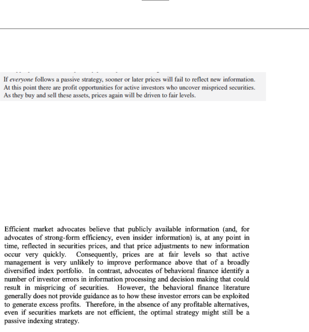 Nombre___________________ Nombre___________________ PONTIFICIA UNIVERSIDAD CATOLICA DE CHILE FACULTAD DE CIENCIAS ECONOMICAS Y ADMINISTRATIVAS FINANZAS I (EAA 220 B) Control 7 Primer Semestre 2016 Profesor: Ignacio Alvarez Total: 6 puntos Ayudantes: Eduardo Busch Tiempo: 12 minutos Camila Echeverría Abel García-Huidobro 1) ¿Qué pasaría con la eficiencia informacional del mercado si todos los inversionistas pensaran que el mercado es eficiente y por ende todos utilizaran estrategias pasivas (indexadas)? ( 2 puntos) 2) Algunos partidarios de behavioral finance están de acuerdo con partidarios de la hipótesis de mercados eficientes en cuanto a que indexarse es la estrategia óptima para la mayoría de los inversionistas. Sin embargo, el razonamiento para esta conclusión es distinta. Compare la lógica de la indexación (estrategia pasiva) para cada escuela de pensamiento. (2 puntos) 3) Explique a que se refiere el survivorship bias para el Equity Risk Premium Puzzle. Use el reverso de esta hoja para su respuesta. (2 puntos) 2
