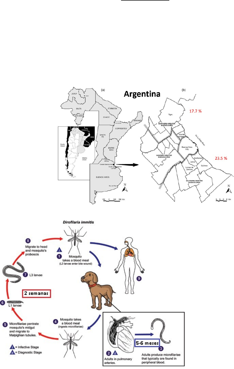 DIROFILARIOSIS Infección parasitaria de curso crónico, producida por Dirofilaria immitis (gusano del corazón), nematode trasmitido por mosquitos. HD: Caninos, gatos, humanos, focas y hurones. HI: Mosquitos (Aedes spp, Culex spp, Anopheles spp). Los estadios adultos se localizan en el corazón. Los hembras miden 30 µm, mientras que los machos miden 18 µm y terminan en espiral. Distribución: Frecuente en lugares cercanos a arroyos y ríos (por alta cantidad de mosquitos). En el mosquito se desarrolla hasta L3, luego de 2 semanas pasan a las glándulas salivales, donde se transmiten al picar al perro. De allí migran por el TEJIDO CONECTIVO aprox 4 MESES. Después tarda entre 50 y 70 dias en convertirse en L5 (adulto inmaduro), donde entra el sistema venoso y penetra el corazón derecho. PPP 5-6 Meses Vida adulto 7 años. Vida microfilaria en sangre 1-3 años. Aumento de microfilarias en sangre: · Altas temperaturas · Post-ingesta · Al atardecer Un mosquito puede transmitir entre 10-12 L3 infectante. PATOGENIA MIGRACION DE MICROFILARIAS neumonía eosinofilica PARASITO ADULTOS EN CORAZON DERECHO Trombos ↓ irritación mecánica ENDOCARDITIS Y ENDOARTERITIS ↓ Engrosamiento intima – proliferación vellosa Talado arterial INSUFICIENCIA VALVULAR ↓Valvulas tricúspides y semilunar HIPERTENSION CARDIACA Y PULMONAR Cor pulmonale ↓ Cardiopatía y bronconeumonía INSUFICIENCIA CARDIACA DERECHA ↓ Estasis venoso CONGESTION VENA CAVA Congestion de hígado, bazo, riñon y pulmón ASCITIS Existen dos síndromes: 1. FALLA CONGESTIVA DEL CORAZON DERECHO, es el mas común, donde un aumento en la rpesion arterio/pulmonar presiona al corazón derecho hasta que este se dilata. 2. SINDORME DE LA VENA CAVA Cuando un perro adulto joven sufre una primoinfeccion con muchas larvas que llegan al corazon al mismo tiempo, entonces se produce un bloqueo que afecta el flujo de sangre y el daño es directo al hígado. En ambos (creo) se observa hipertensión venosa (en la yugular, que esta marcada sin necesidad de hacer vena) y murmullos cardiacos. SINTOMAS DIAGNOSTICO · Signologia · Radiologia · Necropsia · Coloración · Indirectos Radiología: · Dilatación e hipertrofia del VD (corazón en D invertida) · Aumento de tamaño de la arteria lobar caudal, tortuosidad. Ecocardiografia. · TEST KNOTT Deteccion de microfilarias en sangre. 1 ml DE SANGRE CON ANTICOAGULANTE + 9 ml DE FORMOL AL 10% ↓ lisis de GR CENTRIFUGAR 1500 rpm (revoluciones por minuto) DURANTE 5 MINUTOS ↓ SEDIMENTO + 1 GOTA DE AZUL DE METILENO AL 1% Observar entre porta y cubre · Valida los resultados serológicos · Es diagnostica si un perro tiene complejos Ag-Ac. · Identifica al paciente como un reservorio de infección. OJALDRE porque con este test también se pueden evidenciar Acanthocheilonema reconditum, el cual NO es patógeno. Distinguimos éste ultimo porque tiene una terminación en gancho (las bolas, eso solo lo ve el profe) Puede dar falsos negativos por dos cosas: · Los adultos todavía no maduraron (no liberaron microfilarias) · En la toma de muestra tuve mala leche y juuusto no me vinieron microfilarias. · ELISA o inmunocromatografia Detección de antígenos de la hembra. TRATAMIENTO Correcta evalucion del paciente! ADULTICIDA: · LACTONAS MACROCICLICAS (también actua sobre microfilarias): De elección ivermectina PO a 6 µg/kg para perros y 24 µg/kg en gato. · Zona endémica Tratamiento anual (dosificación mensual). · Zona no endémica Tratamiento estacional (1 mes antes de la exposición hasta 6 meses después, dependiendo del producto). Bs.As. Comportamiento estacional de 6 meses (14-20ºC) Octubre-Abril Prevención. · MELARSOMINA (Regimen de 3 dosis de 2,5 mg/kg IM) 1. Primera dosis: Dia 1. 2. Segunda dosis: Dia 30. 3. Tercera dosis: Dia 31 (24 hs dsp de la segunda dosis). Para mejorar la condición clínica del animal GCC, diuréticos, vasodilatadores, inotrópicos positivos, fluidoterapia. Complicación tromboembolica post-tratamiento adulticida depende de: · Nivel de actividad del animal · Severidad de la infección · Extensión de la enfermedad vascular pulmonar Tratamiento complementario: · 1 mes sin ejercicios estresantes. · ASPIRINA Para fluidificar la sangre. Dosis de 5mg/kg/dia una semana antes y hasta 3 semanas post tratamiento · OXIGENOTERAPIA · PREDNISOLONA 0,5 mg/kg · DOXICICLINA Para bacterias que den complicaciones secundarias DIOCTOFIMOSIS Dioctophyma renale “Gusano gigante del riñon” HD: Canino. HI: Anelido acuatico oligoqueto de AGUA DULCE (Lumbriculus variegatus) Hospedador paratenico (HP): Ranas, peces, hombre. PATOGENIA: HD ingiereHI o HP infestado con L3 ↓ L3 se libera, perfora intestino y migra por peritoneo al higado (L4) y riñon (generalemente derecho) ↓ L4 se desarrolla hasta adulto Copula Puesta de huevos ↓ Huevos salen en orina ↓ Huevos en agua dulce son ingerido por HI ↓ Dentro del HI desarrolla L1 a L3 infectante ↓ Ciclo corto ↓ HI ingerido por HD ↓ Ciclo largo ↓ HI ingerido por HP ↓ HP con L3 enquistadas es ingerido por HD Accion mecanica Destruccion de parenquima rennal por accion enzimatica y expoliatriz. Riñon derecho primariamente afectado. LESIONES: Insuficiencia renal: · Obstruccion · Atrofia · Destruccion · Uremia Migraciones erraticas: · Peritoneo Peritonitis fibrinosa granulomatosa · Subcutaneo · A tumor mamario SINTOMAS: · Asintomatica · Insuficiencia renal · Dolor renal · Hematuria - Disuria · Sindrome uremico DIAGNOSTICO: 1. Sedimento urinario i. 20 ml de orina (fresca o en formol al 10%) ii. Centrigufar 3 minutos a 5000 rpm iii. Eliminar sobrenadante iv. Agitar el sedimento v. Colocar entre porta y cubre vi. Observar al MO (por si no era obvio) 2. Ecografia abdominal (para ver riñon) 3. Necropsia TRATAMIENTO: Quirurgico nefrotomia. HEMOPROTOOZOARIOS BABESIOSIS o PIROPLASMOSIS CANINA Agentes: En caninos: · B. canis 3 genotipos: B. canis canis, B. canis vogeli, B. canis rossi. · B. Gibsoni · Transmitidos p