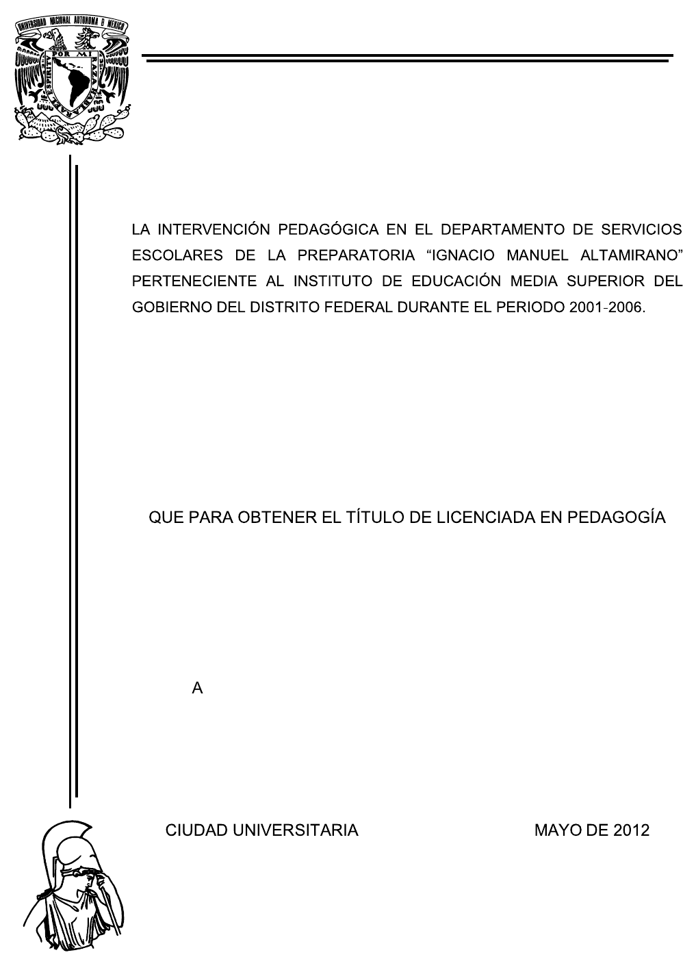 COLEGIO DE PEDAGOGÍA INFORME ACADÉMICO POR ACTIVIDAD PROFESIONAL PRESENTA: MARÍA TERESA RAMOS PELCASTRE ASESOR: DR. VÍCTOR FRANCISCO CABELLO BONILLA. UNIVERSIDAD NACIONAL AUTÓNOMA DE MÉXICO FACULTAD DE FILOSOFIA Y LETRAS UNAM – Dirección General de Bibliotecas Tesis Digitales Restricciones de uso DERECHOS RESERVADOS © PROHIBIDA SU REPRODUCCIÓN TOTAL O PARCIAL Todo el material contenido en esta tesis esta protegido por la Ley Federal del Derecho de Autor (LFDA) de los Estados Unidos Mexicanos (México). El uso de imágenes, fragmentos de videos, y demás material que sea objeto de protección de los derechos de autor, será exclusivamente para fines educativos e informativos y deberá citar la fuente donde la obtuvo mencionando el autor o autores. Cualquier uso distinto como el lucro, reproducción, edición o modificación, será perseguido y sancionado por el respectivo titular de los Derechos de Autor. Seminario de Tesis Dr. Víctor Francisco Cabello Bonilla. María Teresa Ramos Pelcastre. ENUNCIADO: Informe Académico de Actividad Profesional sobre la intervención pedagógica en el Departamento de Servicios Escolares de la Preparatoria “Ignacio Manuel Altamirano” perteneciente al Instituto de Educación Media Superior del Gobierno del Distrito Federal durante el periodo 2001-2006. OBJETIVO: Describir las tareas pedagógicas que desde el área de Servicios Escolares realiza el pedagogo dentro de un plantel de educación media superior y como la formación académica le permite actuar en el nuevo modelo del Gobierno del Distrito Federal. ÍNDICE. Introducción ........................................................................................................ 1 Siglas ................................................................................................................. 4 CAPÍTULO 1. BREVE HISTORIA DEL BACHILLERATO EN MÉXICO ............. 6 1.1 Escuela Nacional Preparatoria ..................................................................... 6 1.2 Opciones de educación media superior que se imparten en México actualmente ......................................................................................................................... 12 1.2.1 Bachillerato Bivalente .............................................................................. 19 1.2.2 Bachillerato General o Propedéutico ....................................................... 20 1.2.3 Preparatoria del Gobierno del Distrito Federal ........................................ 23 CAPÍTULO 2. PROPUESTA EDUCATIVA DEL SBGDF .................................. 26 2.1. Antecedentes del plantel “Iztapala 1” ........................................................ 28 2.2 Instituto de Educación Media Superior ....................................................... 38 2.2.1 Organigrama del Instituto de Educación Media superior ......................... 40 2.2.2 El Proyecto Educativo del Sistema de Bachillerato del Gobierno del Distrito Federal ............................................................................................................. 41 2.3 La Tutoría ................................................................................................... 42 CAPÍTULO 3 PLANTEL # 10 “IGNACIO MANUEL ALTAMIRANO” ................. 48 3.1 Ubicación e historia .................................................................................... 48 3.1.2 Organigrama del Plantel “Ignacio Manuel Altamirano” ............................ 53 3.1.3 Población estudiantil................................................................................ 55 3.1.4 Planta docente ........................................................................................ 57 3.2 Departamento de Servicios Escolares ....................................................... 60 3.2.1 Funciones ................................................................................................ 61 3.2.2 Descripción de tareas de asesoría pedagógica realizadas en el Departamento de Servicios Escolares ..................................................................................... 62 3.2.3 El trabajo con los alumnos ...................................................................... 63 3.2.4 El trabajo con los docentes ..................................................................... 65 3.2.5 El trabajo con los padres de familia ......................................................... 66 3.3 Valoración del trabajo desempeñado ......................................................... 68 Conclusiones .................................................................................................... 70 Fuentes consultadas ........................................................................................ 72 Anexos ............................................................................................................. 76 Dedicatorias A mi hermosa familia: Jesús Antonio, Jesús Eduardo y Dianita por el gran amor, el apoyo incondicional, el reconocimiento, la eterna motivación y por ser la luz de mi vida. A mi padre: por haberme formado y por haberme impulsado a luchar por mis sueños. A mi Paulis: por su infinito amor, apoyo y confianza en todo momento. A mis hermanos: Manuel y Graciela por su gran cariño y primeras enseñanzas. Javier, Miguel, Fernando y Héctor por su apoyo y gran ejemplo de perseverancia para conseguir el éxito a pesar de todos los obstáculos. A mis amigas, amigos, compañeros de trabajo y a todas las personas que han estado a mi lado y han influido en mí de manera positiva a lo largo de mi existencia para lograr que hoy concluya este ciclo tan importante en mi vida. Agradecimientos A Dios: Por permitirme lograr cada una de mis metas. A la Universidad Nacional Autónoma de México: Por haberme brindado el honor de estudiar en sus aulas, por haber desarrollado en mí una conciencia critica y poder llamarme orgullosamente universitaria. A la Facultad De Fil