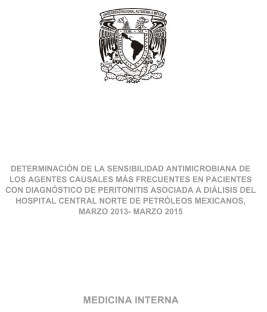 UNIVERSIDAD NACIONAL AUTÓNOMA DE MÉXICO FACULTAD DE MEDICINA DIVISIÓN DE ESTUDIOS DE POSGRADO HOSPITAL CENTRAL NORTE DE PETRÓLEOS MEXICANOS DETERMINACIÓN DE LA SENSIBILIDAD ANTIMICROBIANA DE LOS AGENTES CAUSALES MÁS FRECUENTES EN PACIENTES CON DIAGNÓSTICO DE PERITONITIS ASOCIADA A DIÁLISIS DEL HOSPITAL CENTRAL NORTE DE PETRÓLEOS MEXICANOS, MARZO 2013- MARZO 2015 TESIS DE POSGRADO PARA OBTENER EL DIPLOMA DE ESPECIALISTA EN: MEDICINA INTERNA PRESENTA ADRIANA PAULA MATAMOROS MEJÍA DIRECTOR DE TESIS DR. JOSÉ OSCAR TERÁN GONZÁLEZ ASESORES DE TESIS DRA. SHEILA PATRICIA VÁZQUEZ ARTEAGA DR. CÉSAR AUGUSTO URTIZ LÓPEZ DR. ABRAHAM EMILIO REYES JIMÉNEZ DR. LUIS JAVIER CASTRO D´FRANCHIS MÉXICO, D.F., NOVIEMBRE 2015 UNAM – Dirección General de Bibliotecas Tesis Digitales Restricciones de uso DERECHOS RESERVADOS © PROHIBIDA SU REPRODUCCIÓN TOTAL O PARCIAL Todo el material contenido en esta tesis esta protegido por la Ley Federal del Derecho de Autor (LFDA) de los Estados Unidos Mexicanos (México). El uso de imágenes, fragmentos de videos, y demás material que sea objeto de protección de los derechos de autor, será exclusivamente para fines educativos e informativos y deberá citar la fuente donde la obtuvo mencionando el autor o autores. Cualquier uso distinto como el lucro, reproducción, edición o modificación, será perseguido y sancionado por el respectivo titular de los Derechos de Autor. 2 DETERMINACIÓN DE LA SENSIBILIDAD ANTIMICROBIANA DE LOS AGENTES CAUSALES MÁS FRECUENTES EN PACIENTES CON DIAGNÓSTICO DE PERITONITIS ASOCIADA A DIÁLISIS DEL HOSPITAL CENTRAL NORTE DE PETRÓLEOS MEXICANOS, MARZO 2013- MARZO 2015 3 DEDICATORIA A DIOS Por llevarme por el camino indicado, siempre bajo tu Gracia. Camino ciegamente a tu lado. A MIS PADRES Emilio y Maru Por ser mis guías, mi apoyo incondicional y moral. Por brindarme su paciencia y amor siempre unidos. A MIS ABUELITOS Por que siempre se encuentran conmigo, gracias por haberme incitado a superarme y enseñarme a tratar a la gente con paciencia y cariño. A MI HERMANO Pablo Por ser único y de los pilares más importantes en mi vida. Por tu apoyo, hermandad y ejemplo. A MI FAMILIA Por el apoyo, comprensión y cariño que me han mostrado toda la vida. A MIS AMIGAS Cintia y Marielena Por la amistad de años, inseparables e inolvidables. A MIS MAESTROS Por llenarme de conocimientos, no solo médicos, sino de la vida. 4 AGRADECIMIENTOS Gracias a todas las personas que contribuyeron a mi formación y realización en el Hospital Central Norte, Dr. José Oscar Terán González, Dra. Sheila Patricia Vázquez Arteaga, Dr. Emilio Reyes Jiménez, Dr. Luis Javier Castro D´Franchis por ayudarme a lograr este objetivo final, aquellos que me brindaron información, consejos y su participación para hacer esto posible. Gracias a mis asesores de tesis, por orientarme, corregirme y darme su apoyo en todo momento. Al Dr. César Augusto Urtiz López por su paciencia, su confianza, enseñanzas y apoyo para lograr un mejor servicio de Diálisis. Al Dr. Francisco Javier Mijangos Huesca por sus enseñanzas y por brindarme su tiempo y apoyo para conseguir gran parte de la información de esta tesis. Al personal de laboratorio por apoyarme para conseguir la información pilar de esta tesis, y sobre todo por su amabilidad y disposición. A las enfermeras del servicio de Nefrología, en especial a la enfermera Norma Islas, gracias por brindarme tu tiempo, ayuda y amistad. Al Ing. Enrique de Jesús Ramos García por brindarme su sabiduría, enseñanzas y sobre todo por tu orientación, amistad y paciencia para lograr este objetivo más en mi vida. 5 Í N D I C E ÍNDICE DE ABREVIATURAS .......................................................................... I RESUMEN ...................................................................................................... 7 INTRODUCCIÓN ............................................................................................. 9 MARCO TEÓRICO ........................................................................................ 11 PLANTEAMIENTO DEL PROBLEMA .......................................................... 20 JUSTIFICACIÓN ............................................................................................ 21 HIPÓTESIS .................................................................................................... 22 OBJETIVOS ................................................................................................... 22 MATERIAL Y MÉTODOS .............................................................................. 23 Diseño del estudio ............................................................................... 23 Operacionalización de variables ......................................................... 24 Universo de trabajo y muestra ............................................................ 25 Instrumento de investigación .............................................................. 26 Desarrollo del proyecto ....................................................................... 27 Límite de tiempo y espacio ................................................................. 40 Cronograma ........................................................................................ 40 IMPLICACIONES ÉTICAS ............................................................................ 41 RESULTADOS Y DISCUSIÓN ...................................................................... 42 CONCLUSIÓN ............................................................................................... 47 RECOMENDACIONES .................................................................................. 49 BIBLIOGRAFÍA ............................................................................................. 51 ANEXOS ........................................................................................................ 53 6 ÍNDICE DE ABREVIATURAS UFC Unidades Forma