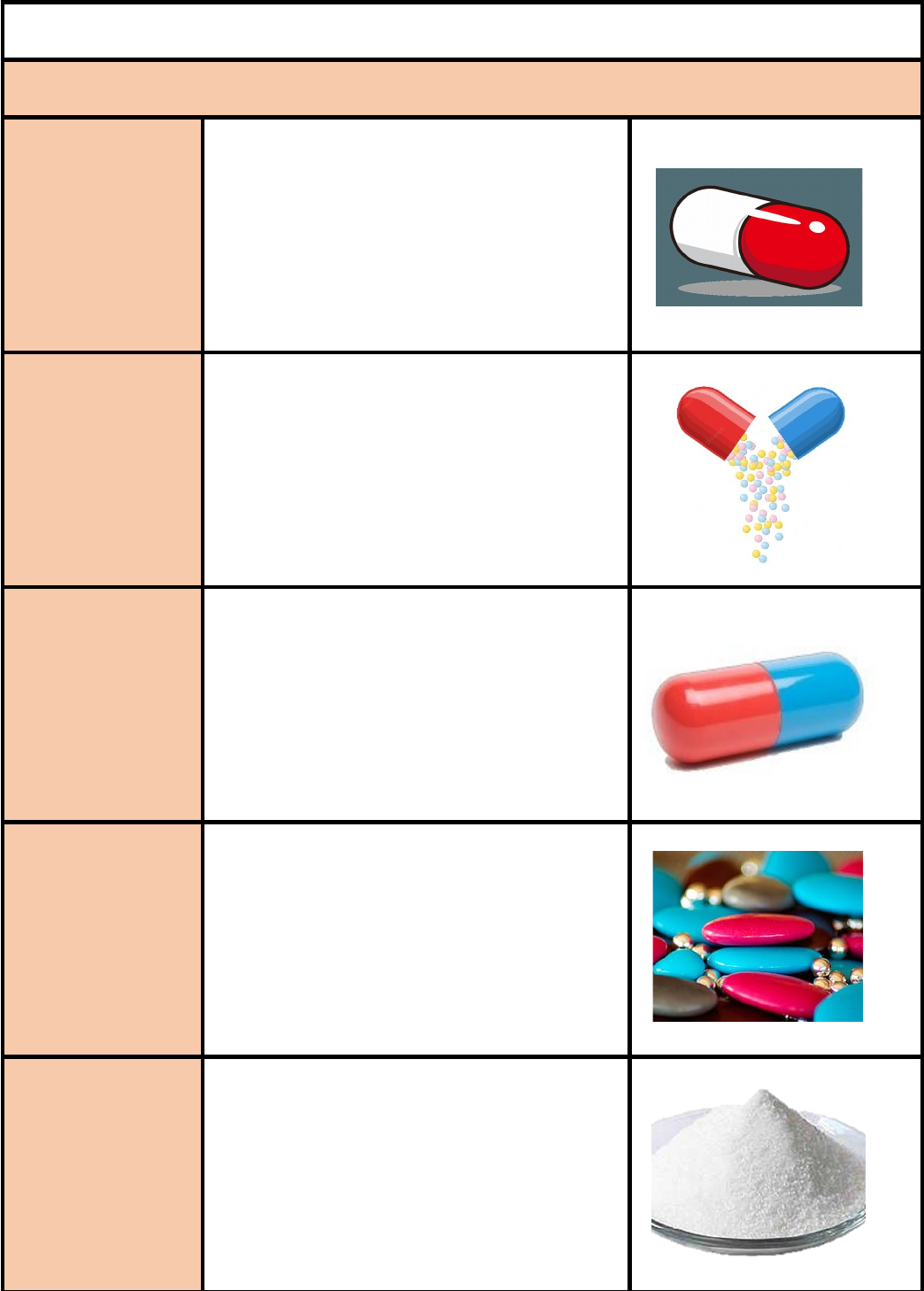 FORMAS MEDICAMENTOSAS SOLIDOS PILDORAS Forma farmacéutica sólida esférica y constituida por una masa elástica no adherente Oral GRANULADOS Preparaciones constituidas por agregados solidos y secos de partículas de polvo, suficientemente resistentes para permitir su manipulación. Oral CAPSULAS Son formas farmacéuticas sólidas que contienen el principio activo solo o acompañado por excipientes dentro de una cubierta soluble rígida o blanda. Los tamaños de las cápsulas se designan mediante escala numérica desde el N° 5, el más pequeño, al N° 000, que es el más grande GRAGEAS Comprimidos recubiertos con una capa que protege el medicamento y que facilita su paso por la garganta. Se caracterizan por sus bordes redondeados y su aspecto abrillantado. Oral POLVOS Productos solidos constituidos por una sustancia o mezcla homogénea de sustancias finamente divididos que pueden estar destinadas para uso interno (polvos orales) o externo (polvos tópicos). Oral y tópico SUPOSITORIOS Son cuerpos solidos de diversos tamaños y formas, adaptados para la introducción en el recto. Se deben ablandar o disolver a la temperatura corporal. Rectal o uretral COMPRIMIDOS Son formas farmacéuticas solidas que contienen uno o más principios activos generalmente acompañados por excipientes apropiados y se administran por diferentes vías. Oral y sublingual. OVULOS Formas farmacéuticas solidas o semirrígidas obtenidas por compresión o colado sobre moldes, para su aplicación en la vagina donde ejercen su acción. Vaginal SEMISOLIDOS CREMAS Contienen uno o varios principios activos y hasta un 80 % de agua. poseen una consistencia relativamente fluida, formulados ya sea como una emulsión agua en aceite o aceite en agua. Tópica, vaginal PASTAS Son pomadas que contienen una fuerte preparación de polvos insolubles en la base para aplicación cutánea. GELES Son sistemas semisólidos dispersos. Son de consistencia semirrígida, generalmente no tienen aceites grasos, destinados a aplicarse sobre las membranas mucosas, no tienen poder de penetración, por eso se utilizan para ejercer acción tópica. Tópica POMADAS Formas farmacéuticas para uso externo de consistencia semisólida que contiene hasta un 40 % de aguas obre una base grasa. Tópica, oftálmica, rectal. LIQUIDOS SOLUCIONES Preparados líquidos que contienen una o varias sustancias disueltas en un solvente o una mezcla apropiada de solventes miscibles entre sí. Inyectable, oral, tópica, ótica, nasal y oftálmica GOTAS Forma galénica para uso tópico consistente en un líquido acuoso u oleoso en el que van incorporados los principios activos. Oftálmica y ótica JARABES Líquido acuoso, en donde va el medicamento disuelto, con una concentración de azúcar a saturación. Oral SUSPENCIONES Es un preparado líquido, de aspecto turbio o lechoso, constituido por la dispersión de un sólido en un vehículo acuoso. Oral EMULSIONES Es un sistema de al menos dos fases, en el cual un líquido se dispersa en otro líquido en forma de glóbulos o gotas pequeñas. Oral e inyectable INYECCIONES Son formulaciones fluidas para ser administradas por vía parenteral. Parenteral: subcutánea e intravenosa LOCIONES Preparado líquido para aplicación externa sin fricción. Tópica LINIMENTO Preparación menos espesa que el ungüento en la cual entran como base aceites y bálsamos y se aplica exteriormente en fricciones. Tópica GASEOSAS AEROSOLES Son soluciones o dispersiones conteniendo principios activos que se envasan bajo presión y que se liberan con la activación de una válvula apropiada. Tópica, aplicación local en las vías aéreas superiores, la cavidad oral o los pulmones ESPUMAS Forma farmacéutica que consiste en una preparación semisólida, constituida por dos fases: una líquida que lleva el o los principios activos y aditivos, y otra gaseosa que lleva gas propulsor para que el producto salga en forma de nube. Tópica