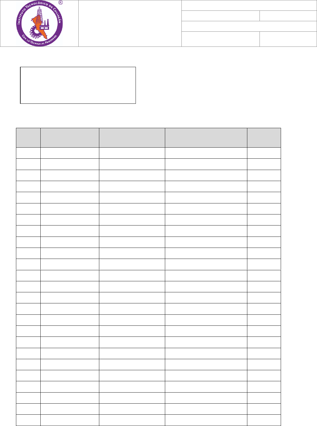 Lista de aspirantes para el curso propedéutico. Responsable: Jefe(a) de Servicios Escolares Código: SIG-CA-F-03-01 Página: 1 de 2 Revisión: 1 Emisión: Marzo de 2020 VER 1 Formato: Lista De Aspirantes Aceptados ELABORÓ D.M.G/ 04-03-2020 REVISÓ J.L.L.V./ 05-03-2020 AUTORIZÓ N.S.E.U./ 06-03-2020 Página 1 de 2 LISTA DE ASPIRANTES PARA EL CURSO PROPEDÉUTICO INSTITUTO TECNOLÓGICO DE CULIACÁN CARRERA: INGENIERÍA EN SISTEMAS COMPUTACIONALES No. Apellido Paterno Apellido Materno Nombre No. de Ficha 1 ALARCON GUTIERREZ JAVIER ANTONIO 110069 2 ALMENDRA CORONADO ALEJANDRO 110052 3 AMADOR BARRAZA ANGEL ISAIAS 110047 4 ARMENTA LOPEZ JESUS ALBERTO 110053 5 BRITO MOLINA OMAR 110062 6 BURGOS MACHADO MIGUEL ALEXIS 110058 7 CASTAÑEDA RAMIREZ JOSE REY 110071 8 CASTRO GASTELUM MARTIN IVAN 110066 9 CASTRO VEGA ALONSO 110041 10 CIBRIAN ROBLES JOSE ALONSO 110060 11 CORRALES PENA KARELI 110056 12 DIARTE CAMBEROS JESUS EDUARDO 110061 13 ELENES TERRAZAS CESAR IMANOL 110064 14 ESPINDOLA LEYVA JOSE ENRIQUE 110042 15 FELIX CASTRO EINAR ABEL 110063 16 GUTIERREZ CHAVEZ DENZEL ARTURO 110077 17 LANDEROS SALAZAR SALOME 110044 18 LANGARICA ORNELAS JESUS OMAR 110040 19 LEYVA CASTRO GERSON RAFAEL 110075 20 LOPEZ VERDUZCO TERESA ALEJANDRA 110045 21 MACHADO VALENZUELA EDWIN IVAN 110068 22 MEDINA VALDEZ ANDRES 110051 23 MEZA QUINONEZ CESAR IVAN 110046 24 MONTOYA VAZQUEZ KARIM HUMBERTO 110054 25 MURILLO ARAIZA JAVIER URIEL 110043 Fecha: 4 al 29 de julio de 2022 Horario: 8:00 a.m. – 10:00 a.m. GRUPO 2 Lista de aspirantes para el curso propedéutico. Responsable: Jefe(a) de Servicios Escolares Código: SIG-CA-F-03-01 Página: 2 de 2 Revisión: 1 Emisión: Marzo de 2020 VER 1 Formato: Lista De Aspirantes Aceptados ELABORÓ D.M.G/ 04-03-2020 REVISÓ J.L.L.V./ 05-03-2020 AUTORIZÓ N.S.E.U./ 06-03-2020 Página 2 de 2 26 OCHOA ALVAREZ ANDRES 110070 27 OLIVARRIA GARCIA LUIS FERNANDO 110059 28 ONTIVEROS SANCHEZ JESUS DANIEL 110073 29 ONTIVEROS TORRES EDUARDO 110057 30 PENA MEDINA MARCO ANTONIO 110065 31 PEREDA HERNANDEZ JESUS TOMAS 110074 32 PULIDO ARMENTA BRIAN ARTURO 110072 33 RAMIREZ ORTEGA JUAN DIEGO 110067 34 RAMOS VILLA IGNACIO 110050 35 RIVAS FLORES LUIS BRAYAN 110039 36 RODRIGUEZ ALEMAN JOSE MANUEL 110048 37 RUBIO FELIX KAYRA SOFIA 110049 38 SANCHEZ RAMIREZ LUIS DANIEL 110078 39 VERDUGO VARELA CESAR ENRIQUE 110055 40 ZAVALA BARREDA MARCOS ISAAC 110076 Nombre Firma Fecha Elaboró Lic. Dinorah Meza García Autorizó M.C. David Noriega Urquídez c.c.p. Departamento de Servicios Escolares.