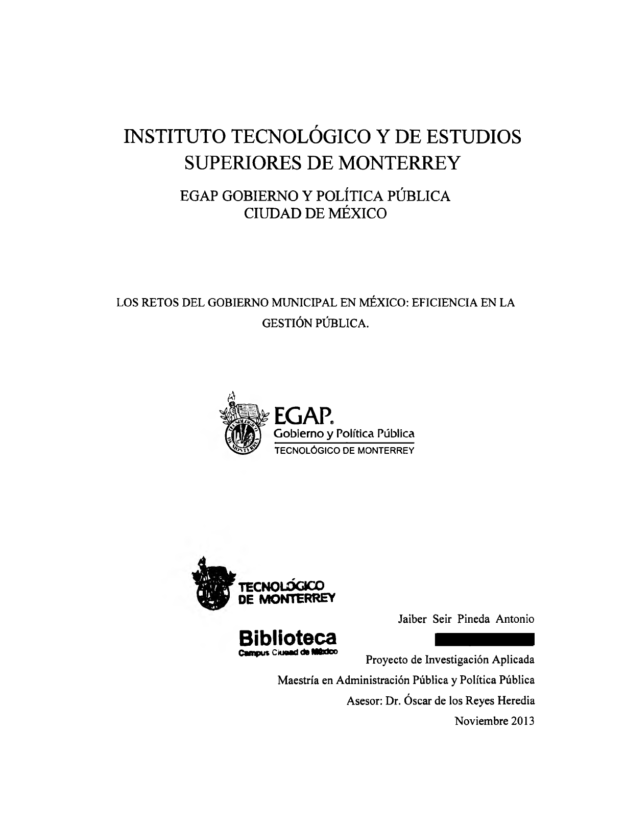 INSTITUTO TECNOLÓGICO Y DE ESTUDIOS SUPERIORES DE MONTERREY EGAP GOBIERNO Y POLÍTICA PÚBLICA CIUDAD DE MÉXICO LOS RETOS DEL GOBIERNO MUNICIPAL EN MÉXICO: EFICIENCIA EN LA GESTIÓN PÚBLICA. ~hEGAP® Gobierno y Política Pública TECNOLÓGICO DE MONTERREY Jt. TKNOI..OOCO • DE MONTERREY Biblioteca ~ CiUeaddl Mlxlco Jaiber Seir Pineda Antonio Proyecto de Investigación Aplicada Maestría en Administración Pública y Política Pública Asesor: Dr. Óscar de los Reyes Heredia Noviembre 2013 Resumen ejecutivo El presente trabajo surge de la inquietud por demostrar el principal problema que presentan los municipios en la actualidad: la falta de una gestión eficiente eón estructuras profesionalizadas, lo cual reduce la posibilidad de contar con ayuntamientos que ofrezcan a la ciudadanía calidad, transparencia y eficacia en la provisión de bienes y servicios públicos. Para contribuir al desarrollo social y humano de México, resulta imprescindible que los gobiernos municipales estén mejor preparados frente a los retos que representan los distintos cambios que se originan en el ámbito nacional e internacional y que impactan, de algún modo u otro, a la esfera local. Por tal motivo, se presenta en este documento una investigación que recoge las experiencias de seis Presidentes municipales de la región del Istmo de Tehuantepec, del Estado de Oaxaca, a partir de las cuales se detectaron algunas debilidades que no permiten una eficiente gestión de gobierno. Asimismo, se revisa la bibliografía especializada que servirá como sustento teórico a esta investigación y que permita proponer algunas acciones estratégicas de mejora. A partir de la información recabada, se realizan algunas propuestas que quedarán a disposición de los gobiernos locales para generar mejores condiciones de eficiencia en el gobierno municipal. En primer término, un modelo de gobierno a disposición de los ayuntamientos para generar mejores condiciones de gestión pública a partir de la gestión estratégica municipal. Junto a las propuestas antes mencionadas se distinguen también la Agenda local incluyente y corresponsabilidad social, Transparencia municipal como quehacer de un gobierno abierto y responsable y la Oficina ciudadana de control y vigilancia para que el ciudadano cuente con una herramienta para conocer qué está haciendo su gobierno y haga público los documentos generados al interior. Finalmente, la generación de Gobiernos municipales en red a través de la creación del Foro Intermunicipal y de Cooperación para el Desa"ollo local (FICDEL) y el Laboratorio de Innovación Municipal. Agradecimientos y reconocimientos. A mis amados padres, Lucelia Antonio y Delfina Pineda, los seres más valiosos con quienes siempre he contado al momento de emprender cualquier proyecto de vida. Gracias padres, su apoyo para mí ha sido fundamental para terminar con éxito este logro profesional. Les debo más que la vida, mi gratitud hacia ustedes no tiene fin. Un especial reconocimiento merece el Programa de Becas para Indígenas (PROBEPI) que a través del Centro de Investigación y Estudios Superiores en Antropología Social (CIESAS) me hizo merecedor de la beca que, de manera conjunta con el Concejo Nacional de Ciencia y Tecnología (CONACYT), me permitió estudiar un posgrado de alto nivel. Quedo eternamente agradecido con esta valiosísima oportunidad que me han otorgado para seguirme formando y preparando. Éste valioso aporte que me han dado me hace reafirmar mi compromiso social y humanista en favor de mi país y de estas instituciones que ya forman parte de mí. A mis queridos hermanos, William y Karen, con quienes he compartido parte de mi vida y mi tiempo y que, pese a la distancia física, han permanecido siempre conmigo. Nuestros lazos de hermandad, unión y fortaleza nos mantendrán siempre juntos. A todas las personas que me brindaron su apoyo, en especial al grupo CIESAS-PROBEPI integrado por María Antonieta Gallard, Marina Cadaval, Blanca Ceballos, Michel y Karla, son parte de este logro que hoy veo materializado. Al Doctor Óscar de los Reyes Heredia, por su valioso acompañamiento y asesoramiento durante el tiempo que trascurrió la redacción de esta tesis. Su compromiso y sus conocimientos fueron determinantes para concluir este proyecto. A cada uno de los Presidentes municipales entrevistados. ~- s~ ~e<A, 9'w.aa ~ 0.u.ao ~ ~ ÍNDICE INTRODUCCIÓN------------------------------- 4 l. EL MUNICIPIO EN MÉXICO: ORIGEN Y DESARROLLO 1.1 Origen del municipio en México --------------------------------- 10 1.2 Reformas municipales ------------- 19 1.3 Funciones y atribuciones de los Ayuntamientos ------- ------- 24 1.4 Cambios y transformaciones del municipio: 1983-1999 -- 27 2. LOS RETOS DEL GOBIERNO MUNICIPAL: DIAGNÓSTICO DEL PROBLEMA 2.1 Diagnóstico de las deficiencias en el Ayuntamiento municipal ------------ 29 2.2 Profesionalización del Ayuntamiento municipal ---------- 38 2.3 Eficiencia gubernamental municipal 41 2.4 Gobernanza municipal 48 3. EFICIENCIA EN EL GOBIERNO MUNICIPAL: GESTIÓN ESTRATÉGICA MUNICIPAL 3.1 Gestión estratégica municipal y Cabildo competitivo------- 52 3.2 Agenda local incluyente y corresponsabilidad social ----- 61 3.3 Transparencia en el gobierno municipal --------------- 65 3.4 Foro Intermunicipal y de Cooperación para el Desarrollo Local 68 3.5 Laboratorio de Innovación Municipal -- 74 CONCLUSIONES--------------------- 82 BIBLIOGRAFÍA---------------------------- 89 ANEXOS----·------------------------- 91 INTRODUCCIÓN En México todas las personas son habitantes de algún municipio (salvo los casos de los ciudadanos del Distrito Federal), éste es el espacio donde llevan a cabo todas su actividades cotidianas, donde socializan, donde trabajan, donde se congregan, donde aprenden a tener un sentido de origen y de pertenencia, donde se ciudadanizan y donde se percibe que lo colectivo y lo público les pertenece y, por lo tanto, donde nace el interés p