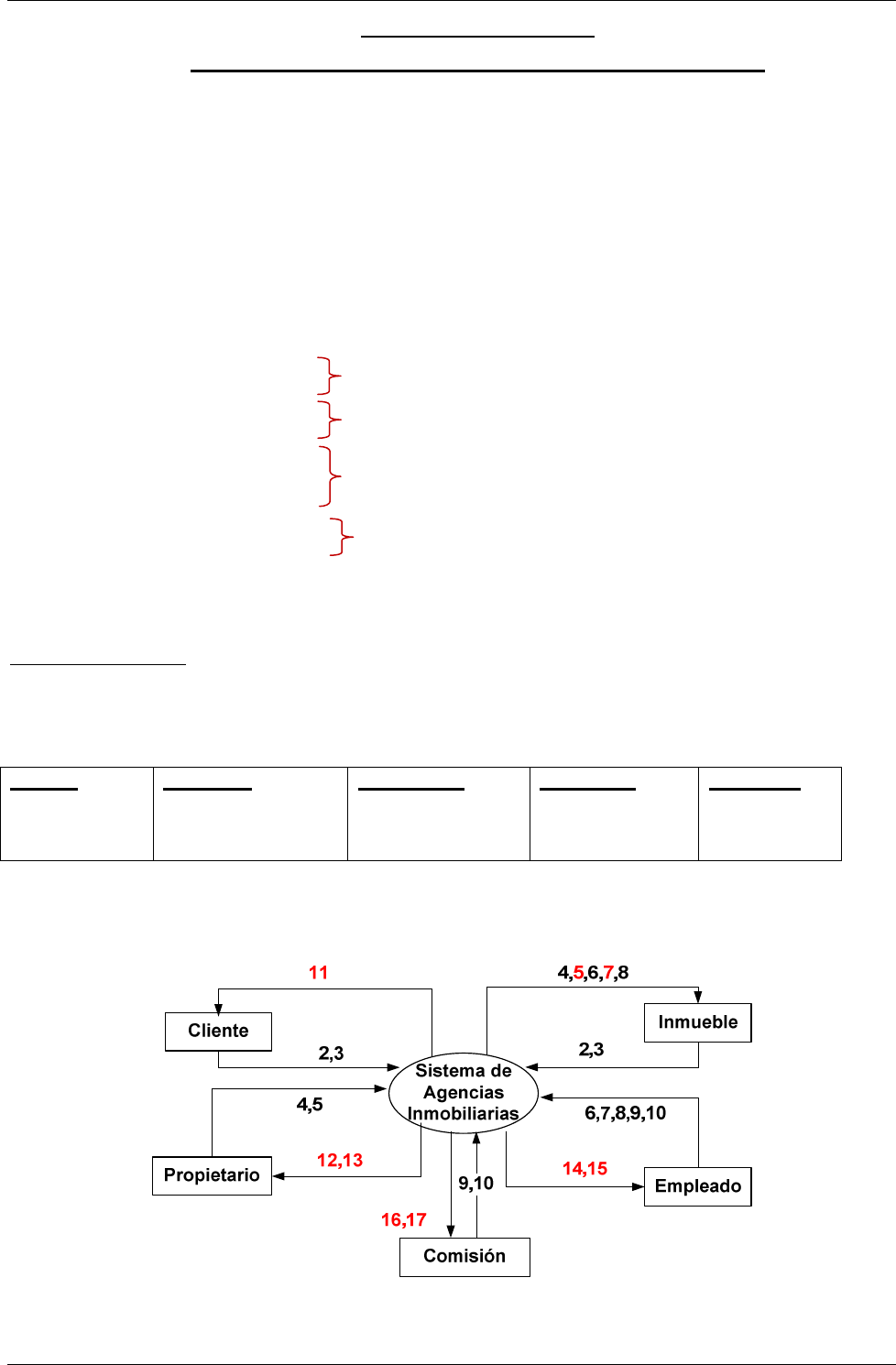 Cátedra: Base de Datos – Facultad de Ingeniería - UNJU Ejemplo de cátedra – 2016 1 BASE DE DATOS – 2016 EJEMPLO DE RESOLUCION DE MODELIZACIÓN DE DATOS 1) Sobre la siguiente narrativa aplique los pasos del Modelo de Entidad Relacional Extendido (MERE) Una agencia inmobiliaria desea sistematizar su información referida a venta de inmuebles. Los clientes solicitan adquirir inmuebles y un inmueble puede ser demandado por varios clientes. Un propietario oferta uno o varios inmuebles. un empleado realiza la venta de uno o muchos inmuebles y un inmueble solamente puede ser vendido por un empleado. Empleado cobra comisiones por venta de inmuebles y una comisión puede ser asignada a varios empleados. II) Listado de eventos 1. AgenciaInmobiliaria sistematiza información 2. Cliente solicita inmuebles 3. Inmueble demandado clientes 4. propietario oferta inmueble 5. propietario oferta inmuebles 6. empleado vende inmueble 7. empleado vende inmuebles 8. inmueble vendido empleado 9. empleado cobra comisiones 10. comisión asignada empleados 11. Cliente cambia AgenciaInmobiliaria 12. AgenciaInmobiliaria inscribe propietario 13. Propietario deja AgenciaInmobiliaria 14. Empleado es contratado 15. Empleado es despedido 16. Comisión es abonada 17. Comisión es anulada III) Entidades candidatas AgenciaInmobiliaria - cliente - inmueble – propietario - empleado - comisión IV) Ciclo de vida Cliente Alta: 2 Vida: 3 Baja: 11 Inmueble Alta: 5 Vida: 2,3,4,6,9 Baja: 7 Propietario Alta: 12 Vida: 4,5 Baja: 13 Empleado Alta: 14 Vida: 6,7,8,9,10 Baja: 15 Comisión Alta: 16 Vida: 9,10 Baja: 17 V) Diagrama de contexto N a N 1 a N 1 a N N a N Cátedra: Base de Datos – Facultad de Ingeniería - UNJU Ejemplo de cátedra – 2016 2 VI) DER individual VII) DER global VIII) Diagrama de Martin Cátedra: Base de Datos – Facultad de Ingeniería - UNJU Ejemplo de cátedra – 2016 3 IX) Diccionario de Datos Inmueble @ Cod_Inmueble integer + Descripción char (30) + Ubicación char (20) Cliente @ Cuil_Cliente char (12) + Apellido y Nombre char (30) + Domicilio char (20) Propietario @ Cuil_propietario char (12) + Apellido y Nombre char (30) Domicilio char (20) Empleado @ Legajo integer + Nombre char (30) + Domicilio char (30) Comisión @ Nº Comisión integer + Fecha date + importe real X) Modelo Relacional
