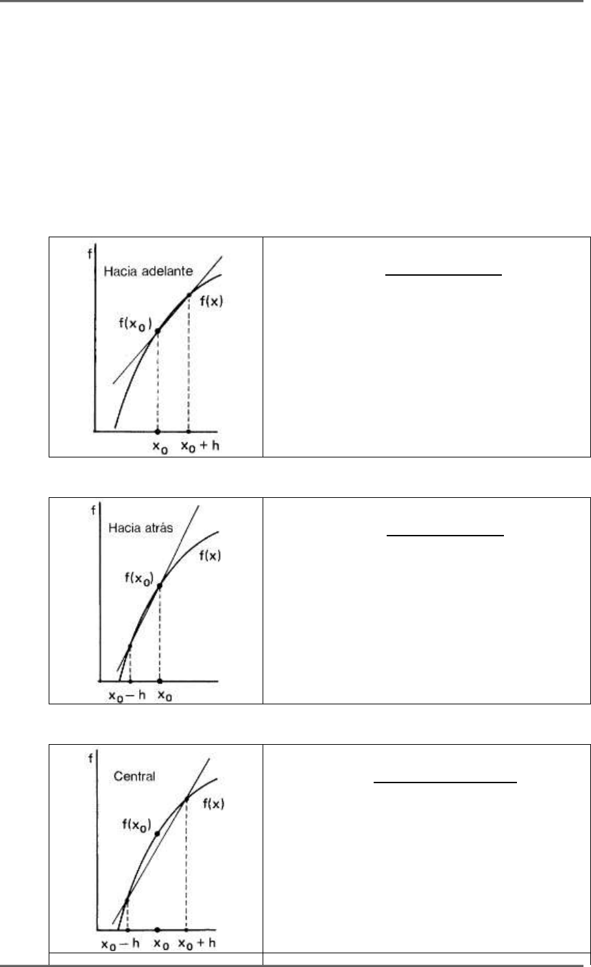Cálculo Numérico (Ing Informática, Ing Minas, Lic Sistemas) Facultad de Ingeniería - UNJu Mtr Ing Ariel Alejandro Vega 1 DERIVACION NUMERICA Existen casos en los cuales es necesario obtener la derivada en un punto de una función que puede ser desconocida o de una alta complejidad (respecto del proceso de derivación). En tales casos si se posee una serie de datos generalmente obtenidos de formas experimental se puede aproximar la derivada. La aproximación de una derivada de ( ) se puede obtener mediante el gradiente de la interpolación lineal si se conocen los valores de , donde es el tamaño del intervalo entre dos puntos consecutivos en el eje . Este tipo de aproximaciones se denominan Aproximación por Diferencias Finitas, existiendo tres tipos de formas de aplicación. 1. Aproximación por Diferencias Finitas hacia adelante o progresiva La fórmula es la siguiente ( ) ( ) ( ) ( ) La cual se recomienda para hallar la derivada cuando ( ( )) es el punto inicial de la curva. 2. Aproximación por Diferencias Finitas hacia atrás o regresiva La fórmula es la siguiente ( ) ( ) ( ) ( ) La cual se recomienda para hallar la derivada cuando ( ( )) es el punto final de la curva 3. Aproximación por Diferencias Finitas centrales La fórmula es la siguiente ( ) ( ) ( ) ( ) La cual se recomienda para hallar la derivada cuando ( ( )) es un punto central de la curva Cálculo Numérico (Ing Informática, Ing Minas, Lic Sistemas) Facultad de Ingeniería - UNJu Mtr Ing Ariel Alejandro Vega 2 Enfoque por Desarrollo de Taylor Formulas con dos nodos de un polinomio de Interpolación Las aproximaciones por diferencias finitas expresadas en el apartado anterior no acotan el error cometido. Cuando una función se representa numéricamente en puntos discretos, ésta se aproxima mediante la interpolación. Así, se pueden obtener fórmulas de diferenciación numérica al diferenciar las fórmulas de interpolación. Comenzaremos obteniendo fórmulas mediante el desarrollo de Taylor, ya que es equivalente a la diferenciación de una interpolación y conduce exactamente a los mismos resultados. Esto es, mediante artificios algebraicos sobre la serie de Taylor se pueden obtener fórmulas para aproximar algunas derivadas. Si definimos la siguiente nomenclatura ( ) ( ) ( ) Entonces el desarrollo de Taylor de alrededor de es Despejando Si se trunca después del primer término en este desarrollo se obtendrá la aproximación por diferencias finitas hacia adelante (1) en conjunto con su error de truncamiento. Esto se puede expresar como ( ) Donde ( ) Que indica que el error es proporcional al intervalo de la retícula, y la derivada segunda De manera similar se puede obtener la fórmula de diferencias finitas hacia atrás (2); con el desarrollo de Taylor de alrededor de se tiene que Despejando ( ) Donde ( ) Las aproximaciones por diferencias finitas hacia adelante y atrás de la primera derivada que se obtienen usando tres términos de la serie de Taylor se denominan fórmulas de Primer Orden pues el error de truncamiento es O(h) Mientras que la aproximación por diferencias finitas centrales (3) usando y se puede obtener restando a la serie Cálculo Numérico (Ing Informática, Ing Minas, Lic Sistemas) Facultad de Ingeniería - UNJu Mtr Ing Ariel Alejandro Vega 3 obteniéndose Donde el término se elimina de forma automática. Entonces despejando ( ) Donde ( ) Es importante observar que, debido a la cancelación del término , el error de la aproximación por diferencias finitas centrales es proporcional a en vez de h. Al decrecer h, el error decrece más rápido que en las otras dos aproximaciones. La razón por la cual esta fórmula genera un error menor radica en que usa 4 términos de la Serie de Taylor y se denomina Fórmula de Segundo Orden para hallar la derivada primera porque su error de truncamiento es ( ) Pregunta: ¿Reducir el valor de h reducirá el error de la aproximación? Planteo de la respuesta: Si c es el punto del que se quiere obtener la derivada primera de una función f que se supone derivable y pudiéramos hacer que h sea cada vez más pequeño se esperaría el siguiente comportamiento: El cual indica que si se aplica la diferencia finita progresiva con h tendiendo a cero se obtendría una mejor aproximación a la derivada exacta. Similar planteo se podría realizar para la las diferencias finitas regresiva y centrales. Para demostrar esta suposición la función real a utilizar será y se calculará ( ) el cual obtenida de manera analítica es 5,4356365918091. Además cada vez que se actualice un nuevo valor de h esté se dividirá por 10. El programa en Scilab que calcula el valor de la derivada usando la fórmula de diferencias finitas progresiva es el siguiente: Cálculo Numérico (Ing Informática, Ing Minas, Lic Sistemas) Facultad de Ingeniería - UNJu Mtr Ing Ariel Alejandro Vega 4 El cual produce la siguiente salida Observe que inicialmente al reducir el valor de h se genera una aproximación mejor, esto es coincidente con la definición de Derivada. Sin embargo en un momento dado el error empieza a incrementarse. Disminuir el valor de h provoca una reducción en el error de truncamiento, pero propaga el error de redondeo, el cual depende de la máquina, por lo tanto no es posible evitarlo. El error de redondeo se genera por la imprecisión en los cálculos aritméticos o a la limitada capacidad de representación de los dispositivos de memoria para almacenamiento de números reales y por lo tanto puede crecer ilimitadamente anulando la precisión que se obtiene al reducir el error de truncamiento. Cálculo Numérico (Ing Informática, Ing Minas, Lic Sistemas) Facultad de Ingeniería - UNJu Mtr Ing Ariel Alejandro Vega 5 Formulas con tres nodos de un polinomio de Interpolación Las aproximaciones por diferencias finitas obtenidas hasta ahora utilizan dos nodos del polinomio de interpolación. Para mejorar su exactitud se intentó disminuir h lo cual no asegura una mejora debido 