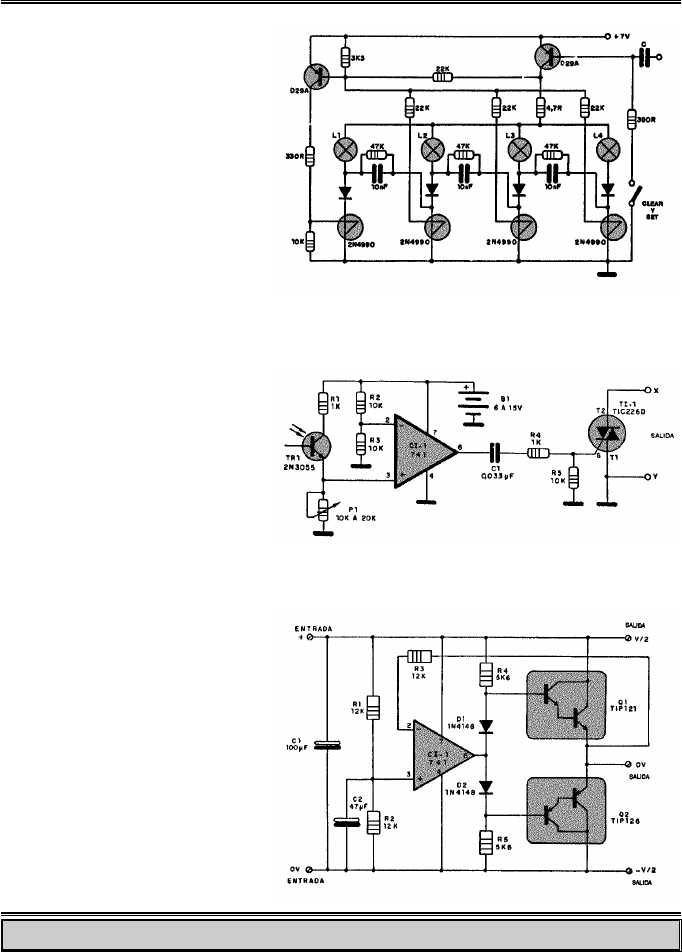 MM O N TO N T A J E SA J E S D ED E EE L E C T R O N I C AL E C T R O N I C A CONTADOR EN ANILLO Se trata de un circuito secuencial para lámparas incandescentes de baja ten- sión que puede ser empleado como elemento decorativo o instrumento (las lámparas serían Leds). FLASH SECUNDARIO Empleando un 2N3055, al cual se le quita la carcaza, como fototransistor, construimos una unidad de disparo de un flash secundario. La alimentación se hace con tensiones entre 6 y 15V. FUENTE SIMETRICA Para alimentar circuitos con amplifica- dores operacionales así como también para muchas otras aplicaciones, se emplea una fuente partida. Para quie- nes tienen una fuente simple, con este sencillo circuito es posible construir una fuente simétrica de hasta 20V Circuitos Electrónicos 5 1 MM O N TO N T A J E SA J E S D ED E EE L E C T R O N I C AL E C T R O N I C A 2 Circuitos Electrónicos 5 RECEPTOR DE BANDA CIUDADANA El circuito es un receptor que opera en la banda de los 27MHz. Los bobinados L2 y L3, se efectúan sobre una forma idéntica a las utiliza- das para construir bobinas de F.I. co- merciales. Primero se devana el amo- blamiento primario (L3) que consiste en tres vueltas de alambre de 0,25 mm. de diámetro, posteriormente se arrolla L2 que consiste en 3,5 + 4 vueltas de alambre de 0,25 mm de diámetro. El transformador así forma- do debe incluir un núcleo de ferrite. Los transformadores T2 y T3 se cons- truyen de idéntica forma, siendo el de- talle de los bobinados los siguientes: L4 = 9 vueltas de alambre 0,25 mm. de diámetro. L5 = 1,5 vueltas de alambre 0,25 mm de diámetro. L6 = 158 vueltas de alambre 0,08 mm de diámetro. L7 = 32 vueltas de alambre 0,08 mm de diámetro. ELEVADOR DE OCTAVA Se trata de un efecto de sonido que au- menta la tonalidad de la voz o de un instrumento musical. P1 y P2 permiten ajustar la profundi- dad de la actuación y deben ser logarít- micos. TIMMER MULTIPROPOSITO Se trata de un circuito básico monoestable, cuya período puede calcularse como: T = 1,1 . R . C MM O N TO N T A J E SA J E S D ED E EE L E C T R O N I C AL E C T R O N I C A GENERADOR PARA AJUSTE DE FI Construimos un instrumento sencillo pero eficaz que puede ser empleado para la calibración de los receptores de AM. Emplea compuertas TTL y no precisa ajuste para su funcionamiento. La salida presenta una señal de 455kHz modulada en tono. BOOSTER DE GRAVES DE 48W Con un solo integrado es posible construir un refuerzo de graves (para señales por debajo de los 200Hz) del orden de los 48W. C1 = C2 = 105/fc donde fc es la frecuencia de corte del filtro de nuestro booster. Se co- necta entre la salida del amplificador y los par- lantes. MEDIDOR DE INTENSIDAD DE CAMPO Este circuito puede servir para verificar el funcionamiento de pequeños trans- misores de radio. Indica la presencia de ondas de radio cuya frecuencias estén comprendidas entre 100kHz y 100MHz. La indicación se da en un simple microamperímetro de 200µA a fondo de escala. Circuitos Electrónicos 5 3 MM O N TO N T A J E SA J E S D ED E EE L E C T R O N I C AL E C T R O N I C A 4 Circuitos Electrónicos 5 CONTROL TERMICO PARA ESTUFAS El circuito que proponemos posibilita el control térmico de cualquier ambiente, man- tendrá la temperatura en una determinada banda de val- ores ajustables por medio de P1 y P2. Q1 puede ser un transistor de germanio del tipo 2SA49 o cualquier otro. También puede emplearse un NTC común. SENCILLO CARGADOR DE BATERIAS DE AUTO Este circuito es una solución para car- gar una batería de auto en forma “manual”. En la posición R1 la carga es rápida mientras que en la posición R2 la carga es lenta y se preserva mejor el acumulador. FUENTES CON REGULADORES INTEGRADOS La figura muestra la disposición en que deben conectarse dos regu- ladores de tensión integrados de tres terminales para obtener sendas fuentes de 6V y 12V respectivamente. La regulación de estos componentes suele ser muy buena. MM O N TO N T A J E SA J E S D ED E EE L E C T R O N I C AL E C T R O N I C A AMPLIFICADOR PARA 250MHZ Se trata de un amplificador de 25W que puede emplearse en transmisores en la banda de los 450MHZ. Las bobinas se construyen: CH1: Choque de RF que se construye bobinando 12 espiras de alambre Nº 28 sobre una resistencia de 120kΩ. CH2: Idem CH1 CH3: Choque de RF que se construye bobinando 12 espiras de alambre Nº 18 sobre una forma de 1/2" con una longitud de 3/8". Las terminales deben tener un largo de 1/2" CH4: Choque de RF que se construye bobinando 9 espiras de alambre Nº 28 sobre una resistencia de 120 KW x 1/4 watt L1=L2= Bobinas que se construyen devanando 2,5 espiras de alambre Nº 18 sobre una forma de 3/16" de diámetro con una longitud del arrollamiento de 3/8". Los terminales deben tener un largo de 1/8" L3 = Bobina que se construye devanando 2 espiras de alambre Nº 18 sobre una forma de 3/16" de diámetro con una longitud del arrollamiento de 3/8" Los terminales deben tener un largo de 1/8" Los trimmers de ajuste de los filtros del amplificadoor se eligen de la siguiente manera: C1=C2=C3=C4=C5=C6=C7= capacidad va- riable entre 1pF y 8 pF C8=C9= capacidad variable entre 0,5 pF y 2 pF CONTROL DE VELOCIDAD El circuito representa un sencillo con- trol de velocidad para micromotores de corriente continua de los empleados en radio control. Se pueden regular motores de hasta 800mA de corriente. OSCILADOR DE ALTA FRECUENCIA Se trata de un sencillo transmisor para prácticas telegráficas (de alta frecuen- cia). L1 es una bobina de antena (con ferrite) de las empleadas en los radios a transistores de AM de ondas me- dias. Circuitos Electrónicos 5 5 MM O N TO N T A J E SA J E S D ED E EE L E C T R O N I C AL E C T R O N I C A 6 Circuitos Electrónicos 5 AMPLIFICADOR DE AUDIO Se trata de un ampli- ficador universal de salida que puede ser empleado con cual- quiera de los pream- plificadores publica- dos en este mismo libro. Los transistores Darlington son comu- nes y pueden conse- guirse en cualqui