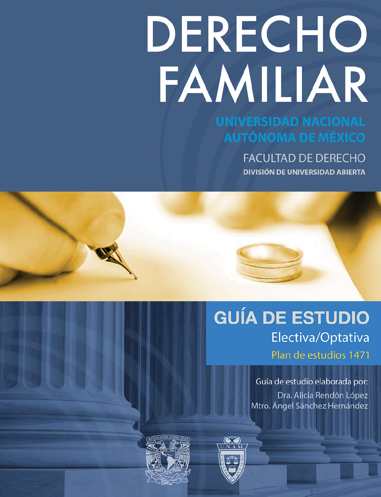 División de Universidad Abierta Guía de estudio para la asignatura Derecho Familiar 1 FACULTAD DE DERECHO DERECHO FAMILIAR SEXTO SEMESTRE Datos curriculares: Ø Nombre de la asignatura: Derecho Familiar Ø Ciclo: Licenciatura Ø Plan de estudios: 1471 Ø Carácter: Obligatoria Ø Créditos: 8 Ø Asignatura precedente: Contratos Civiles Ø Asignatura subsecuente: Derecho Sucesorio Características de los destinatarios: Estudiantes de la licenciatura en Derecho que estén cursando el sexto semestre y hayan acreditado la asignatura precedente: Contratos Civiles. Criterios de acreditación: Examen final 100% Duración (horas): 64 horas Elaboradores de la guía: Dra. Alicia Rendón López Mtro. Ángel Sánchez Hernández Objetivo general: Conceptualizar las bases teóricas del Derecho Familiar para considerarlas como instituciones de orden público e interés social y garantizar la plena aplicación de las disposiciones jurídicas que atienden a la familia, con el fin de asegurar su protección y regulación para aplicar la normatividad vigente con justicia y respeto a la seguridad jurídica. División de Universidad Abierta Guía de estudio para la asignatura Derecho Familiar 2 Índice temático Unidad 1. Introducción al Estudio de Derecho familiar. 1.1. Concepto 1.1.1. Elementos 1.1.2. Instituciones 1.2. Trascendencia del estudio de la historia del derecho familiar mexicano 1.3. El concepto de familia en sus diversas acepciones 1.3.1. Etimológica 1.3.2. Sociológica 1.3.3. Gramatical 1.3.4. Jurídica 1.4. Fines y principios aplicables en derecho familiar 1.4.1. Orden público 1.4.2. Interés social Unidad 2. Ubicación del Derecho Familiar dentro de la Sistemática Jurídica. 2.1 Teoría de Antonio Cicu. 2.2 Teoría de Roberto de Ruggiero. 2.3 Tesis de Julien Bonnecase. 2.4 Tesis de Julián Gûitrón Fuentevilla. Unidad 3. Autonomía del Derecho Familiar. 3.1. Tesis de Guillermo Cabanellas de Torres 3.1.1. Diferencia entre derecho social y derecho laboral 3.2. Teoría de Julián Güitrón Fuentevilla 3.3. Tesis de José Barroso Figueroa 3.4. Aplicación de los criterios para fundamentar la autonomía del derecho familiar 3.4.1. Legislativo 3.4.2. Jurisdiccional 3.4.3. Didáctico 3.4.4. Científico 3.4.5. Institucional Unidad 4. El Parentesco. 4.1. El estado familiar 4.2. Concepto de parentesco 4.3. Fuentes del parentesco 4.4. Clases de parentesco 4.4.1. Consanguíneo 4.4.2. Por afinidad 4.4.3. Civil 4.4.4. Efectos de cada una de las clases de parentesco 4.5. Conceptos de grado, línea, tronco y rama División de Universidad Abierta Guía de estudio para la asignatura Derecho Familiar 3 4.6. Cómputo del parentesco Unidad 5. Los alimentos. 5.1. Concepto jurídico de alimentos 5.2. Evolución histórica de la obligación alimentaria 5.3. Características de la obligación alimentaria 5.4. Contenido de los alimentos atendiendo a la índole de la persona que va a recibirlos 5.4.1. Menores de edad 5.4.2. Personas con discapacidad 5.4.3. Interdictos 5.4.4. Senectos 5.4.5. Personas que gozan de la presunción de necesitarlos 5.5. Forma de pago, aseguramiento y personas legitimadas para solicitar los alimentos 5.6. Suspensión y extinción de la obligación de proporcionar alimentos 5.7. La mora en el cumplimiento de la obligación alimentaria y quiénes incurren en ella 5.8. El registro de deudores alimentarios morosos 5.8.1. Contenido del certificado de inscripción 5.8.2. Supuestos en los que procede la inscripción 5.8.3. Supuestos en los que procede la cancelación Unidad 6. El Patrimonio Familiar. 6.1. Concepto del patrimonio familiar 6.2. Evolución del patrimonio familiar 6.3. Naturaleza jurídica del patrimonio familiar 6.4. Bienes que pueden incluir el patrimonio familiar 6.4.1. Valor máximo al que pueden ascender los bienes afectos al mismo 6.5. Personas autorizadas para constituir el patrimonio familiar 6.6. Formas de constituir el patrimonio familiar 6.6.1. Voluntaria 6.6.2. Forzosa 6.6.3. Mediante tramitación administrativa 6.7. Efectos que trae consigo la constitución del patrimonio familiar 6.7.1. Prohibición para constituirlo en fraude de acreedores 6.8. Modificaciones del patrimonio familiar 6.8.1. Ampliación 6.8.2. Disminución 6.8.3. Extinción 6.8.4. Liquidación Unidad 7. El matrimonio. 7.1. Concepto del matrimonio 7.2. Naturaleza jurídica del matrimonio 7.3. Fines del matrimonio 7.4. Requisitos para contraer matrimonio 7.4.1. Edad matrimonial 7.4.2. Formalidades que deben observarse 7.4.2.1. Previamente a la celebración del matrimonio 7.4.2.2. Durante la celebración del matrimonio División de Universidad Abierta Guía de estudio para la asignatura Derecho Familiar 4 7.5. Impedimentos para contraer matrimonio 7.5.1. Clasificación doctrinal 7.5.2. Clasificación legal 7.6. Efectos del matrimonio 7.6.1. En relación con los cónyuges y a su situación en el hogar 7.6.2. En relación con los hijos 7.6.3. En relación con los bienes 7.7. Los regímenes patrimoniales del matrimonio 7.7.1. Sociedad conyugal 7.7.2. Separación de bienes 7.7.3. Las donaciones antenupciales y entre consortes 7.8. Matrimonio entre personas del mismo sexo 7.8.1. Criterios de la Suprema Corte de Justicia de la Nación 7.8.2. Regulación en la Ciudad de México y otras entidades federativas 7.8.3. Iniciativa de Reforma Constitucional y al Código Civil Federal sobre Matrimonio Igualitario. Unidad 8. La nulidad del matrimonio. 8.1. La figura jurídica de la nulidad aplicada al matrimonio 8.1.1. La nulidad del matrimonio en el Código Civil 8.2. Causas de nulidad del matrimonio 8.2.1. Impedimentos no dispensables 8.2.2. Impedimentos dispensables 8.2.3. Consecuencias de la celebración del matrimonio cuando se presenta un impedimento 8.3. Presunciones de validez del matrimonio (favor matrimonii) 8.3.1. La buena fe de los contrayentes 8.3.2. En qué radica la buena fe 8.4. Efectos de la nulidad del matrimonio 8.4.1. En relación con quienes lo celebraron 8.4.2. En relación con los hijos 8.4.2.1.