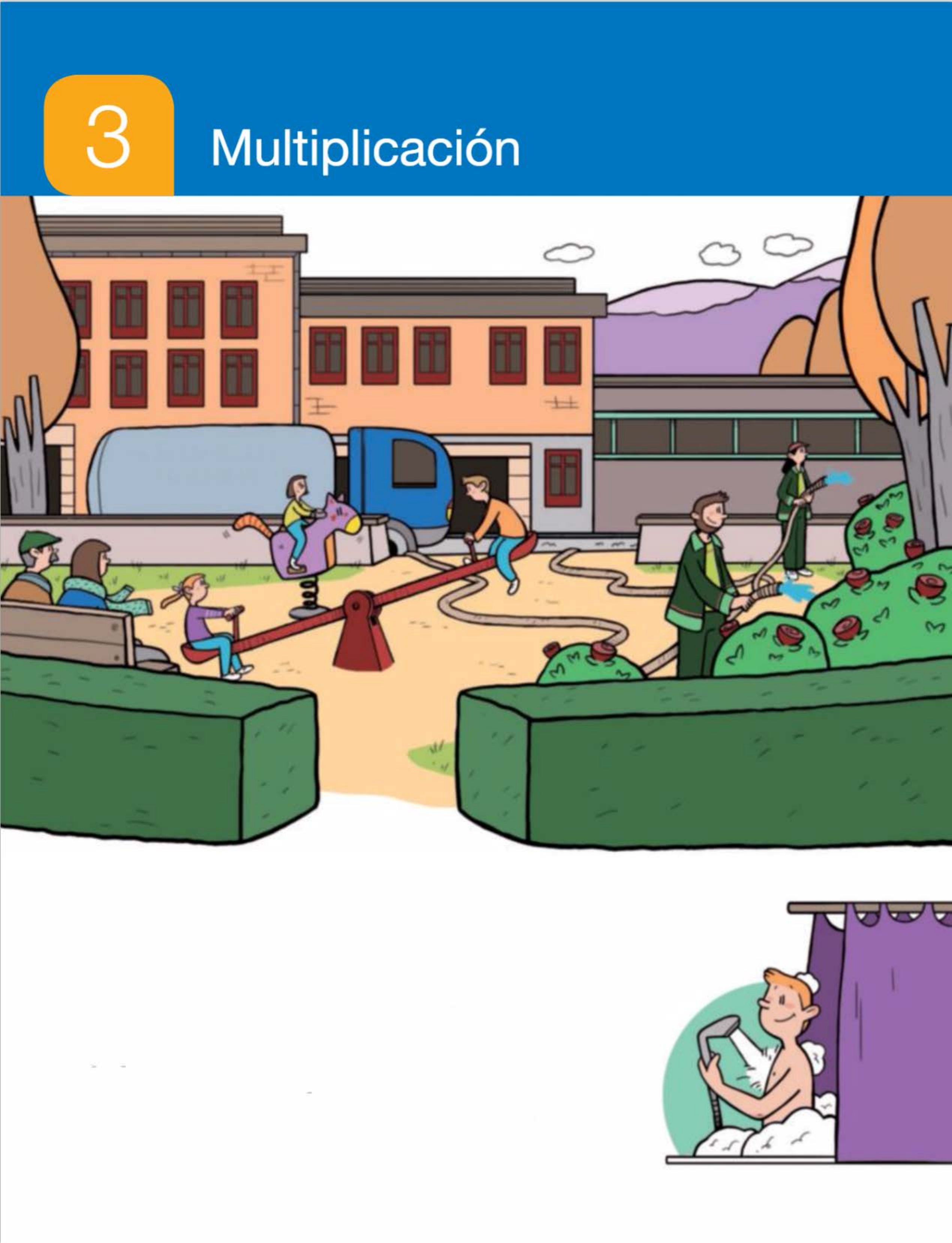 36 AGUA RECICLADA PARA RIEGO ¡Ahorremos agua! Gran parte de nuestro planeta está cubierto por los mares y océanos. Ocurre, sin embargo, algo curioso: la cantidad de agua dulce que hay disponible es muy - pequen a. En España cada persona consume aproximadamente 100 litros de agua al día. Es importante que todos contribuyamos a ahorrar agua en nuestra vida cotidiana para aprovechar bien este recurso tan escaso. - - Lee, comprende y razona G ¿Cuántos litros consume aproximadamente una persona en 2 días? ¿Y en una semana? ¿Qué operación has hecho para calcularlo? Q Un grifo estropeado que gotea puede suponer la pérdida de unos 50 litros de agua en un día. ¿Cuántos litros se perderían por un grifo roto en una semana? ¿Y en un mes? ¿Cómo lo calculas? Q EXPRESIÓN ORAL. Explica qué quiere decir la expresión «unos 50 litros de agua» en la actividad anterior. Multiplicaciones llevando e SABER HACER TAREA FINAL r jJ) Comprobar un pedido • . j t:::=' � Al final de la unidad comprobarás si un pedido es correcto. Antes, trabajarás con las multiplicaciones y sus estimaciones. Multiplica 2.41 3 x 6 1 .0 Multiplica 6 por las unidades. 2.0 Multiplica 6 por las decenas y suma las que te llevas. 3.0 Multiplica 6 por las centenas. No te llevas 4.0 Multiplica 6 por las unidades de millar y suma las que te llevas. UM e D U <D 2 4 1 3 X 6 8 UM e D U <D 2 4 1 3 X 6 7 8 Coloca los números y calcula. 82 X 2 54 X 3 Escribe y calcula. 146 X 2 425 X 4 . n1nguna. UM e D U ® <D 2 4 1 3 X 6 4 7 8 • 1.370 X 3 2.318 X 5 UM e D U ® <D 2 4 1 3 X 6 1 4 4 7 8 Una multiplicación cuyos factores son 140 y 4. ¿Cuál es su producto? Una multiplicación cuyos factores son 1.203 y 5. ¿Cuál es su producto? 37 Multiplicación por números de dos y de tres cifras En el pueblo de David han organizado una excursión a los lagos. Se han apuntado 154 personas y cada una ha pagado 23 €. ¿Cuánto se ha recaudado en total? Multiplica 154 x 23 1 .0 Multiplica 154 por 3. 1 5 4 X 2 3 4 6 2 2.0 Multiplica 154 por 2 y coloca el producto debajo del anterior, dejando un hueco a la derecha. 1 5 4 X 2 3 4 6 2 3 o 8 Se han recaudado 3.542 €. 8 Copia y calcula en tu cuaderno. PRESTA ATENCIÓN No olvides dejar un hueco a la derecha al colocar el segundo producto. 3 5 X 2 9 0 Coloca los números y calcula en tu cuaderno. 3.0 Suma los productos obtenidos. 9 3 X 3 8 1 5 X 2 4 6 3 o 8 3 5 4 4 6 5 X 4 5 4 3 2 2 8 7 4 X 6 9 • 28 X 42 • 37 X 69 • 176 X 25 • 382 X 57 • 19 X 35 • 46 X 87 • 269 X 96 • 591 X 74 O Observa que el segundo factor es una decena y calcula. 38 Q Coloca los números y calcula. � HAZLO ASÍ Para multiplicar 234 por 365 1.0 Multiplica 234 por 5. 2.0 Multiplica 234 por 6. Coloca el producto debajo del anterior, dejando un hueco a la derecha. 3.0 Multiplica 234 por 3. Coloca el producto debajo del anterior, dejando un hueco a la derecha. l4.0 Suma todos los productos obtenidos. • 123 X 215 • 421 X 382 • 2.132 X 143 • 3.052 X 274 O Resuelve. • Marta va todos los días a natación. Cada día nada durante 45 minutos. ¿Cuántos minutos en total nada al mes? • 674 X 183 • 4.268 X 378 • Un polideportivo tiene un total de 250 socios. Cada socio paga al año una cuota de 35 €. ¿Cuántos euros recauda el polideportivo anualmente? • Unos grandes almacenes han puesto en oferta un televisor por 450 €. En esta semana ya han vendido 136. ¿Cuánto han recaudado por esta venta? 2 3 4 X 3 6 5 1 1 7 o +---1.0 1 4 o 4 +� - 2.0 7 o 2 3.0 8 5 4 1 o +---4.0 • 895 X 292 • 5.629 X 426 RECUERDA 1 semana = 7 días 1 mes = 30 días 1 año = 365 días • Cada día un autobús va de la ciudad A a la ciudad 8 y recorre un total de 128 kilómetros. ¿Cuántos kilómetros recorrerá el autobús en un año? CÁLCULO MENTAL Suma centenas a números de tres y de cuatro cifras 239 + 700 1.375 + 300 326 + 800 = 1 . 126 362 + 900 5.634 + 200 = 5.834 6.739 + 800 T J J T J J 457 + 600 l l 7.457 + 900 586 + 300 8.604 + 600 39 Propiedades de la multiplicación Propiedad conmutativa 3X2 '-...../ 6 - 2 X 3 '-...../ 6 Propiedad distributiva 5 X (3 + 2) '-...../ 5 X 5 � 25 Propiedad asociativa - 5X3 + 5X2 '-...../ '-...../ 15 + 10 � 25 2 X (3 X 4) = (2 X 3) X 4 '-...../ '-...../ 2X 12 6 X 4 � � 24 24 o o Propiedad conmutativa. En un producto de dos factores, si cambiamos el orden de los factores el resultado no varía. Propiedad asociativa. En un producto de tres factores, si cambiamos la agrupación de los factores el resultado no varía. Propiedad distributiva de la suma. Al multiplicar un número por una suma, se obtiene el mismo resultado que al multiplicar el número por cada sumando y, después, sumar los productos obtenidos. 0 Aplica la propiedad conmutativa o asociativa y comprueba que obtienes el mismo resultado. • 12 X 3 • 15 X 7 • 4 X (5 X 6) • 9 X (2 X 1 O) • 30 X 9 • 8 X 20 • (7 X 3) X 2 • (6 X 1 0) X 8 O Aplica la propiedad distributiva y comprueba que se obtiene el mismo resultado. • 3 X (2 + 4) • 4 X (5 + 1) (EJEMPLO 40 • 8 X (2 + 6) • 7 X (3 + 2) 3 X (2 + 4) = 3 X 2 + 3 X 4 3X - ... + j -- • (4 + 2) X 3 • (6 + 2) X 5 • (1 + 6) X 5 • (7 + 3) X 9 O Completa en tu cuaderno y comprueba que obtienes el mismo resultado. HAZLO ASÍ Propiedad distributiva de la resta Al multiplicar un número por una resta, se obtiene el mismo resultado que al multiplicar ese número por el minuendo y por el sustraendo y, después, restar los productos obtenidos. 3 X (8 - 2) - 3 X 8 - 3 X 2 '-......./ '-......./ '-......./ 3 X 6 - 24 6 3X�-2} 3X8-3x2 � ..._______..... 18 - 18 • 9 X (6 - 1) = 9 X . . . - 9 X .. . • (8 - 3) X 2 = . . . X . . . - .. . X .. . • 8 X (4 - 2) = ... X . . . - ... X . . . • (5 - 2) X 7 = ... X ... - ... X .. . • 5 X (7 - 6) = ... X .. . - .. . X .. . • (6 - 5) X 4 = ... X ... - ... X .. . Problemas Q Resuelve. • Laura tiene 7 bolsas con 8 peras cada una. Pilar tiene 8 bolsas con 7 peras cada una. ¿Quién tiene más peras