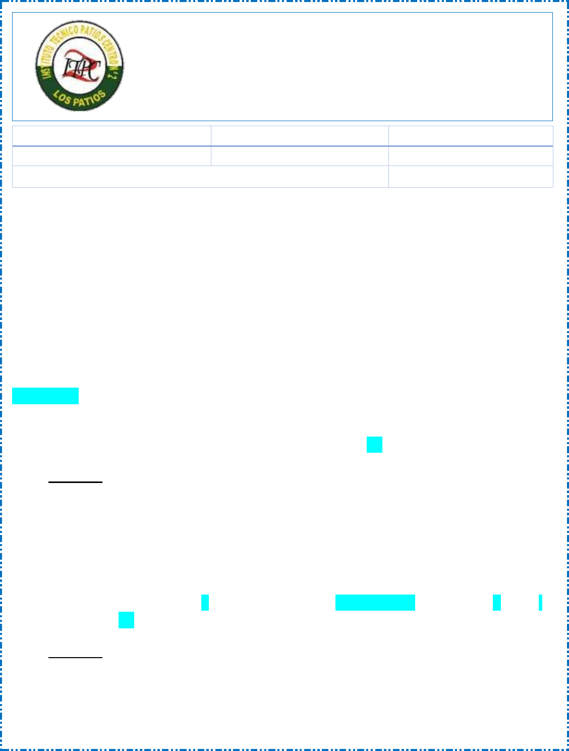 ÁREA: English TEACHER: Alid María Contreras GRADE: 8°01 – 8°02 – 8°03 TOPIC: Simple present DATE: febrero 22 a marzo 5 GUIDE: N°3 NAME STUDENT: PERIOD: first SIMPLE PRESENT TENSE TIEMPO PRESENTE SIMPLE El tiempo presente simple lo utilizamos para expresar una acción que hacemos regularmente como rutina. Para las terceras personas (he, she, it) se le agrega al verbo (s, es, ies) sólo en la forma afirmativa. Rulers (reglas) 1. Cuando el verbo termina en (sh, ch, x, o, z, s) se le agrega es a las terceras personas. Example: • Brush: cepillar • Teach: enseñar • Fix: reparar • Do: hacer • Bizz: sumbar • Kiss: besar 2. Cuando el verbo termina en y y va precedido de una consonante, se cambia la y por la i y se le agrega es. Example: • Study: studies: estudiar • Cry: cries: llorar • Fly: flies: volar • Copy: copies: copiar INSTITUTO TÉCNICO PATIOS CENTRO N°2 GESTIÓN ACADÉMICA DANE 254874000568 NIT: 900027336_1 Aprobado por Resolución No. 005209 del 21 de octubre de 2019 Expedida por la Gobernación del Departamento de Norte de Santander 3. Cuando el verbo termina en y y va precedido de una vocal, se coloca s en las terceras personas. Example: • Play: plays: jugar • Enjoy: enjoys: disfrutar • Say: says: decir • Buy: buys: comprar 4. Cuando el verbo termina en vocal e se le agrega s, en las terceras personas. Example: • Write: writes: escribir • Love: loves: amar • Practice: practices: practicar • Ride: rides: montar 5. Cuando el verbo termina en una consonante distinta a las anteriores se le agrega s en las terceras personas. Example: • Work: Works: trabajar • Open: opens: abrir • Read: reads: leer • Sleep: sleeps: dormir HERE WE GO Activity in class 1. Escribo en presente simple los verbos teniendo en cuenta las reglas. VERBO EN ESPAÑOL INFINITIVE SIMPLE PRESENT HE – SHE - IT 1. Terminar Finish 2. Reparar Fix 3. Estudiar Study 4. Copiar Copy 5. Decir Say 6. Comprar Buy 7. Escribir Write 8. Cerrar Close 9. Enseñar Teach 10. Olvidar Forget 11. Dar Give 12. Contar Count 13. Hablar Speak 14. Mirar TV Watch 15. Leer Read 16. Entender Understand 17. Enviar Send 18. Responder Reply 19. Pagar Pay 20. Ir Go 2. Encierra el verbo en su forma correcta. ESTRUCTURA DEL TIEMPO PRESENTE SIMPLE 1. Forma afirmativa: Para construir oraciones afirmativas en tiempo presente simple debo tener en cuenta el siguiente orden. • SUJETO • VERBO S + V + C • COMPLEMENTO Example: • Camilo plays soccer with the friends • Evelyn sings in the church • Camila studies in the university • Luisa watches TV in the living room 2. Forma negativa: Para construir oraciones negativas en tiempo presente simple debo utilizar el auxiliar DO, DOES. (NO TIENEN TRADUCCIÓN). El auxiliar DO se utiliza para los pronombres personales. ¡Debo tener en cuenta el siguiente orden para las oraciones negativas! • SUJETO • AUXILIAR – DO, DOES • NEGACIÓN • VERBO • COMPLEMENTO I YOU WE YOU THEY DO El auxiliar DOES se utiliza para los pronombres personales: HE SHE IT DOES ¡ojo ¡ Example: • Camila DOES NOT buy in the mall • Heidy DOES NOT play in the street • Hector DOES NOT drink milk with bread • I DO NOT speak in class with my friends 3. Forma interrogativa: Para construir oraciones interrogativas en tiempo presente simple debo tener en cuenta que el auxiliar DO, DOES va al comienzo de la oración. • AUXILIAR – DO, DOES • SUJETO • VERBO • COMPLEMENTO • SIGNO DE INTERROGACIÓN – ? Example: • DOES Jhon live in the Sabana? • DOES my brother work in a factory? • DO they walk for the park? • DOES Evelyn go to the school? El auxiliar DO – DOES se puede escribir en forma abreviada con la negación. DO NOT – DON´T DOES NOT – DOESN´T YOU CAN DO IT! Activity in class 1. Encierro el verbo en forma correcta de cada oración. 2. Encierro el verbo en su forma correcta en la siguiente lectura y la traduzco. Actividad 1. Copio la guía en el cuaderno. 2. Realizo las actividades. 3. Terminada la guía, la envío. 4. Fecha de envío marzo 5. GOOD LUCK