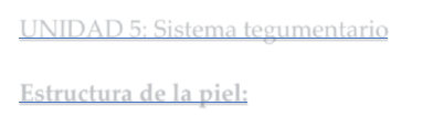 RESUMEN DE UNIDADES UNIDAD 5: Sistema tegumentario Estructura de la piel: La piel consta de dos partes principales, la porción superficial, más delgada, está compuesta por tejido epitelial, y se denomina EPIDERMIS. La parte profunda y más gruesa de tejido conectivo es la DERMIS. EPIDERMIS: es avascular, un corte en esta no produce sangrado. Compuesta por un epitelio pavimentoso estratificado queratinizado. Cuatro tipos de células: queratinocitos, melanocitos, células de Langerhans y células de Merkel. La epidermis tiene cuatro capas o estratos: basal, espinoso, granuloso y un estrato corneo delgado ➢ Queratinocitos: 90% de las células epidérmicas son queratinocitos. Producen la proteína queratina. Producen gránulos lamelares, que liberan un sellador que repele el agua y disminuye la entrada y la perdida de agua, además de inhibir el ingreso de materiales extraños. ➢ Melanocitos: 8% de las células epidérmicas son melanocitos. Derivan del ectodermo embrionario y producen el pigmento melanina. Se extienden entre los queratinocitos y les transfieren gránulos de melanina (otorga el color a la piel y absorbe rayos UV) ➢ Las células de Langerhans: denominas células dendríticas epidérmicas, se originan en la medula ósea y migran a la epidermis. Participan en las respuestas inmunitaria contra los microorganismos que invaden la piel. Su función en la respuesta inmunitaria consiste en ayudar a otro celular del sistema inmunitario a reconocer microorganismos invasores y destruirlos. ➢ Las células de Merkel: son las menos numerosas en la epidermis. Están localizadas en la capa más profunda de la epidermis, donde entran en contacto con los discos (táctiles) de Merkel (Perciben las sensaciones táctiles) • Estrato basal: Es la capa más profunda de la epidermis. Compuesto por una sola hilera de queratinocitos cúbicos o cilíndricos. Algunas células son células madres. • Estrato espinoso: Superficial con respecto al estrato basal, se encuentra el estrato espinoso. Numerosos queratinocitos dispuestos en ocho a diez capas. Las células en la capa superficial son algo aplanadas. Tienen la capacidad para dividirse. • Estrato granuloso: En la parte intermedia de la epidermis se encuentra el estrado granuloso. Formado por tres a cinco capas de queratinocitos aplanados que experimentan apoptosis. Una característica distintiva es la presencia de gránulos oscuros. Y gránulos lamelares que secretan lípidos. Evita la entrada y la perdida de agua y el ingreso de materiales extraños. No pueden llevar a cabo reacciones metabólicas vitales y muren. • Estrato lucido: solo está presente en la piel gruesa de la yema de los dedos, las palmas de las manos y las plantas de la piel. Consiste en cuatro a seis capas de queratinocitos muertos, que son aplanados y transparentes. Proporciona un nivel adicional de resistencia a esta región de piel gruesa. • Estrato corneo: Está constituido por 25 a 30 capas de queratinocitos muertos aplanados. Las células se descaman en forma continua y se remplazan por las células de los estratos más profundos. Sus múltiples capas de células muertas ayudan a proteger a las capas más profundas de las lesiones y de la invasión microbiana. -Queratinización y crecimiento de la epidermis: Las células recientemente formadas en el estrato basal se desplazan con lentitud hacia la superficie. A medida que pasan de una capa epidérmica hacia la siguiente acumulan más queratina, a través de un proceso denominado queratinización. Luego experimentan apoptosis. Las células queratinizadas se desprenden y se remplazan por células subyacentes, que a su vez se queratinizan. DERMIS: La dermis es vascularizada, por lo cual un corte en la dermis produce sangrado. Es la segunda porción de la piel y la más profunda. Formada por tejido conectivo denso irregular. Gran resistencia a la tensión. Puede estirarse y recuperarse con facilidad. Los vasos sanguíneos, los nervios, las glándulas y los folículos pilosos se encuentran en esta capa. De acuerdo a su estructura tisular, la dermis puede dividirse en una región papilar superficial delgada y una región reticular gruesa más profunda. ▪ Región papilar: Su superficie se incrementa en gran medida debido a la presencia de pequeñas estructuras mamilares llamadas papilas dérmicas que se proyectan hacia la superficie inferior de la epidermis. ▪ Región reticular: Conectada con el tejido subcutáneo, está compuesta de fibras de colágeno gruesas, fibroblastos dispersos y varias fibras circulantes. Las fibras de colágeno de la región reticular se entrelazan formando una estructura similar a una red y mantienen una disposición mucho más regular que las de la región papilar. Ayuda a que la piel resista al estiramiento. La combinación de las fibras de colágeno y elásticas en la región reticular otorga a la piel resistencia, distensibilidad y elasticidad. TEJIDO SUBCUTANEO: Se encuentra debajo de la dermis, no forma parte de la piel. Esta capa también se llama hipodermis. Constituido por el tejido areolar y adiposo. Almacena rasa y contiene vasos sanguíneos grandes que irrigan la piel. FUNCIONES DE LA PIEL: protección del cuerpo y la regulación de la temperatura corporal. ✓ Termorregulación: por liberación de sudor, por regulación del flujo sanguíneo. ✓ Protección: La queratina protege de gérmenes, abrasiones, calor y agentes químicos. Lípidos: retardan la evaporación del agua. Sebo: evita deshidratación. Melanina: protege rayos UV. Células Langerhans y macrófagos: respuesta inmune ✓ Síntesis de vitamina D ✓ Sensibilidad cutánea: tacto, presión, vibración y cosquilleo, calor o frio. ✓ Excreción y absorción: Eliminación de agua, CO2, amoniaco y urea. Absorción de sustancias liposolubles como vitaminas y fármacos BASES ESTRUCTURALES DEL COLOR DE LA PIEL: Melanina, hemoglobina, y caroteno, son tres pigmentos que imparten a la piel una amplia variedad de colore