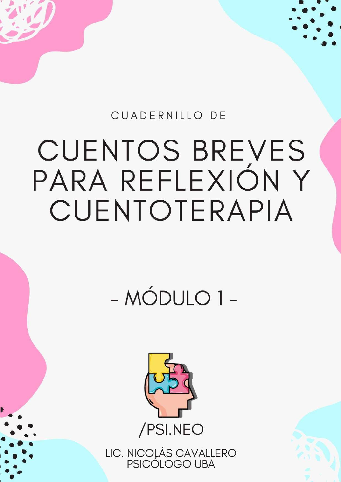 1 2 ¡Gracias por adquirir nuestro material de trabajo! A continuación, tendrás a tu disposición más de treinta relatos y cuentos breves para ser utilizados en espacios de reflexión individuales, grupales y cuentoterapia, como por ejemplo grupos terapéuticos, grupos de apoyo, clases, espacios académicos, talleres o trabajos con grupos humanos en general). Las temáticas de los cuentos son múltiples y diversas, y también pueden ser adaptadas al trabajo con distintos grupos etarios. Lic. Nicolás Cavallero Psicólogo UBA. Formación en Psicología Comunitaria. Coordinador de Talleres recreativo-terapéuticos. Docente teatral. Contacto: www.instagram.com/psi.neo www.facebook.com/psi.neo consultapsi.neo@gmail.com http://www.instagram.com/psi.neo http://www.facebook.com/psi.neo mailto:consultapsi.neo@gmail.com 3 • Puntos de vista Un relato de origen chino describe la vida de un campesino que era considerado muy próspero porque era dueño de un caballo que utilizaba para arar la tierra y trasladarse. Un día un rayo rompió la entrada del corral y el animal se escapó. Los vecinos al enterarse fueron a verle apenados por la pérdida diciéndole: «Qué mala suerte ha tenido vecino, de no ser por esta tormenta no habría perdido su único caballo». El campesino simplemente dijo: «¿Buena suerte? ¿Mala suerte? Solo son puntos de vista”. Unos pocos días después, el animal volvió acompañado de dos caballos salvajes de las montañas. Todos los vecinos se regocijaron por su buena fortuna y fueron a felicitarlo por su buena suerte. El campesino solo dijo: «¿Buena suerte? ¿Mala suerte? Solo son puntos de vista» Al día siguiente, el hijo del campesino trató de montar a uno de los caballos salvajes; el animal lo tiró y el joven se quebró una pierna. Debió ser entablillado y se le indicó guardar cama por un par de meses. Naturalmente todos los vecinos ofrecieron su consuelo por la mala fortuna. Y el campesino nuevamente dijo: «¿Buena suerte? ¿Mala suerte? Solo son puntos de vista. Una semana más tarde, los oficiales de reclutamiento llegaron al lugar para alistar a los jóvenes para el ejército ya que se había desatado una guerra en las fronteras de la China. Ellos rechazaron al hijo del campesino porque tenía la pierna fracturada. Cuando los vecinos le dijeron lo afortunado que era porque su hijo no había sido alistado, el campesino contestó: «¿Buena suerte? ¿Mala suerte? Solo son puntos de vista» 4 • La punta del jamón Juan y Mariana acaban de casarse. Están felices de haber decidido recorrer juntos el camino de la vida, se aman profundamente y buscan demostrarlo en también en los detalles cotidianos. A Juan le encanta disfrutar de una buena mesa y a Mariana le da mucho placer cocinar. El plato preferido de Juan es el jamón al horno, la pata entera asada lentamente. Al saberlo Mariana, decide consultar por la mejor receta posible para agasajar a su amado con su manjar preferido. Se acuerda de que madre cocina muy bien este platillo y le pide la receta. Recibe las instrucciones del caso y pone manos a la obra. Cuando lleva el jamón a la mesa, Juan se da cuenta de un detalle y le hace una pregunta: - "¿Por qué le cortaste la punta? ¡Es la parte que más me gusta!" Mariana piensa un momento y le responde: - "Bueno, mi madre me dio la receta y decía que había que cortarle la punta al jamón para cocinarlo" - "¡Qué extraño!", responde Juan. "Justamente es la parte que más me gusta y no entiendo por qué habría que quitarla." Con esta duda en mente, días después Mariana le pregunta a su madre el porqué de tener que cortarle la punta al jamón. La madre piensa un momento y sólo tiene una respuesta: http://cuentosqueyocuento.blogspot.com/2009/03/la-punta-del-jamon.html 5 - "Tu abuela siempre cocinó el jamón de esta manera, siempre le cortó la punta. Creo que mejor le preguntas a la abuela para saber el motivo." Sin perder tiempo y queriendo descubrir el misterio del jamón al horno, Mariana llama a su abuela y le pregunta: - "Abuela, por qué siempre le cortas la punta al jamón antes de cocinarlo?" La abuela, sorprendida por lo obvio de la pregunta le responde: - "¡Porque mi horno es muy pequeño, y el jamón no cabe entero!" • El Obstáculo en el Camino Hace mucho tiempo, un rey colocó una gran roca obstaculizando un camino. Se escondió y miró para ver si alguien quitaba la tremenda piedra. Algunos pasaron simplemente dando una vuelta. Muchos culparon al rey por no mantener los caminos despejados, pero ninguno hizo nada para sacar la piedra del camino. Un campesino, que pasaba por allí con una carga de verduras, la vio. Al aproximarse a ella, puso su carga en el piso y trato de mover la roca a un lado del camino. Después de empujar y fatigarse mucho, con gran esfuerzo, lo logró. Mientras recogía su carga de vegetales, vio una bolsa en el suelo, justo donde había estado la roca. 6 La bolsa contenía muchas monedas de oro y una nota del mismo rey diciendo que el oro era la recompensa para la persona que removiera la piedra del camino. El campesino aprendió ese día que cada obstáculo puede estar disfrazando una oportunidad. • La flor Se cuenta que hace muchos años en la China antigua, un príncipe de la región norte del país estaba por ser coronado emperador, pero de acuerdo con la ley, él debía casarse. Sabiendo esto, decidió hacer una competencia entre las muchachas de la corte para ver quién sería digna de su propuesta. Al día siguiente, el príncipe anunció que recibiría en una audiencia especial a todas las pretendientes y lanzaría un desafío. Una anciana que servía en el palacio hacía muchos años, escuchó los comentarios sobre los preparativos y sintió una leve tristeza porque sabía que su joven hija tenía un sentimiento profundo de amor por el príncipe. Al llegar a la casa y contar los hechos a la joven, se asombró al saber que ella quería ir a la celebración. Sin poder creerlo le preguntó: - ¿Hi