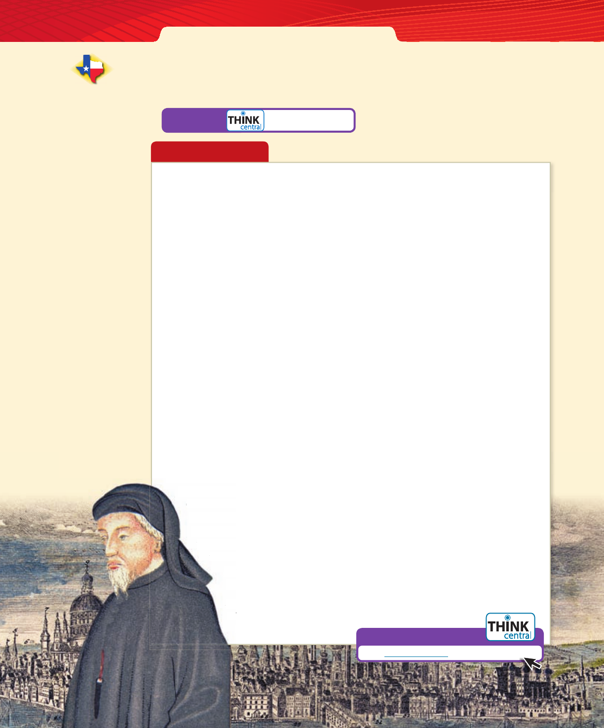 The Age of Chaucer The Prologue from The Canterbury Tales Poem by Geoffrey Chaucer Translated by Nevill Coghill did you know? Geoffrey Chaucer . . . • was captured and held for ransom while fighting for England in the Hundred Years’ War. • held various jobs, including royal messenger, justice of the peace, and forester. • portrayed himself as a foolish character in a number of works. Meet the Author Geoffrey Chaucer made an enormous mark on the language and literature of England. Writing in an age when French was widely spoken in educated circles, Chaucer was among the first writers to show that English could be a respectable literary language. Today, his work is considered a cornerstone of English literature. Befriended by Royalty Chaucer was born sometime between 1340 and 1343, probably in London, in an era when expanding commerce was helping to bring about growth in villages and cities. His family, though not noble, was well off, and his parents were able to place him in the household of the wife of Prince Lionel, a son of King Edward III, where he served as an attendant. Such a position was a vital means of advancement; the young Chaucer learned the customs of upper-class life and came into contact with influential people. It may have been during this period that Chaucer met Lionel’s younger brother, John of Gaunt, who would become Chaucer’s lifelong patron and a leading political figure of the day. A Knight and a Writer Although Chaucer wrote his first important work around 1370, writing was always a sideline; his primary career was in diplomacy. During Richard II’s troubled reign (1377 to 1399), Chaucer was appointed a member of Parliament and knight of the shire. When Richard II was overthrown in 1399 by Henry Bolingbroke (who became King Henry IV), Chaucer managed to retain his political position, as Henry was the son of John of Gaunt. Despite the turmoil of the 1380s and 1390s, the last two decades of Chaucer’s life saw his finest literary achievements— the brilliant verse romance Troilus and Criseyde and his masterpiece, The Canterbury Tales, a collection of verse and prose tales of many different kinds. At the time of his death, Chaucer had penned nearly 20,000 lines of The Canterbury Tales, but many more tales were planned. Uncommon Honor When he died in 1400, Chaucer was accorded a rare honor for a commoner—burial in London’s Westminster Abbey. In 1556, an admirer erected an elaborate marble monument to his memory. This was the beginning of the Abbey’s famous Poets’ Corner, where many of England’s most distinguished writers have since been buried. Geoffrey Chaucer 1340?–1400 KEYWORD: HML12-142AVIDEO TRAILER Go to thinkcentral.com. KEYWORD: HML12-142B Author Online advancement; the the customs o came into co people. It m period that younger b who w life po A K W C READING 3 Evaluate the changes in sound, form, figurative language, and dramatic structure in poetry across literary time periods. TX_L12PE-u01s31-brProlog.indd 142TX_L12PE-u01s31-brProlog.indd 142 9/9/09 1:50:46 PM9/9/09 1:50:46 PM What makes a great character? Creating a great character requires a sharp eye for detail, a keen understanding of people, and a brilliant imagination—all of which Chaucer possessed. Chaucer populated The Canterbury Tales with a colorful cast of characters whose virtues and flaws ring true even today, hundreds of years later. QUICKWRITE Work with a partner to invent a character. Start with an intriguing name. Then come up with questions that will reveal basic information about the character, such as his or her age, physical appearance, family and friends, job, home, and personal tastes. Brainstorm possible answers for the questions. Then circle the responses that have the best potential for making a lively character. literary analysis: characterization Characterization refers to the techniques a writer uses to develop characters. In “The Prologue,” the introduction to The Canterbury Tales, Chaucer offers a vivid portrait of English society during the Middle Ages. Among his 30 characters are clergy, aristocrats, and commoners. Chaucer employs a dramatic structure similar to Boccaccio’s The Decameron—each pilgrim tells a tale. Some of the ways Chaucer characterizes the pilgrims include • description of a character’s appearance • examples of a character’s speech, thoughts, and actions • the responses of others to a character • the narrator’s direct comments about a character As you read, look for details that reveal the character traits, or consistent qualities, of each pilgrim. reading strategy: paraphrase Reading medieval texts, such as The Canterbury Tales, can be challenging because they often contain unfamiliar words and complex sentences. One way that you can make sense of Chaucer’s work is to paraphrase, or restate information in your own words. A paraphrase is usually the same length as the original text but contains simpler language. As you read, paraphrase difficult passages. Here is an example. Chaucer’s Words Paraphrase “When in April the sweet showers fall/And pierce the drought of March to the root, . . . ” (lines 1–2) When the April rains come and end the dryness of March, . . . vocabulary in context The following boldfaced words are critical to understanding Chaucer’s literary masterpiece. Try to figure out the meaning of each word from its context. 1. The refined gentleman always behaved with courtliness. 2. She remained calm and sedately finished her meal. 3. The popular politician was charming and personable. 4. When you save money in a bank, interest will accrue. 5. Does she suffer from heart disease or another malady? 6. She made an entreaty to the king, asking for a pardon. Complete the activities in your Reader/Writer Notebook. Name: Bartholomew Throckmorton 1. What is his occupation? duke squire to a knight sea captain town doctor grave digger 2. Where does he live? 3. 4. 5. the canterbury tales 143 TX_