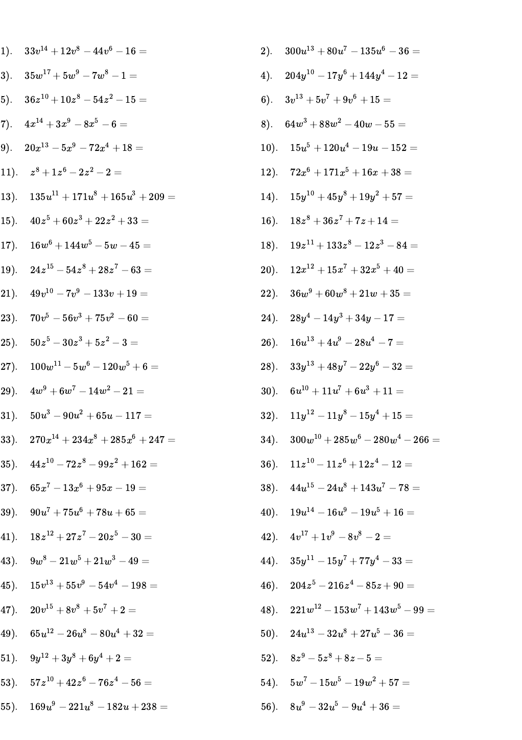 Factor Común por Agrupación Factorizar: 1). 33 + 12 − 44 − 16 =v14 v8 v6 2). 300 + 80 − 135 − 36 =u13 u7 u6 3). 35 + 5 − 7 − 1 =w17 w9 w8 4). 204 − 17 + 144 − 12 =y10 y6 y4 5). 36 + 10 − 54 − 15 =z10 z8 z2 6). 3 + 5 + 9 + 15 =v13 v7 v6 7). 4 + 3 − 8 − 6 =x14 x9 x5 8). 64 + 88 − 40w − 55 =w3 w2 9). 20 − 5 − 72 + 18 =x13 x9 x4 10). 15 + 120 − 19u − 152 =u5 u4 11). + 1 − 2 − 2 =z8 z6 z2 12). 72 + 171 + 16x + 38 =x6 x5 13). 135 + 171 + 165 + 209 =u11 u8 u3 14). 15 + 45 + 19 + 57 =y10 y8 y2 15). 40 + 60 + 22 + 33 =z5 z3 z2 16). 18 + 36 + 7z + 14 =z8 z7 17). 16 + 144 − 5w − 45 =w6 w5 18). 19 + 133 − 12 − 84 =z11 z8 z3 19). 24 − 54 + 28 − 63 =z15 z8 z7 20). 12 + 15 + 32 + 40 =x12 x7 x5 21). 49 − 7 − 133v + 19 =v10 v9 22). 36 + 60 + 21w + 35 =w9 w8 23). 70 − 56 + 75 − 60 =v5 v3 v2 24). 28 − 14 + 34y − 17 =y4 y3 25). 50 − 30 + 5 − 3 =z5 z3 z2 26). 16 + 4 − 28 − 7 =u13 u9 u4 27). 100 − 5 − 120 + 6 =w11 w6 w5 28). 33 + 48 − 22 − 32 =y13 y7 y6 29). 4 + 6 − 14 − 21 =w9 w7 w2 30). 6 + 11 + 6 + 11 =u10 u7 u3 31). 50 − 90 + 65u − 117 =u3 u2 32). 11 − 11 − 15 + 15 =y12 y8 y4 33). 270 + 234 + 285 + 247 =x14 x8 x6 34). 300 + 285 − 280 − 266 =w10 w6 w4 35). 44 − 72 − 99 + 162 =z10 z8 z2 36). 11 − 11 + 12 − 12 =z10 z6 z4 37). 65 − 13 + 95x − 19 =x7 x6 38). 44 − 24 + 143 − 78 =u15 u8 u7 39). 90 + 75 + 78u + 65 =u7 u6 40). 19 − 16 − 19 + 16 =u14 u9 u5 41). 18 + 27 − 20 − 30 =z12 z7 z5 42). 4 + 1 − 8 − 2 =v17 v9 v8 43). 9 − 21 + 21 − 49 =w8 w5 w3 44). 35 − 15 + 77 − 33 =y11 y7 y4 45). 15 + 55 − 54 − 198 =v13 v9 v4 46). 204 − 216 − 85z + 90 =z5 z4 47). 20 + 8 + 5 + 2 =v15 v8 v7 48). 221 − 153 + 143 − 99 =w12 w7 w5 49). 65 − 26 − 80 + 32 =u12 u8 u4 50). 24 − 32 + 27 − 36 =u13 u8 u5 51). 9 + 3 + 6 + 2 =y12 y8 y4 52). 8 − 5 + 8z − 5 =z9 z8 53). 57 + 42 − 76 − 56 =z10 z6 z4 54). 5 − 15 − 19 + 57 =w7 w5 w2 55). 169 − 221 − 182u + 238 =u9 u8 56). 8 − 32 − 9 + 36 =u9 u5 u4 57). 4 + 5 + 8 + 10 =y13 y7 y6 58). 64 − 4 − 16 + 1 =x14 x8 x6 59). 65 + 50 + 143w + 110 =w10 w9 60). 6 + 3 − 16u − 8 =u10 u9 61). 42 + 35 + 30 + 25 =x13 x9 x4 62). 4 + 44 − 11 − 121 =x12 x8 x4 63). 4 − 72 + 3 − 54 =z11 z8 z3 64). 9 − 18 + 7 − 14 =u7 u5 u2 65). 50 + 5 − 90z − 9 =z5 z4 66). 2 + 6 + 1 + 3 =u15 u9 u6 67). 6 + 36 − 17 − 102 =z10 z8 z2 68). 6 + 4 + 57 + 38 =w6 w4 w2 69). 54 − 9 − 30 + 5 =z7 z5 z2 70). 126 − 224 + 81v − 144 =v4 v3 71). 8 + 26 − 52 − 169 =x7 x4 x3 72). 30 + 130 + 33 + 143 =x10 x7 x3 73). 16 − 26 + 8 − 13 =z12 z8 z4 74). 240 − 84 + 260 − 91 =u9 u6 u3 75). 25 − 5 − 10 + 2 =v10 v7 v3 76). 91 − 42 − 104 + 48 =w14 w8 w6 77). 45 − 120 − 51 + 136 =w14 w9 w5 78). 28 + 16 − 35w − 20 =w5 w4 79). 119 + 136 − 7 − 8 =v9 v6 v3 80). 7 + 4 − 7 − 4 =y12 y7 y5 81). 68 + 80 + 51 + 60 =w14 w8 w6 82). 7 + 7 − 6 − 6 =z8 z5 z3 83). 7 − 18 + 112 − 288 =w14 w8 w6 84). 300 + 15 + 80 + 4 =x10 x7 x3 85). 72 + 153 − 16 − 34 =v13 v8 v5 86). 13 + 26 + 19 + 38 =v5 v3 v2 87). 8 − 26 − 4 + 13 =v11 v6 v5 88). 9 + 5 + 36 + 20 =x11 x7 x4 89). 15 − 8 + 15 − 8 =u14 u8 u6 90). 17 − 289 − 18 + 306 =w13 w7 w6 91). 35 − 45 − 77 + 99 =y13 y7 y6 92). 66 + 12 + 209 + 38 =u15 u8 u7 93). 13 + 3 − 13 − 3 =y10 y8 y2 94). 176 − 187 − 48 + 51 =z16 z9 z7 95). 210 + 15 − 182 − 13 =z13 z8 z5 96). 38 + 95 − 28u − 70 =u3 u2 97). 14 − 35 − 10v + 25 =v8 v7 98). 24 − 12 + 34w − 17 =w7 w6 99). 6 + 6 + 1x + 1 =x8 x7 100). 5 − 17 − 25 + 85 =u9 u6 u3 101). 160 + 10 + 16 + 1 =z10 z8 z2 102). 12 − 2 − 42y + 7 =y6 y5 103). 143 + 198 − 91 − 126 =u8 u6 u2 104). 162 + 252 − 117 − 182 =v14 v8 v6 105). 130 − 221 − 20 + 34 =z9 z6 z3 106). 38 + 19 + 28x + 14 =x7 x6 107). 18 − 90 − 1v + 5 =v8 v7 108). 63 − 45 − 112v + 80 =v6 v5 109). 15 + 5 − 3 − 1 =u5 u3 u2 110). 39 + 48 + 104 + 128 =w13 w8 w5 111). 76 + 95 + 80 + 100 =y12 y8 y4 112). 16 + 7 − 128 − 56 =u5 u3 u2 113). 6 + 9 + 2 + 3 =w8 w6 w2 114). 12 − 204 − 11 + 187 =u16 u9 u7 115). 19 − 38 + 14 − 28 =w10 w6 w4 116). 18 + 9 − 14w − 7 =w9 w8 117). 11 − 11 + 17 − 17 =z11 z9 z2 118). 16 − 22 − 8 + 11 =u14 u9 u5 119). 10 − 95 − 12 + 114 =x11 x6 x5 120). 7 − 21 + 6 − 18 =v14 v8 v6 121). 152 + 40 + 95 + 25 =z7 z4 z3 122). 35 + 40 − 49 − 56 =u12 u7 u5 123). 5 − 10 − 18w + 36 =w9 w8 124). 85 − 153 − 60 + 108 =x6 x4 x2 125). 10 + 20 + 9 + 18 =u10 u8 u2 126). − 17 − 1 + 17 =x6 x4 x2 127). 15 − 19 − 60 + 76 =y17 y9 y8 128). 9 + 4 + 36u + 16 =u6 u5 129). 3 + 8 − 6 − 16 =z12 z7 z5 130). 17 + 4 − 272 − 64 =u6 u4 u2 131). 7 − 56 + 18 − 144 =x10 x7 x3 132). 140 − 380 + 63 − 171 =x11 x7 x4 133). − 17 − 9x + 153 =x7 x6 134). 3 − 5 − 30w + 50 =w3 w2 135). 17 − 6 + 255 − 90 =x10 x6 x4 136). 13 + 234 − 9y − 162 =y7 y6 137). 5 − 85 − 11x + 187 =x3 x2 138). 84 − 36 − 91x + 39 =x5 x4 139). − 7 − 1y + 7 =y7 y6 140). 52 − 65 + 48 − 60 =x7 x4 x3 141). 102 + 17 − 108 − 18 =v7 v5 v2 142). 24 + 9 − 40u − 15 =u4 u3 143). 32 + 120 − 36 − 135 =z14 z9 z5 144). 18 − 12 + 3 − 2 =u14 u9 u5 145). 19 − 10 − 19u + 10 =u4 u3 146). 3 + 3 − 2 − 2 =w13 w8 w5 147). 247 − 143 + 323 − 187 =y8 y6 y2 148). 5 + 20 + 1w + 4 =w8 w7 149). 105 − 28 − 180 + 48 =u5 u3 u2 150). 13 + 52 − 1 − 4 =w15 w8 w7 151). 9 + 5 − 9 − 5 =x17 x9 x8 152). 4 + 20 + 3 + 15 =y17 y9 y8 153). 154 − 210 − 165 + 225 =u5 u3 u2 154). 9 − 13 + 153z − 221 =z9 z8 155). 2 − 1 − 2 + 1 =y10 y6 y4 156). 18 + 38 − 27 − 57 =v12 v9 v3 157). 68 + 4 + 85w + 5 =w8 w7 158). 13 + 104 − 20 − 160 =x10 x6 x4 159). 33 + 24 + 11 + 8 =w9 w5 w4 160). 238 − 140 + 85 − 50 =z11 z9 z2 161). 70 + 10 + 7 + 1 =w8 w6 w2 162). 228 + 108 − 209 − 99 =u8 u5 u3 163). 84 − 14 − 66 + 11 =x7 x4 x3 164). 20 + 17 + 60 + 51 =x13 x7 x6 165). 289 + 17 − 34 − 2 =u12 u8 u4