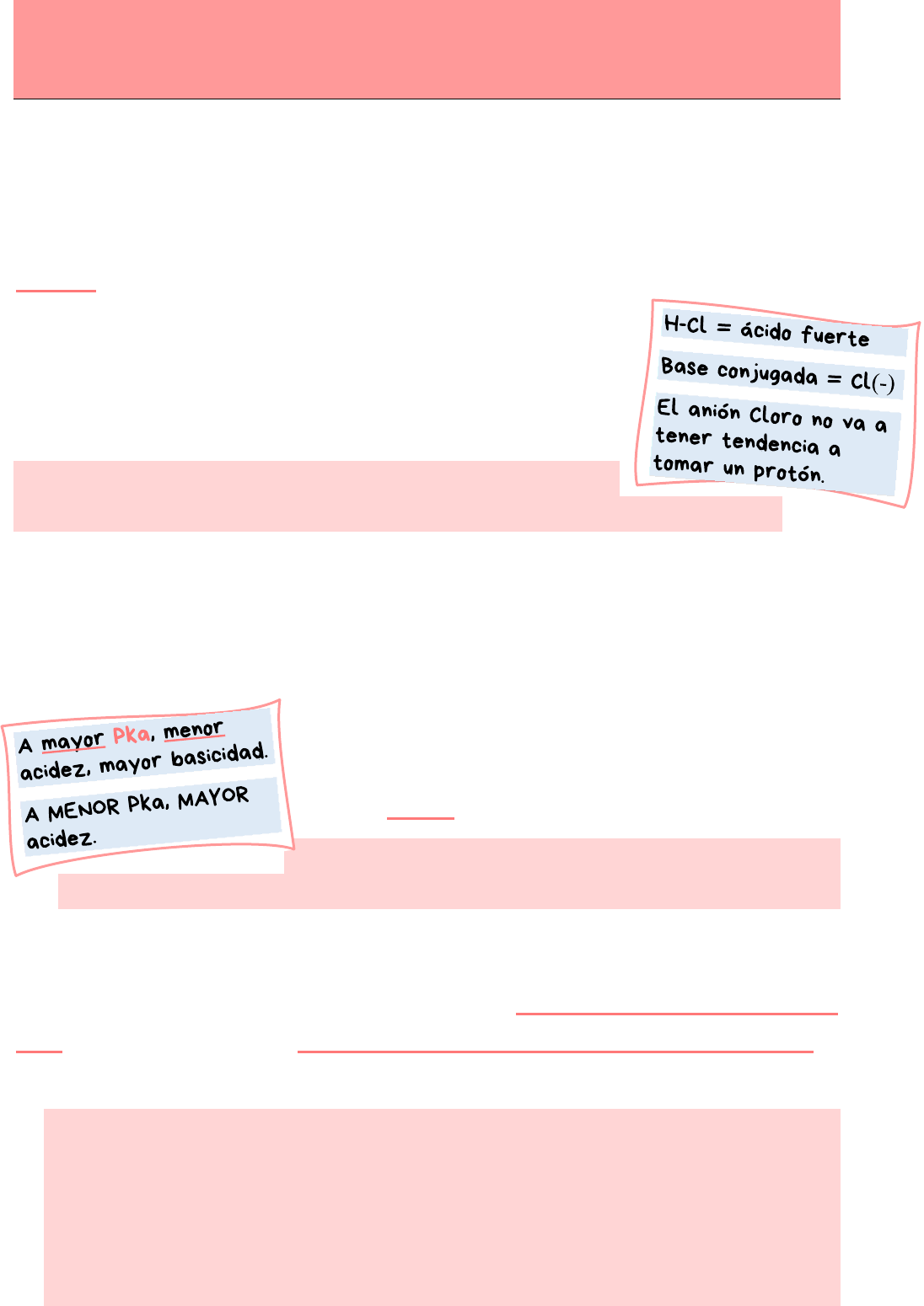ACIDEZ Las especies que tienen un hidrogeno en su estructura pueden potencialmente actuar como ácidos y las que poseen pares de electrones no compartidos pueden actuar como bases Cuanto mayor es la fuerza de un ácido, más tendencia va a tener ese ácido de estar disociado. Esto quiere decir que la reacción va a estar desplazada hacia la derecha, con la formación de la base conjugada. Y esa base conjugada va a tener poca tendencia de aceptar el protón, porque de esta forma desplazaría la ecuación hacia la izquierda. Entonces, entre un ácido y una base conjugada la relación que es existe es: CUANTO MAS FUERTE ES UN ÁCIDO, MAS DÉBIL ES SU BASE CONJUGADA (COMO BASE). El grado en el que se disocia un ácido se indica mediante su constante de acidez (Ka). Cuanto mayor es la constante de disociación del ácido, más fuerte es el ácido, y mayor es su tendencia a donar un protón. Normalmente, por convención, no se utiliza la constante de acidez Ka (ya que tiene valores muy grandes), sino que se utiliza el pka, el cual es el logaritmo de la constante. Por ende, los pka van a guardar una relación inversa con el grado de acidez → CUANTO MAYOR ES LA CONSTANTE DE ACIDEZ (Ka) MENOR ES EL PKa. Y, a MENOR PKa, MAYOR ACIDEZ. En las reacciones acido-base, el equilibrio se desplaza favoreciendo la formación del ácido más débil (mayor pka). Por otro lado, cuanto mayor sea la estabilidad del anión (ósea la base conjugada), mayor es el potencial del ácido para estar disociado (y mayor es su fuerza ácida). Esta estabilidad dependerá de: el átomo que soporta la carga negativa (tamaño, electronegatividad, hibridación) los efectos de resonancia los efectos inductivos y la solvatación. 1. T a m a ñ o En el grupo de los halógenos, la acidez aumenta con el tamaño del átomo. La acidez del HI es mayor que la del HBr > HCl > HF. Esto se debe a que el iodo es un núcleo mucho más grande, donde la carga negativa puede estar dispersa en un volumen mayor, y por lo tanto la estabilidad del anión va a ser mayor. 2. Electronegatividad La acidez va a aumentando desde el átomo menos electronegativo hacia el mas electronegativo. El HF es más acido que el agua, más ácido que el amoníaco y que el metano → la estabilidad de la base es mayor para el átomo más electronegativo que para el menos electronegativo. En resumen, la acidez aumenta con la electronegatividad 3. Hibridación A medida que aumenta el carácter s en la hibridación, lo que aumenta es la electronegatividad de ese carbono. Los orbitales se van haciendo cada vez menos voluminosos, estando cada vez los electrones más cerca del núcleo. Están más estabilizados con el núcleo y por lo tanto tienen menor tendencia a protonarse. Entonces la estabilización del anión se explica por la hibridación del carbono, el par de electrones en un orbital sp está más cerca del núcleo (menos tendencia a ser compartido) que con un sp2 o sp3, por ende, se encuentran más estabilizados. La acidez aumenta a medida que aumenta el carácter ´s´ de los orbitales. 4. Resonancia Cuanto mas estructuras resonantes haya, la estabilidad de ese compuesto será mayor. A su vez, cargas positivas en carbonos de los sustituyentes incrementan la inestabilidad. ¿????? messi 5. Efectos Inductivos • R atractor de electrones, estabiliza la base conjugada y aumenta la acidez. • R dador de electrones desestabiliza la base conjugada y disminuye la acidez. A medida que incorporamos átomos que atraen electrones, la acidez va aumentando, ya que se estabiliza el anión por efecto inductivo. A su vez, la magnitud del efecto inductivo también depende de la distancia a la que se encuentre el grupo carboxilo. El efecto inductivo se desplaza por los enlaces sigma, y por ende cuanto más lejos este el sustituyente atractor de electrones menos va a influir en la estabilidad de la base. El efecto inductivo va disminuyendo mientras mas distancia haya entre el grupo atractor a la base conjugada. 6. Solvatación Al solvatar un anión (base conjugada), las moléculas de aguan pueden acercarse a la carga negativa y dispersarla. Esta estabilización será más efectiva mientras mas pequeño sea el grupo R. Por el contrario, cuanto más voluminoso sea el resto alquilo, estará más impedido estéricamente para interactuar con el solvente, y menor será la acidez (mayor pka). Valores de PKa Acidez de Ácidos Carboxílicos Cuando un ácido carboxílico se disocia se forma un anión carboxilato, y cuanto más estable sea el anión carboxilato, más desplazado hacia la derecha estará el equilibrio. Tanto los ácidos carboxílicos como sus bases conjugadas se encuentran estabilizadas por resonancia: ambos son híbridos de resonancia entre dos estructuras límite. La resonancia es más eficiente como efecto estabilizante en el anión carboxilato porque implica dos estructuras de idéntica energía (equivalentes). La acidez de los ácidos carboxílicos también varía con la naturaleza del resto R y sus sustituyentes, por lo que el efecto inductivo juega un rol muy importante en la acidez de los ácidos carboxílicos. Acidez de Ácido benzoico Si comparamos el ácido benzoico con su versión saturada (ácido ciclohexanocarboxilico) vemos que el ácido benzoico es más ácido, por lo tanto esto indica que el grupo fenilo ejerce una acción atractora de electrones que estabiliza la carga negativa de la base conjugada y lo vuelve más ácido (menor Pka). La influencia de los sustituyentes en el núcleo aromático depende de los efectos inductivos y mesoméricos del mismo y de su ubicación. La influencia de los sustituyentes atractores de electrones es mayor cuando estos se encuentran en posición orto, ya que estarían más cerca de la carga negativa del carboxilato. En estos casos, la estabilización es mayor en comparación a cuando están en meta o para, y la disminución del pka será mayor (aumentando la acidez). Los grupos dadores de electrones en general influyen menos