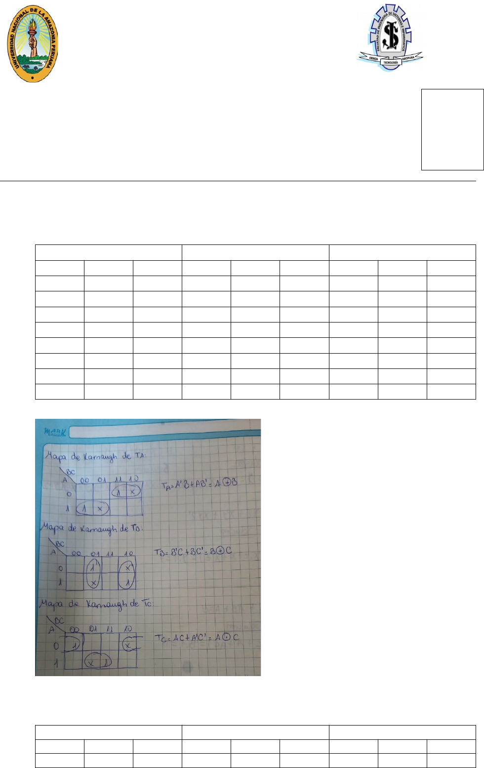 UNIVERSIDA NACIONAL DE LA AMAZONIA PERUANA FACULTAD DE INGENIERIA DE SISTEMAS E INFORMATICA QUINTO EXAMEN DE ELECTRONICA DIGITAL 2022 -I APELLIDOS Y NOMBRES: Davila Cordova Erika Celeste Isabel FECHA : 10/10/2022 NOTA: Profesor : Ing. Alejandro Reategui Pezo Dr. 1. Diseñe con Flip Flops T un contador que pase por la siguiente sucesión binaria repetida: 0, 1, 3, 7, 6, 4. Demuestre que si los estados binarios 010 y 101 se consideran condiciones de indiferencia, el contador podría no funcionar Estado Presente Estado Siguiente Entrada FF A B C A N+1 B N+1 C N+1 TA TB TC 0 0 0 0 0 1 0 0 1 0 0 1 0 1 1 0 1 0 0 1 0 X X X X X X 0 1 1 1 1 1 1 0 0 1 0 0 0 0 0 1 0 0 1 0 1 X X X X X X 1 1 0 1 0 0 0 1 0 1 1 1 1 1 0 0 0 1 Estado Presente Estado Siguiente A B C A N+1 B N+1 C N+1 TA TB TC 0 1 0 1 0 1 1 1 1 1 0 1 0 1 0 1 1 1 2. Diseñe un contador binario sincrónico de cuatro bits con flip flops D (5 puntos.) 3. Diseñe un contador que siga esta sucesión binaria repetida: 0, 1, 2, 3, 4, 5, 6. Use Flip flops JK (5 puntos) Estado Presente Estado Siguiente Entradas FF A B C A(t+1) B(t+1) C(t+1) JA KA JB KB JC KC 0 0 0 0 0 1 0 X 0 X 1 X 0 0 1 0 1 0 0 X 1 X X 1 0 1 0 0 1 1 0 X X 0 1 X 0 1 1 1 0 0 1 X X 1 X 1 1 0 0 1 0 1 X 0 0 X 1 X 1 0 1 1 1 0 X 0 1 X X 1 1 1 0 0 0 0 X 1 X 1 0 X 1 1 1 X X X X X X X X X Estado Presente Estado Siguiente Entradas FF A B C A(t+1) B(t+1) C(t+1) JA KA JB KB JC KC 1 1 1 0 0 0 1 1 1 1 0 1 4. Diseñe un contador que siga esta sucesión binaria repetida: 0, 1, 2, 4, 6. Use Flip flops D. (5 puntos.) Estado Presente Estado Siguiente Entradas FF A B C A(t+1) B(t+1) C(t+1t) DA DB DC 0 0 0 0 0 1 0 0 1 0 0 1 0 1 0 0 1 0 0 1 0 1 0 0 1 0 0 0 1 1 X X X X X X 1 0 0 1 1 0 1 1 0 1 0 1 X X X X X X 1 1 0 0 0 0 0 0 0 1 1 1 X X X X X X Estado Presente Estado Siguiente Entradas FF A B C A(t+1) B(t+1) C(t+1t) DA DB DC 0 1 0 1 1 0 1 1 0 1 0 0 1 1 0 1 1 0 1 1 0 0 1 0 0 1 0 Se calificará orden, limpieza y buen dibujo de los circuitos pedidos La suerte y el triunfo está en tus manos si te preparas para los retos EL PROFESOR