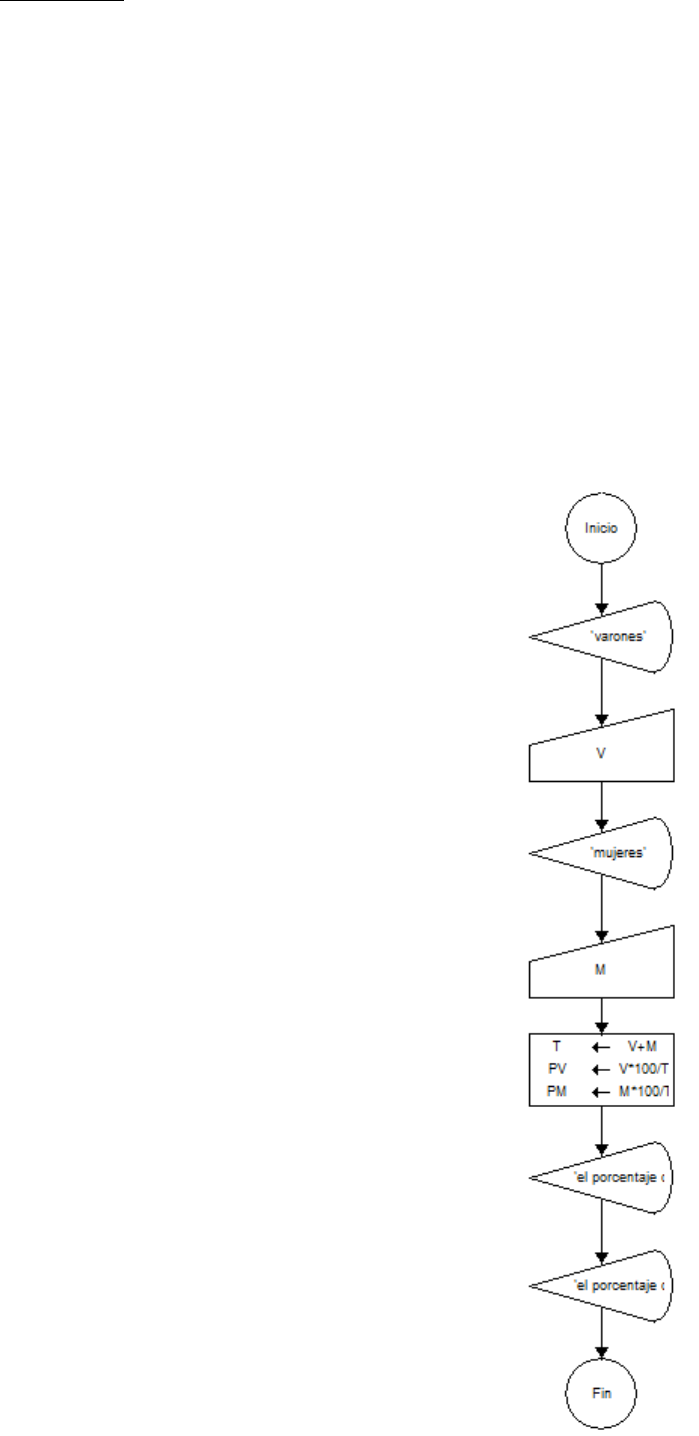 TEXTO N°9: UN DOCENTE DESEA SABER EL PORCENTAJE DE VARONES Y MUJERES QUE HAY EN UN SALON DE CLASES; REALISE EL ALGORITMO RESPECTIVO 1) ANALISIS: T = V+M PV=V*100/T PM=M*100/T 2) REQUISITOS Y ESPECIFICACIONES: Variable entrada V,M Variable intermedia T Variable salida: PV,PM Operadores =, +, *, / 3) RESTRICCIONES: V > 0 M > 0 V IN M IN 4) DIAGRAMA DE FLUJO DE DATOS