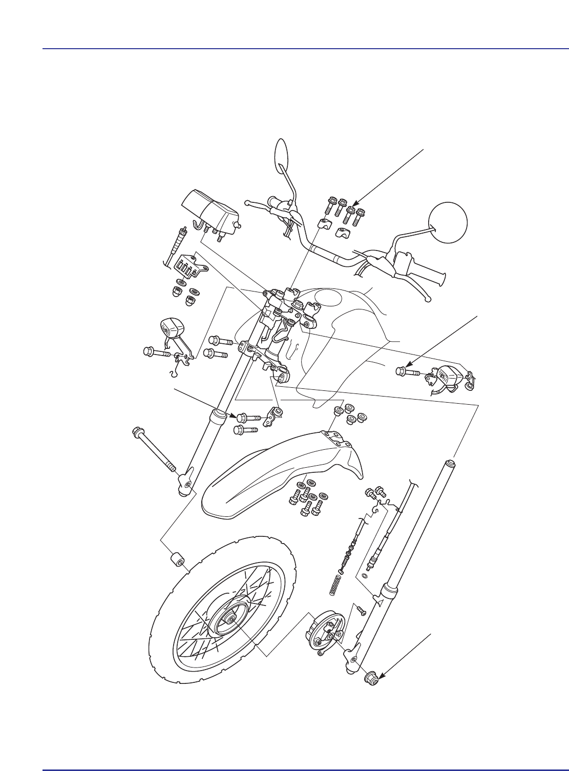 12-0 RUEDA DELANTERA/FRENO/SUSPENSIÓN/DIRECCIÓN NXR125 BROS KS•ES 26 N.m (2,6 kg.m) 22 N.m (2,2 kg.m) 32 N.m (3,2 kg.m) 44 N.m (4,4 kg.m) RUEDA DELANTERA/FRENO/ SUSPENSIÓN/DIRECCIÓN INFORMACIONES DE SERVICIO 12-1 INVESTIGACIÓN DE AVERÍAS 12-3 MANILLAR 12-4 RUEDA DELANTERA 12-11 FRENO DELANTERO 12-16 SUSPENSIÓN DELANTERA 12-19 COLUMNA DE DIRECCIÓN 12-27 12-1 NXR125 BROS KS•ES 12. INFORMACIONES DE SERVICIO INFORMACIONES GENERALES • Un tambor de freno o zapatas de freno contaminados reducen el desempeño del frenado. Deseche las zapatas contaminadas y limpie el tambor contaminada con un agente desengrasante de freno de buena calidad. • Utilice siempre protectores de llantas para evitar que la llanta se dañe cuando se usen palancas para quitar los neumáticos. • Al efectuar trabajos de reparación y de mantenimiento en la rueda delantera, en la suspensión o en la columna de dirección, apoye firmemente la motocicleta en un gato o en un caballete ajustable. ESPECIFICACIONES Unidad: mm Ítem Padrón Límite de servicio Profundidad mínima de los surcos de la banda de rodaje — 3,0 Presión del neumático frío Solamente piloto 150 kPa (1,5 kgf/cm2, 22 psi) — Piloto y pasajero 150 kPa (1,5 kgf/cm2, 22 psi) — Alabeo del eje — 0,2 Excentricidad de la Radial — 2,0 rueda Axial — 2,0 Horquilla Largo libre del resorte 602 588,5 Alabeo del cilindro — 0,2 Fluido recomendado Fluido para suspensión — Nivel del fluido 186 — Capacidad de fluido 171 ± 2,5 cm2 — Freno Holgura libre de la palanca 20 – 30 — Diámetro interior 130 131del tambor de freno Espesor del forro — Hasta el indicador Carga previa del rodamiento de la columna de dirección 0,10 – 0,15 kgf — 12 RUEDA DELANTERA/FRENO/SUSPENSIÓN/DIRECCIÓN 12-2 VALORES DE PAR DE APRIETE Perno superior de la horquilla 22 N m (2,2 kg m) Perno Allen de la horquilla 20 N m (2,0 kg m) Perno del soporte del manillar 26 N m (2,6 kg m) Tuerca de la columna de dirección 103 N m (10,3 kg m) Tuerca de ajuste de la columna de dirección Remítase a la página 12-30 Perno de fijación del puente superior 22 N m (2,2 kg m) Perno de fijación del puente inferior 32 N m (3,2 kg m) Tuerca del eje delantero 44 N m (4,4 kg m) Tuerca del brazo del freno delantero 10 N m (1,0 kg m) Rayos 3,7 N m (0,3 kg m) HERRAMIENTAS NXR125 BROS KS•ES Accesorio, 37 x 40 mm 07746-0010200 Accesorio, 42 x 47 mm 07746-0010300 Guía, 12 mm 07746-0040200 Eje del extractor de rodamientos 07746-0050100 Cabezal del extractor, 12 mm 07746-0050300 Instalador del retén de aceite de la horquilla 07747-0010100 Accesorio del impulsor, 31,2 mm 07747-0010300 Impulsor 07749-0010000 Llave soquete de la columna de dirección 07916-KA50100 RUEDA DELANTERA/FRENO/SUSPENSIÓN/DIRECCIÓN 12-3 NXR125 BROS KS•ES Eje del extractor de pista de esferas 07944-1150001 Impulsor de la columna de dirección 07946-4300101 Extractor del retén de aceite 07748-0010001 Extractor de pista de esferas 07948-4630100 Llave para rayos, 5,8 x 6,1 mm 07701-0020300 INVESTIGACIÓN DE AVERÍAS Dirección dura • Tuerca de ajuste de la columna de dirección demasiado apretada • Rodamientos de la columna de dirección dañados o con defecto • Neumático con defecto • Presión del neumático insuficiente Dirección tirando hacia un lado o no manteniéndose en línea recta • Horquilla torcida • Rodamientos de la columna de dirección dañados o con defecto • Chasis alabeado • Rodamientos de la rueda desgastados • Eje delantero alabeado • Componentes del pivote del brazo oscilante desgastados Rueda delantera bamboleando • Llanta alabeada • Rodamientos de la rueda desgastados • Neumático con defecto • Rueda y neumático desequilibrados Suspensión demasiado blanda • Resortes de la suspensión débiles • Nivel de fluido bajo en la horquilla • Fluido inadecuado • Presión de los neumáticos demasiado baja Suspensión demasiado dura • Presión de los neumáticos demasiado alta • Horquillas alabeadas • Exceso de fluido en la horquilla • Fluido inadecuado • Pasajes del fluido en las horquillas obstruidos Ruidos en la suspensión delantera • Elementos de fijación de las horquillas sueltos • Cantidad insuficiente de fluido en la suspensión Rueda con dificultad para girar • Rodamientos de la rueda con defecto • Eje delantero alabeado • Freno arrastrando • Engranaje del velocímetro con defecto RUEDA DELANTERA/FRENO/SUSPENSIÓN/DIRECCIÓN 12-4 MANILLAR DESMONTAJE Quite las abrazaderas de banda del cableado eléctrico. Quite los espejos retrovisores. ABRAZADERAS DE BANDA DEL CABLEADO ELÉCTRICO ESPEJOS RETROVISORES Quite los pernos de la tapa del soporte del acelerador y la tapa. PERNOS TAPA Desconecte la extremidad del cable del acelerador del tubo interno de la empuñadura y quite el soporte del acelerador. Quite la guía del cable del acelerador. SOPORTE DEL TUBO INTERIOR DE LA ACELERADOR EMPUÑADURA DEL ACELERADOR GUÍA DEL CABLE EXTREMIDAD DEL CABLE DEL ACELERADOR DEL ACELERADOR Suelte los enchufes del interruptor de la luz del freno delantero. Quite el visor delantero (página 2-4). ENCHUFES VISOR DELANTERO NXR125 BROS KS•ES RUEDA DELANTERA/FRENO/SUSPENSIÓN/DIRECCIÓN 12-5 NXR125 BROS KS•ES Quite la empuñadura del acelerador del manillar. Afloje el perno del soporte de la palanca de freno, pero no quite el soporte todavía. Suelte los enchufes del interruptor del embrague. Quite los pernos de la caja de los interruptores del manillar derecho. Quite la caja de los interruptores del manillar derecho. EMPUÑADURA DEL ACELERADOR PERNO ENCHUFES PERNOS CARCASA DE LOS INTERRUPTORES RUEDA DELANTERA/FRENO/SUSPENSIÓN/DIRECCIÓN 12-6 Quite los pernos del soporte de la palanca del embrague y los soportes. SOPORTE SOPORTE PERNOS Quite la empuñadura del manillar izquierdo. EMPUÑADURA DEL MANILLAR IZQUIERDO Quite los pernos del soporte del manillar y los soportes. Quite el manillar. SOPORTES DEL MANILLAR MANILLAR PERNOS Quite los pernos de l