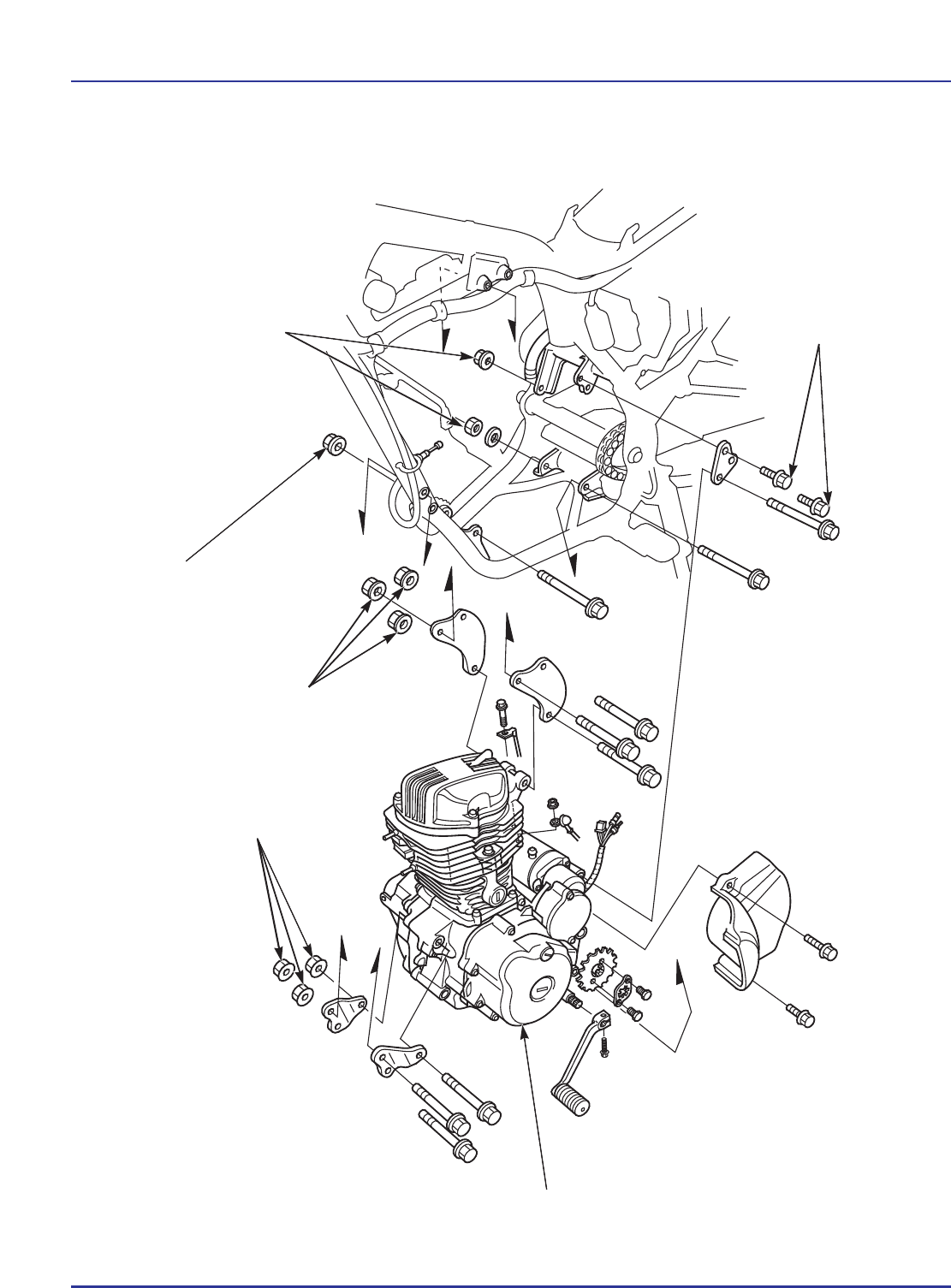 6-0 REMOCIÓN/INSTALACIÓN DEL MOTOR NXR125 BROS KS•ES 60 N.m (6,0 kg.m) 35 N.m (3,5 kg.m) 35 N.m (3,5 kg.m) 26 N.m (2,6 kg.m) 35 N.m (3,5 kg.m) Motor (Tipo ES) REMOCIÓN/ INSTALACIÓN DEL MOTOR INFORMACIONES DE SERVICIO 6-1 REMOCIÓN DE LA RUEDA PROPULSORA DE TRANSMISIÓN 6-3 REMOCIÓN/INSTALACIÓN DEL MOTOR 6-4 INSTALACIÓN DE LA RUEDA PROPULSORA DE TRANSMISIÓN 6-8 6-1 NXR125 BROS KS•ES 6. INFORMACIONES DE SERVICIO INFORMACIONES GENERALES • Utilice un gato hidráulico o un caballete para apoyar la motocicleta durante la remoción e instalación del motor. • Para apoyar y manipular el motor, utilice un gato hidráulico u otro soporte ajustable. • Antes de la remoción/instalación del motor, proteja la región del bastidor alrededor del motor utilizando una cinta adhesiva de protección. • Los siguientes componentes se pueden reparar con el motor instalado en el bastidor. – Alternador (capítulo 10) – Árbol de levas (capítulo 8) – Carburador (capítulo 5) – Embrague y selector de marchas (capítulo 9) – Culata (capítulo 7) – Generador de impulsos del encendido (capítulo 15) – Motor de arranque (solamente tipo ES: capítulo 16) – Cilindro/pistón (capítulo 8) – Bomba de aceite (capítulo 4) • Para efectuar reparaciones y mantenimiento en los siguientes componentes, es necesario quitar el motor: – Cigüeñal (capítulo 11) – Horquillas del cambio de marchas, tambor del cambio de marchas (capítulo 9) – Transmisión (capítulo 11) • Los siguientes componentes se deben quitar antes de la remoción del motor: – Tubo de escape/silenciador (capítulo 2) – Tanque de combustible(capítulo 2) – Carburador (capítulo 5) – Cable del embrague (capítulo 9) – Enchufe del generador de impulsos (capítulo 15) – Enchufe 4P del alternador/interruptor del punto muerto (capítulo 14) – Cableado eléctrico del motor de arranque (solamente tipo ES: capítulo 16) • Después de instalar el motor, efectúe los siguientes ajustes: – Cable del embrague (página 3-18) – Cadena de transmisión (página 3-13) – Cable del acelerador (página 3-4) – Nivel de aceite del motor (página 3-10) 6 REMOCIÓN/INSTALACIÓN DEL MOTOR 6-2 ESPECIFICACIONES Ítem Especificaciones Peso seco del motor Tipo ES 29,6 kg Tipo KS 27,9 kg Capacidad de aceite en el motor, después del desarmado 1,1 litro NXR125 BROS KS•ES VALORES DE PAR DE APRIETE Tornillos/tuercas del soporte delantero superior del motor 35 N m (3,5 kg m) Tornillo/tuerca de fijación delantera superior del motor 35 N m (3,5 kg m) Tornillo/tuerca de fijación delantera inferior del motor 35 N m (3,5 kg m) Tornillos del soporte trasero superior del motor 26 N m (2,6 kg m) Tornillo/tuerca de fijación trasera superior del motor 60 N m (6,0 kg m) Tornillo/tuerca de fijación trasera inferior del motor 60 N m (6,0 kg m) Tornillos/tuercas del soporte superior del motor 35 N m (3,5 kg m) Tornillo/tuerca de fijación superior del motor 35 N m (3,5 kg m) Tuerca del eje trasero 93 N m (9,3 kg m) REMOCIÓN/INSTALACIÓN DEL MOTOR 6-3 NXR125 BROS KS•ES PREMOCIÓN DE LA RUEDA PROPULSORA DE TRANSMISIÓN Antes de quitar el pedal del cambio de marchas, marque el eje para instalarlo en la posición correcta. Quite el tornillo del pedal del cambio de marchas y el pedal. Afloje la tuerca del eje trasero y ambas tuercas de ajuste y las contratuercas de la cadena de transmisión. Quite la varilla del freno trasero del brazo del freno (página 13-13) Empuje la rueda trasera hacia adelante dejando la cadena de transmisión con la holgura máxima. Quite los siguientes componentes: – Tornillos de la placa de fijación de la rueda propulsora de transmisión – Placa de fijación de la rueda propulsora de transmisión – Rueda propulsora de transmisión Quite los tornillos de la tapa de la rueda propulsora de transmisión y la tapa. TORNILLO PEDAL DEL CAMBIO DE MARCHAS CADENA DE TUERCA DEL EJE TRASERO TRANSMISIÓN VARILLA DEL FRENO PLACA DE FIJACIÓN TORNILLOS DE LA PLACA DE FIJACIÓN TAPA DE LA RUEDA PROPULSORA DE TRANSMISIÓN TORNILLOS DE LA TAPA DE LA RUEDA PROPULSORA DE TRANSMISIÓN TUERCA DE AJUSTE/ CONTRATUERCA DE LA CADENA DE TRANSMISIÓN RUEDA PROPULSORA DE TRANSMISIÓN REMOCIÓN/INSTALACIÓN DEL MOTOR 6-4 REMOCIÓN/INSTALACIÓN DEL MOTOR REMOCIÓN Vea en la página 6-1 las piezas que deben quitarse antes de la remoción del motor. Coloque un gato hidráulico o un caballete ajustable debajo del motor. NOTA Drene el aceite del motor (página 3-11). Desconecte el cable negativo (-) del terminal de la batería (página 14-6). Desconecte el supresor de ruido de la bujía de encendido. Quite la rueda propulsora de transmisión (página 6-3). Quite el resorte de rechazo del freno trasero. La altura del gato hidráulico o del caballete se debe ajustar periódicamente para evitar esfuerzos excesivos y para facilitar la remoción de los tornillos. SUPRESOR DE RUIDO DE LA BUJÍA DE ENCENDIDO Quite los siguientes componentes: – Tornilllo/tuerca de fijación superior del motor (8 mm) – Tornillos/tuercas del soporte superior del motor (8 mm) y los soportes SOPORTES TORNILLOS/TUERCAS Quite los siguientes componentes: – Tornillo/tuerca de fijación delantera superior del motor (8 mm) – Tornillos/tuercas del soporte delantero superior del motor (8 mm) y los soportes SOPORTES TORNILLOS/TUERCAS RESORTE DE RECHAZO NXR125 BROS KS•ES REMOCIÓN/INSTALACIÓN DEL MOTOR 6-5 NXR125 BROS KS•ES Quite los siguientes componentes: – Tornillo/tuerca de fijación trasera superior del motor (10 mm) y los collarines. – Tornillos de fijación del soporte trasero del motor (8 mm) y el soporte. Suelte la manguera del respiradero del motor y desconéctela de la carcasa del motor. Quite el tornillo/tuerca de fijación trasera inferior del motor (10 mm) y el collarín. Quite el motor por el lado izquierdo del bastidor. NOTA Mientras quita el motor, sujételo firmemente y tenga cuidado para no dañar ni el bastidor ni el motor. INSTALACIÓN