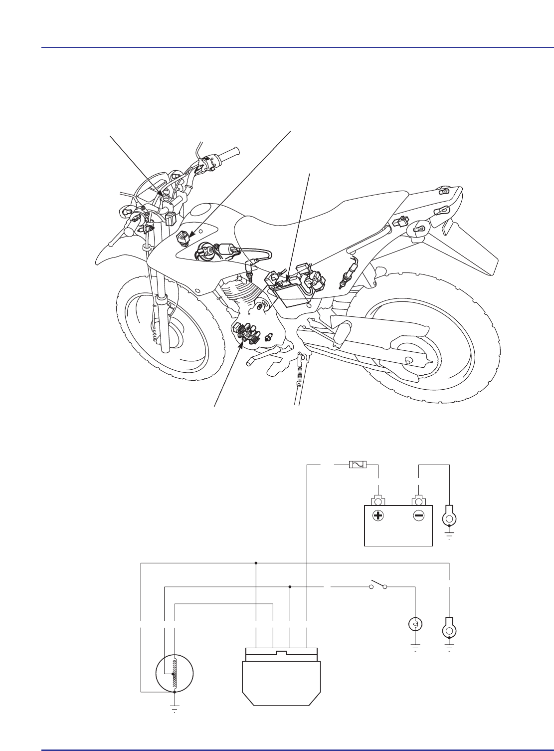 14-0 G W Y 1 G WY Y G GR * 1 BATERIA/SISTEMA DE CARGA NXR125 BROS KS•ES DIAGRAMA DEL SISTEMA INTERRUPTOR DE ENCENDIDO REGULADOR/ RECTIFICADOR REGULADOR/ RECTIFICADOR FUSIBLE 15A INTERRUPTOR DE ILUMINACIÓN FARO/LUZ TRASERA ALTERNADOR BATERIA ALTERNADOR * 1 TIPO ES: R / W TIPO KS: RBATERIA 12V-4AH BL : NEGRO W : BLANCO Y :AMARILLO R : ROJO G : VERDE P : ROSADO BATERIA/ SISTEMA DE CARGA14. DIAGRAMA DEL SISTEMA 14-0 INFORMACIONES DE SERVICIO 14-1 INVESTIGACION DE AVERIAS 14-3 BATERIA 14-6 INSPECCION DEL SISTEMA DE CARGA 14-7 INSPECCION DEL ALTERNADOR 14-8 REGULADOR/RECTIFICADOR 14-9 INFORMACIONES DE SERVICIO GENERAL d • Desactive siempre el interruptor de encendido antes de desconectar cualquier componente eléctrico. i • En caso de que la motocicleta vaya a permanecer almacenada durante un período de tiempo prolongado, quite la batería, cárguela totalmente y manténgala en un local seco y ventilado. Para aumentar su vida útil, cargue la batería almacenada cada dos semanas. • En caso de que la batería vaya a permanecer en una motocicleta almacenada, suelte el cable negativo del terminal de la batería. i • La batería se puede dañar en caso de que reciba carga insuficiente o en exceso, o si permanece descargada durante un largo período de tiempo. Esas mismas condiciones también disminuyen su vida útil. Aun en condiciones normales de uso, el desempeño de la batería disminuirá después de 2 ó 3 años. • La tensión de la batería se puede recuperar después de la carga; pero, si el consumo es muy grande, la tensión disminuirá rápidamente y eventualmente acabará. Por ese motivo, el sistema de carga se considera frecuentemente como siendo la causa del problema. Una sobrecarga en la batería, que puede aparentar ser un síntoma de sobrecarga, es normalmente el resultado de problemas en la propia batería. En caso de que una de las celdas esté en cortocircuito y la tensión de la batería no aumente, el regulador/rectificador suministrará tensión en exceso para la batería. Bajo esas condiciones, el nivel del electrólito disminuirá rápidamente. • Antes de efectuar la investigación de averías del sistema de carga, verifique si el mantenimiento de la batería se ha efectuado correctamente y si la batería fue utilizada adecuadamente. Verifique si la batería se somete constantemente a consumo excesivo, tal como uso prolongado del faro y de la luz trasera sin que la motocicleta esté siendo conducida. • La batería se descargará en caso de que la motocicleta no esté en uso. Por esa razón, cargue la batería cada dos semanas para evitar que ocurra sulfatación. No se deben quitar las tapas de la batería. Si se quitan las tapas de sellado de las celdas, la batería se puede dañar. Algunos componentes eléctricos se pueden dañar en caso de que los terminales o conectores se conecten o desconecten mientras el interruptor de encendido esté accionado y haya circulación de corriente eléctrica. • La batería produce gases explosivos. No fume y mantenga llamas y chispas alejadas. Trabaje en un local bien ventilado al cargar la batería. • La batería contiene ácido sulfúrico (electrólito). En contacto con la piel o con los ojos puede causar serias quemaduras. Utilice ropas protectoras y una protección en el rostro. • En caso de contacto con la piel, lávela con bastante agua y busque auxilio médico inmediatamente. • En caso de contacto con los ojos, lávelos con bastante agua, como mínimo, durante 15 minutos y busque auxilio médico inmediatamente. • El electrólito es venenoso. • En caso de ingestión, beba bastante agua, leche de magnesia o aceite vegetal y busque auxilio médico inmediatamente. • MANTENER FUERA DEL ALCANCE DE LOS NIÑOS. 14-1 NXR125 BROS KS•ES 14 BATERIA/SISTEMA DE CARGA 14-2 • Abastecer una batería nueva con electrólito producirá algo de tensión. Pero, para que alcance su desempeño máximo, siempre cargue la batería. También, la vida útil de la batería aumenta cuando se le aplica una carga inicial. • Al verificar el sistema de carga de la batería, siga siempre las etapas en la tabla de flujo de investigación de averías (página 14-3). Carga de la batería Este modelo viene equipado con una batería libre de mantenimiento (MF). Recuerde lo siguiente acerca de las baterías MF: – Utilice solamente el electrólito que viene con la batería. – Utilice todo el electrólito. – Selle adecuadamente la batería. – Nunca abra nuevamente los sellos. ESPECIFICACIONES NXR125 BROS KS•ES Ítem Especificaciones Batería Capacidad 12 V – 4 Ah Fuga de corriente 0,01 mA máx. Tensión (20°C) Totalmente cargada Superior a 12,8 V Necesidad de carga Inferior a 12,3 V Corriente de carga Normal Rápida 0,4 A/5 – 10 h 4,0 A/0,5 h Alternador Capacidad 0,088 kW/5.000 rpm Resistencia de la bobina de carga (20°C) 0,3 – 1,1 Ω Resistencia de la bobina de iluminación (20°C) 0,2 – 1,0 Ω BATERIA/SISTEMA DE CARGA 14-3 INVESTIGACION DE AVERIAS BATERIA DAÑADA O DESCARGADA NXR125 BROS KS•ES 1. Quite la batería (pág. 14-6). Verifique las condiciones de la batería utilizando el probador recomendado. Probador de baterías recomendado: BM-210-AH o BM-210 BATTERY MATE o equivalente Incorrecta Correcta Correcta Incorrecta • Batería con defecto. Incorrecta • Bobina de carga con defecto. Correcta • El sistema de carga está normal. 2. Instale la batería (pág. 14-6). Verifique la fuga de corriente de la batería (prueba de fuga de corriente, pág. 14-8). Padrón: 0,01 mA máximo Correcta Incorrecta 3. Verifique la bobina de carga del alternador (pág. 14-8). Padrón: 0,3 – 1,1 Ω (20°C) 4. Quite la batería (pág. 14-6). Mida y anote la tensión de la batería utilizando un multímetro digital (pág.14-6). Instale la batería (pág. 14-6). Arranque el motor. Mida la tensión de carga (pág. 14-7). Compare las mediciones al resultado del siguiente cálculo: Padrón: Tensión de la batería medida < tensió