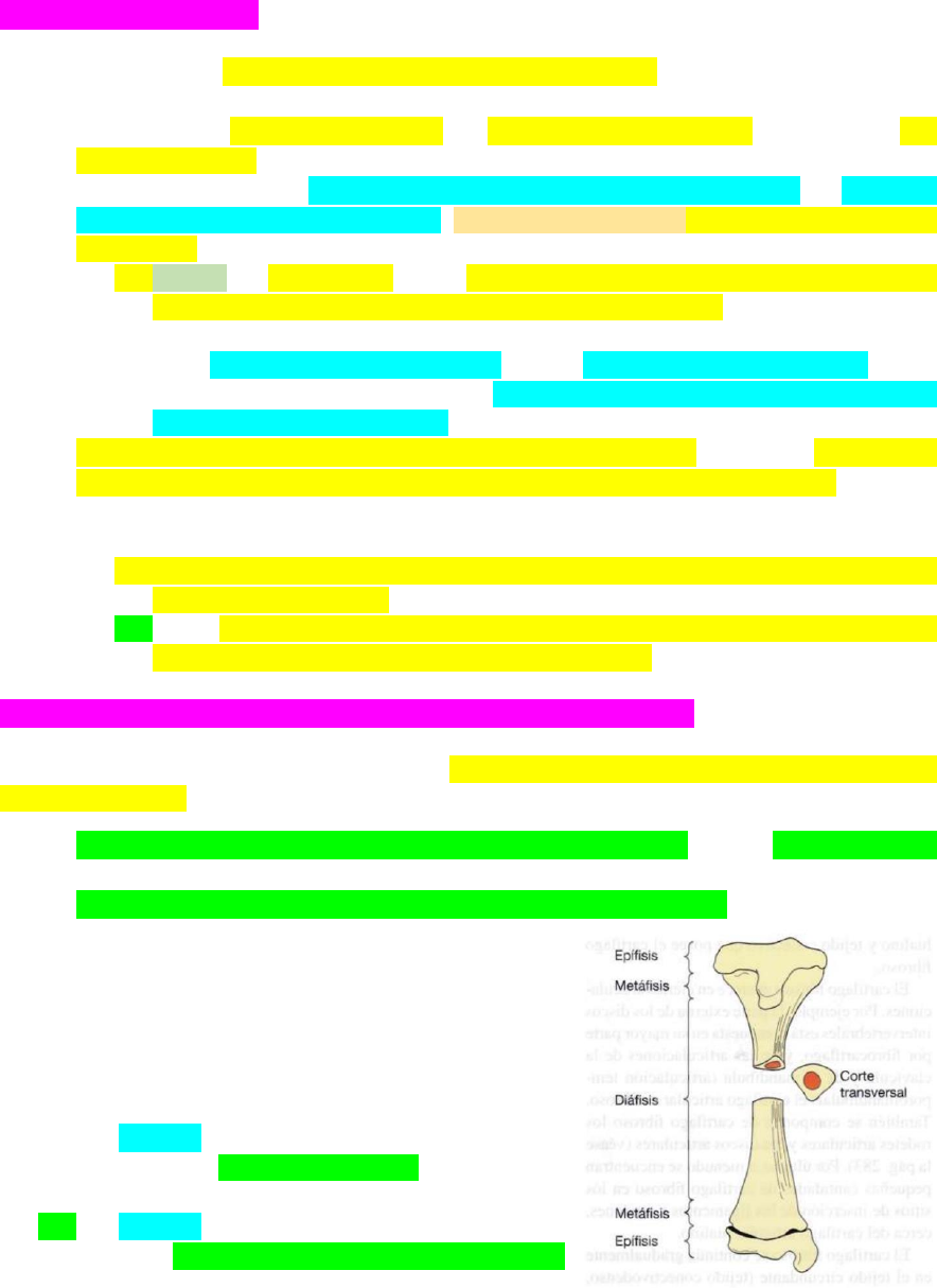 TEJIDO OSEO – HISTOLOGÍA 1. GENERALIDADES • El tejido óseo representa la parte principal del esqueleto. • Es un material relativamente liviano, de gran dureza y resistencia, pero también con cierta elasticidad. • El tejido óseo es una forma especializada de tejido conectivo denso, se compone de células y una matriz extracelular. La dureza surge de la calcificación de la matriz extracelular. o NOTA: La calcificación es un proceso en el cual el calcio se acumula en el tejido corporal, haciendo que dicho tejido se endurezca o La característica que distingue el tejido óseo de los otros tejidos conjuntivos es la mineralización de su matriz, la cual produce un tejido muy duro capaz de proveer sostén y protección. El mineral es fosfato de calcio en la forma de cristales de hidroxiapatita [Ca,0(PO4)6(OH)2]. • La función principal: formar parte de órganos de sostén, dado que actúa como barra de pesas de los músculos insertados y brinda rigidez al organismo, asi como proteccion contra la fuerza de gravedad. • Otras funciones: o protectora al rodear el encéfalo y la médula espinal y parte de los órganos del tórax y el abdomen o Es un eslabón importante en la homeostasis del calcio dado que los huesos contienen más del 99% del calcio del organismo 2. ORGANIZACIÓN MACROSCÓPICA DEL TEJIDO ÓSEO Desde el punto de vista macroscópico, el tejido óseo se organiza en los huesos de dos formas diferentes: − Tejido óseo compacto o cortical (sustancia compacta): es una masa compacta sin espacios visibles − Tejido óseo trabecular o esponjoso (sustancia esponjosa): está compuesto por finos listones u hojas, las trabéculas, que se entrecruzan en distintas direcciones y forman un reticulado esponjoso, en cuyos espacios huecos intercomunicados se encuentra la médula óseaCasi todos los huesos se componen de tejido óseo cortical y trabecular, un ejemplo de esto son los huesos largos: − La Diáfisis (es decir, la parte central): se compone de tejido óseo cortical que rodea el espacio medular − La Epífisis (es decir, los extremos de los huesos): se compone de tejido óseo trabecular o esponjoso, que sólo en la parte más externa se transforma en una fina capa de tejido óseo cortical. − La Metáfisis (es decir, la transición entre la diáfisis y la epífisis): durante el crecimiento, esta separada de la epífisis por un disco de cartílago llamado el disco epifisario, donde se produce el crecimiento longitudinal del hueso. Salvo las superficies articulares recubiertas de cartílago: − Las superficies externas de los huesos están rodeadas pro una capa de tejido conectivo denso llamada el periostio − Una delgada membrana interior de tejido conectivo con células (células osteogénicas) abundantes llamado el endostio 3. CARACTERÍSTICAS HISTÓLOGICAS DEL TEJIDO ÓSEO Tejido óseo cortical: − Contiene sistemas de Havers u osteonas corticales: forma un cilindro longitudinal en el hueso o En la parte central de un sistema de Havers, se encuentra un conducto longitudinal, el conducto de Havers, cada conducto contiene capilares, fibras nerviosas y tejido conectivo. o Alrededor del conducto de Havers, la matriz ósea se dispone en laminillas concéntricas ▪ Un sistema de Havers característico contiene unas 15 laminillas, compuestas casi con exclusividad por fibras de colágeno (tipo 1) ▪ Entre los sistemas de Havers se detectan restos de laminillas provenientes de sistemas de Havers degradados, denominados laminillas intersticiales. o Justo por debajo del periostio y el endostio se encuentra una capa relativamente delgada de laminillas de disposición plana: a) las laminillas circunferenciales externas (debajo del periostio) b) e internas (debajo del endostio) o Los sistemas de Havers tienen límites netos denominados líneas de cemento, que contienen relativamente escasas fibras colágenas y están muy mineralizados. − En la constitución histológica se pueden identificar canalículos, que son canales estrechos por donde transcurren las células óseas (osteocitos), de este modo, los osteocitos pueden recibir y secretar sustancias − Otro sistema de canales conductores de vasos: los conductos de Volkmann, comunican los conductos de Havers entre sí y con las superficies externa e interna del hueso. Los conductos de Volkmann atraviesan el tejido óseo en sentido casi transversal Tejido óseo trabecular - También compuesto por laminillas pero no en la forma de sistemas de Havers - Constituido por osteonas trabeculares que tienen la forma de un disco plano, el cual está formado por alrededor de 20 laminillas de transcurso paralelo a la superficie del disco. constituidas de la misma forma que en el hueso cortical - En el tejido óseo trabecular no se encuentran conductos de Havers ni conductos de Volkmann y, por lo tanto, no hay vasos sanguíneos. - NOTA: La osteona también se denomina unidad estructural ósea y presenta distinta conformación en la osteona segmento de la cortical y en la osteona trabecular. _ MICROSCÓPICAMENTE podemos dividir los huesos según su nivel de maduración en 2 tipos: hueso primario y hueso secundario a) Hueso primario, Entretejido o No Laminar - Es inmaduro, posee osteocitos - Se forma durante el desarrollo fetal y en la reparación ósea, se reemplaza por hueso secundario con el tiempo, a excepción de algunas áreas. - Tiene un alto grado celular pero un bajo grado de calcificación - Su matriz extracelular en el hueso inmaduro todavía no se llena, por así decirlo, o no se adhieren entre sí al osteoide y el material inorgánico de la matriz extracelular no está calcificado - Eventualmente cuando se calcifique de forma correcta este hueso inmaduro formará al hueso secundario o hueso maduro. - Durante la formación de los huesos y en el caso de fracturas, primero se forma tejido óseo inmaduro que no tiene disposición laminar. Las fibras colágenas transcurren en un entretejido aleatorio; este tipo de tejido óseo se