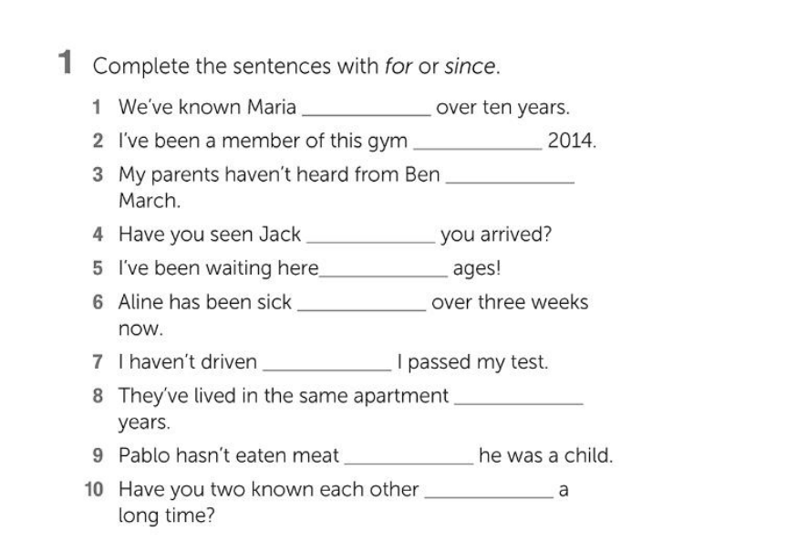 FULL NAME: Choez Cruz Jennifer 1.- for 2.- since 3.- since 4.- for 5.- for 6.- for 7.- since 8.- for 9.- since 10.- for FULL NAME: Choez Cruz Jennifer 1.- She has been a teacher for 2.- I’ve been there for two months. 3.- How long has Gabriela since a vegetarian? 4.- How many years have you and Peter since married? 5.- How long has your father un the army? 6a.- How long have you study medicine? b.- I studied for eight years, until 2014.