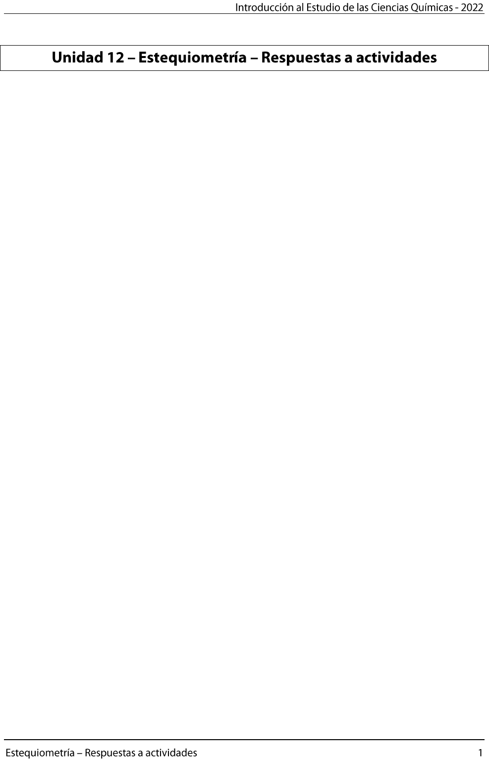 ► Actividad 1 Marque la opción que considere correcta. 1) La fórmula química del ácido sulfúrico es: c) H2SO4 2) En 44 gramos de CO2 hay: b) 1 mol de moléculas de CO2 3) En 111 gramos de Ca(HO)2 hay: d) 1,5 mol de moléculas de Ca(HO)2 4) Una de las posibles reacciones químicas para la obtención del carbonato de sodio está representada en la siguiente ecuación química: 2 3 (ac) (ac) 2 3 (ac) 2 (l)b) H CO + 2 NaHO Na CO + 2 H O 5) La masa de una molécula de Cl2O es: c) 87 u.m.a. 6) 2 mol de H3PO4 contienen: d) 2348,16 × 10 átomos de oxígeno 7) La fórmula del hidrógeno tetraoxofosfato (V) de hierro (II) es: c) FeHPO4 ► Actividad 2 1) Calcular la masa molecular de los siguientes compuestos: a) H2O b) (NH4)2Cr2O7 · 5 H2O c) HNO3 a) 18 u.m.a. b) 342 u.m.a. c) 63 u.m.a. 2) Calcular la masa de 3 y de 5 mol de “moléculas” de: a) K2O b) Fe2O3 c) PH3 a) 282,6 g y 470,0 g b) 479,1 g y 798,5 g c) 102,0 g y 170,0 g 3) ¿A cuántos moles de moléculas equivalen las masas de los siguientes compuestos? a) 5 g de H2O b) 10 g de C6H6 c) 68 g de HCl a) 0,277 mol b) 0,128 mol c) 1,86 mol 4) ¿Cuántas moléculas hay en la masa indicada de cada compuesto listado en el ejercicio 3? a) 231,67 × 10 moléculas b) 227,71 × 10 moléculas c) 241,12 × 10 moléculas 5) Calcular la composición porcentual de los siguientes compuestos: a) Al2O3 b) C3H6O2 c) NaCl a) Al= 55%; O= 47% b) C=48,6%; H=8,2%; O=43,2% c) Na=39,3%; Cl=60,7% 6) Calcular el porcentaje de calcio en los siguientes compuestos: a) CaO b) Ca(HO)2 c) CaCO3 a) Ca=71,4% b) Ca=54,1% c) Ca=40,0% 7) Al calentar 9,7 g de un hidrato de sulfato de cobre, CuSO4 x H2O, se pierden 3,5 g de H2O, que es toda el agua que tenía la muestra. ¿Cuántos moles de H2O hay por mol de CuSO4 en el hidrato? 5 mol de agua 8) Un alimento granulado, soluble instantáneo con gusto a cacao, se presenta fortificado con hierro y vitaminas, de acuerdo a la siguiente composición por cada 100,0000 g de este alimento: Vitamina B1 5,2 mg Vitamina B2 4,0 mg Vitamina B6 5,0 mg Vitamina PP 45 mg Hierro 23 mg La siguiente tabla consigna las dosis diarias recomendadas por la FAO/OMS para los niños: Vitamina B1 1,4 mg Vitamina B2 1,6 mg Vitamina B6 2,0 mg Vitamina PP 18 mg Hierro 14 mg ¿Qué porcentaje de estas necesidades quedarían cubiertas al ingerir 25,0000 g de este alimento? B1=92,9 % B2=62,5 % B6=62,5 % PP=62,5 % Fe=41,0% ► Actividad 3 1) Teniendo en cuenta las discusiones previas, explique la diferencia entre transformación química, fenómeno químico, reacción química y ecuación química. Transformación química: Proceso o cambio químico que tiene asociado un estado inicial, un estado final y condiciones específicas para que se produzca dicha transformación. Fenómeno químico: Transformación química cuyo cambio es perceptible por algún sentido. Reacción química: es simplemente una representación. 2) Lea las siguientes afirmaciones. Justifique aquellas que considere verdaderas, y a aquellas que considere falsas, rescríbalas correctamente justificando su respuesta. a) Una transformación química es siempre un fenómeno químico: FALSA b) Todo fenómeno químico es siempre una transformación química: VERDADERA c) Todo fenómeno químico tiene una reacción química asociada, aunque puede suceder que no siempre se conozca la ecuación química que la representa: VERDADERA d) Una ecuación química es la representación simbólica de una transformación, fenómeno o reacción química, de la cual se conocen las fórmulas moleculares que le dan identidad a los compuestos químicos que participan: VERDADERA e) Una transformación química puede tener un fenómeno químico asociado y tener una ecuación química conocida: VERDADERA f) No toda reacción química está asociada a una ecuación química conocida: VERDADERA ► Actividad 4 1) Elija la opción que le permita solucionar este problema aplicando el principio de Avogadro – Ampere que sostiene lo siguiente: Volúmenes iguales de gases diferentes contienen igual número de moléculas cuando son medidos en iguales condiciones de presión y temperatura. a) Manteniendo constante el volumen y la cantidad de moles de oxígeno molecular, disminuimos a la mitad el volumen y los moles de hidrógeno molecular, y se formará igual volumen y cantidad de moles de agua que los moles de oxígeno molecular iniciales. Respuesta: se forman ............1............. mol de agua. Es solución del problema: NO. b) Manteniendo constante el volumen y la cantidad de moles de hidrógeno molecular, duplicamos el volumen y la cantidad de moles de oxígeno y se formará igual volumen y cantidad de moles de agua que los moles de hidrógeno molecular iniciales. Respuesta: se forman ............1.................. mol de agua. Es solución del problema: NO. c) Manteniendo constante el volumen y la cantidad de moles de oxígeno molecular, duplicamos el volumen y la cantidad de moles de hidrógeno molecular y se duplica la cantidad de moles de agua. Respuesta: se forman ........2...................... mol de agua. Es solución del problema: SÍ 2) Para demostrar lo anterior, le proponemos que analice las siguientes transformaciones químicas. 2 (gas) 2 (gas) 2 (gas)2 H + O 2 H O 2 (gas) 2 (gas) 2 2 (gas)H + O H O Establezca las diferencias entre las dos transformaciones químicas. Responda justificando su respuesta. a) Ambas tienen los mismos reactantes. VERDADERA b) Ambas tienen los mismos productos. FALSA c) Ambas tienen iguales coeficientes estequiométricos. FALSA d) Ambas tienen iguales atomicidades en la molécula (subíndices) en los reactantes y en los productos. FALSA e) Ambos productos tienen las mismas propiedades físicas y químicas. FALSA ► Actividad 5 Balancear las siguientes ecuaciones químicas: a) b) c) d) e) f) g) h) i) j) k) l) ll) m) n) 2(g) 2 (l) 2 3(ac) SO + H O H SO ñ) 3(g) 2 (l) 2 4(ac) SO + H O H SO o) 3(ac) (ac) 3(ac) 2 (l) HClO + Na(HO) NaClO + H O p) q) r) s) t) u) 13 ► Activid