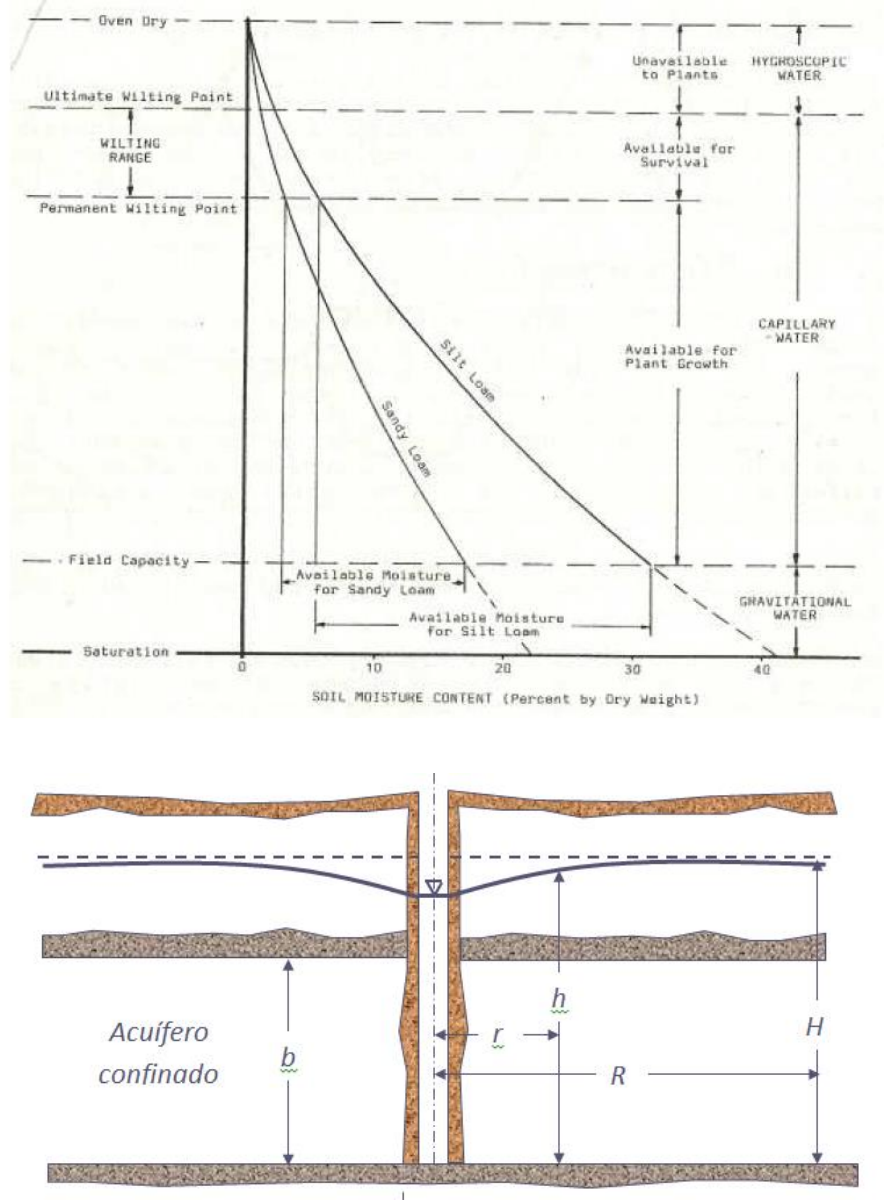 Macaya, Felipe Teóricas Riego 1. Grafique las curvas tensión – contenido de hídrico, para dos texturas de suelo diferentes, indique valores referenciales de humedad de suelo, rango de agua útil, etc. 2. Grafique un acuífero confinado y uno libre, y mencione que características diferenciales poseen. Macaya, Felipe Teóricas Riego Acuífero Libre: Se encuentra a presión atmosférica No posee techo (Acuitardo) No posee un lugar específico de recarga El Nivel Estático es donde llega el agua El techo o superficie freática es fluctuante con las precipitaciones, riego, sequías, etc. Acuífero Confinado: Se encuentra bajo presión (mayor a la atmosférica) Si posee techo (Acuitardo) Posee un lugar específico de recarga El Nivel Estático es por encima del techo del acuífero (Acuitardo) El espesor del acuífero es menos variable. 6. Mencione que métodos conoce para calcular Precipitación media mensual y Precipitación Efectiva y explíquelos brevemente. Precipitación Efectiva: A. Método “Boreau of Reclamation USA” B. Método de Blaney C. Método del USDA - A: Sólo tiene en cuenta la cantidad de agua caída. Los mm de precipitación real se expresan en escala creciente de 25 en 25. Por cada aumento de 25mm se le otorga un coeficiente de aprovechamiento decreciente. Ejemplo: 25 x 0,9 = 22,5 (rango de pp = 0 – 25); (>25 – 50) = 22,5 + 25 x 0,85 = 43,75) - B: Similar a A, varía el coeficiente de aprovechamiento. (0 – 25) Coef.= 0,95 - C: Tiene en cuenta la precipitación total, Evapotranspiración y la Humedad del suelo. Los valores de pp efectiva se calculan a partir de los valores mensuales de pp total y evapotranspiración potencial. // + Factor de conversión por almacenamiento de diferentes suelos. Precipitación media mensual: A. Método de la media aritmética simple. B. Método de Thiessen C. Método de las isohietas Macaya, Felipe Teóricas Riego - A: Consiste en hacer un promedio aritmético de las precipitaciones medias en las distintas estaciones del área. Se obtienen resultados confiables en zonas llanas, si los pluviómetros están distribuidos uniformemente y el valor obtenido en cada uno de ellos no difiere mucho del promedio general. ∑ - B: Sus resultados son generalmente más exactos que los obtenidos por el método anterior, aunque tampoco considera las posibles influencias topográficas, por lo que resulta preciso para zonas llanas. Se basa en otorgar a cada pluviómetro un área de influencia determinada geométricamente. - C: Es el más exacto y el único adecuado para zonas de relieve marcado. Debe ser aplicado por personal entrenado y con conocimiento de la topografía local, pues un mal análisis hecho conduce a errores apreciables. Consiste en ubicar las estaciones sobre un mapa a escala, con los correspondientes valores de PP, y trazar sobre el mismo las isohietas o líneas de igual PP. 7. Qué elementos considera el método de BLANNEY CRIDDLE y PENMAN para el cálculo de ETo? Qué incorpora FAO? Blanney – Criddle: Temperatura (T) y horas diurnas (p) } variables climáticas para predecir los efectos del clima sobre la Et. Con ambas variables se construye el “factor de uso consuntivo”: f = (0,46 T + 8,13) x p Método de Penman modificado por FAO: Cuando se puede disponer de datos medidos de temperatura, humedad, viento y de unidades de radiación o de insolación, se sugiere utilizar este método, ya que posiblemente los resultados se aproximen más a las necesidades de los cultivos FAO: - N/N (Heliofanía y Nubosidad). - HR mínima; Velocidad del viento. - Velocidad del viento. 12. Mencione las Directrices de FAO, para Clasificación de Aguas para Riego, y explique brevemente en que consisten. Salinidad, Infiltración, Toxicidad por iones específicos y Efectos diferentes. Problema potencial Grado de restricción Unidades NINGUNO LIG. A MOD. SEVERO Salinidad (CEa) (TSS) dS/m mg/l < 0,7 < 450 0,7 - 3,0 450 – 2000 > 3,0 > 2000 Infiltración RAS: 0-3 y CEa: dS/m > 0,7 0,7 – 0,2 < 0,2 Macaya, Felipe Teóricas Riego RAS: 3-6 y CEa: RAS: 6-12 y CEa: RAS: 12-20 y CEa: RAS: 20-40 y CEa: dS/m dS/m dS/m dS/m > 1,2 > 1,9 > 2,9 > 5 1,2 – 0,3 1,9 – 0,5 2,9 – 1,3 5 – 2,9 < 0,3 < 0,5 < 1,3 < 2,9 Toxicidad de iones específicos - Riego por gravedad Sodio (Na + ): RAS Cloro (Cl - ) - Riego por aspersión Sodio (Na + ) Cloro (Cl - ) Boro (B) Oligoelementos meq/l meq/l meq/l mg/l < 3 < 4,0 < 3,0 < 3,0 < 0,7 3 – 9 4,0 – 10,0 > 3,0 > 3,0 0,7 – 3,0 > 9 > 10,0 > 3,0 Efectos diversos Nitrógeno (NO3 - ;H): Bicarbonato (CO3H - ): (únicamente para aspersión foliar) PH Rango aceptable: 6,8 – 8,4 mg/l meq/l < 5,0 < 1,5 5 – 30 1,5 – 8,5 > 30 > 8,5 24. Grafique el Teorema de Bernoulli, identificando los componentes de la energía, para una situación ideal y una real. Macaya, Felipe Teóricas Riego 25. Grafique las curvas Caudal Presión y de eficiencia, de una bomba centrifuga horizontal, para el caso de tres regímenes de funcionamiento 1500, 1700 y 1900 rpm. 29. Grafique un Aforador Parshall en CORTE y PLANTA, indicando sentido de la corriente liquida, especificando sus principales características dimensionales. En que caso aconsejaría su utilización. Macaya, Felipe Teóricas Riego Uso: En áreas de escasas pendientes y en propiedades, generalmente sistematizadas para riego con desniveles perfectamente establecidos, su uso es muy indicado y frecuente. Se adapta a mediciones de un elevado rango de caudales (Q). Ventajas: 1) No determina pérdidas de carga de magnitud. Las pérdidas de carga pueden calcularse a priori. 2) Es muy exacto en condiciones de funcionamiento variable. Permite lecturas que arrojan medición de caudales con un 3% de error cuando trabajan libres, y del 5% cuando lo hacen sumergidos. 3) Se adapta a mediciones de un elevado rango de caudales, incluso pequeños, que otros dispositivos no logran determinar con precisión. 4) No acumula sedimentos ni elementos de arrastre groseros, que embancan u obstruyen otras est