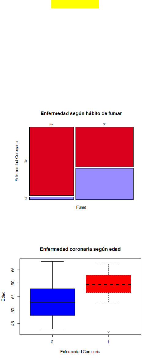 PRACTICA DE BIOESTADÍSTICA Custodio Jaimes, Rosa María. PREGUNTA 1: Utilice la base de datos enfermedad. xlsx En una población se selecciona al azar una muestra de varones mayores de 40 años, en el momento de comenzar el estudio no tienen criterios de enfermedad coronaria, se observa su evolución durante cinco años, y se anota quienes han desarrollado criterios de enfermedad coronaria. Las personas que han desarrollado enfermedad coronaria en el transcurso del estudio se codifican con un uno en la variable Y, y con un cero si no la han desarrollado al finalizar el estudio. La variable X1 se codifica con un cero para los no fumadores y con un uno para los fumadores, la edad (X2) en años es la que tenían los integrantes de la muestra al ser incluidos en el estudio. Realice un análisis de regresión logística para predecir la enfermedad coronaria. Las personas con el hábito de fumar son más propensas a tener una enfermedad coronaria que las personas que no fuman. Las personas de mayor edad, de alrededor de 60 años, son más propensas sufrir una enfermedad coronaria que personas con alrededor de 50 años. Prueba Global: Deviance Residual = 47.71 Deviance nulo = 69.59 Deviance residual < Deviance nulo; por lo tanto, el modelo es significativo. Prueba de Wald El p-valor de las variables hábito de fumar y edad fueron significativos (p-valor < 0.05); por lo tanto en la ecuación de regresión, son consideradas ambas. Pr(Y) = 1 1 + e−(−11.3594+2.8902+0.1467) La matriz de confusión, por su parte, con un umbral de 0.5, muestra que este modelo acertó en 39 personas que no tuvieron la enfermedad coronaria durante el tiempo de estudio y 9 personas que sí. PREGUNTA 2: Utilice la base de datos composición química.csv Los datos corresponden a las composiciones químicas de un grupo de plantas de cerámica Clasificar muestras de cerámica en función de su composición química (Realizar un análisis de clúster) Eliminamos la variable “Part” por ser cuantitativa y no influir en nuestro análisis. Estandarizamos las variables: Usando el método completo del clustering particional, obtenemos que por mayoría nos recomienda hacer el análisis con 3 clusters. Comprobamos la estabilidad para 3 clusters con el coeficiente de Jaccard de Jittering y Bootstrap, siendo mayor a 0.7 en los 3 grupos para ambos casos. Comprobamos la estabilidad para 4 clusters, resultando el primer cluster inestable (Coeficiente de Jaccard = 0.47) Elegimos 3 clusters y obtenemos los gráficos de cajas para comparar sus porcentajes en peso y ppm de los diferentes compuestos químicos de las cerámicas. 2 de los 17 boxplot obtenidos: El porcentaje en peso de Na2O es mayor en el Cluster 2, en el Cluster 1 y 3 este porcentaje en peso es similar, siendo el rango del Cluster 1 mayor al del Cluster 2. El porcentaje en peso de Al2O3 es significativamente mayor en el Cluster 3; mientras el Cluster 2, de amplio rango, posee más porcentaje en peso de Al2O3 que las plantas de cerámica del Cluster 1. Luego se realizó el análisis con los métodos jerárquicos: Finalmente, al usar el código para encontrar el mejor método, obtenemos el método del promedio; sin embargo, al usar este método con 3 clusters vemos que el cluster 3 y el cluster 3 poseerían solo un elemento cada uno, es por esto que en su lugar preferimos el método Ward, que clasificaba de una mejor manera las distintas plantas de cerámica incluidas en el estudio. La clasificación de estas quedaría de la siguiente forma: