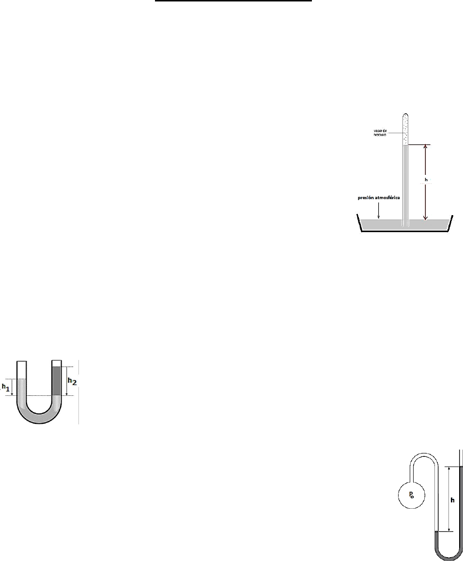 U.T.N. – F.R.H. // FÍSICA I: GUÍA DE PROBLEMAS 54 Hidrostática e hidrodinámica 272.- *Matt bucea en un lago a 20 m de profundidad. a) Calcule la presión manométrica que experimenta Matt. Considere que la densidad del agua vale 1000 kg/m3. b) Calcule el módulo de la fuerza que soporta cada cm2 de la piel de Matt (considere solo la presión manométrica para efectuar el cálculo). [a) 200000 Pa; b) 2 kgf] 273.- *Las suelas de los zapatos de una persona de 70 kg tienen un área de 100 cm 2 cada una. ¿Qué presión ejerce la persona sobre el suelo cuando está de pie? [35000 Pa] 274.- Un tubo de ensayo lleno de mercurio se introduce en un reci- piente con mercurio y abierto a la atmósfera (experimento de Torri- celli). Se observa que la columna de mercurio dentro del tubo al- canza una determinada altura para la cual se establece un equilibrio con la presión atmosférica. Si el experimento se realiza a 3000 me- tros sobre el nivel del mar, donde la presión atmosférica es el 69,2 % de la presión atmosférica a nivel del mar, calcule la altura h de la columna de mercurio. ρhg=13,6 g/cm3. [526 mmHg] 275.- La presión atmosférica normal es 𝑃0 = 1,013 × 10 5𝑃𝑎. La apro- ximación de una tormenta hace que la altura de la columna de mer- curio de un barómetro descienda 20,0 mm desde la altura normal (𝜌𝐻𝑔 = 13,6 𝑔 𝑐𝑚3⁄ ). ¿Cuál es el valor en Pascales, de la presión atmosférica en ese momento? [𝑃 = 0,986 × 105𝑃𝑎] 276.- Cuando un avión se presuriza, la presión del aire en el interior del avión es la equiva- lente a la que genera una columna de mercurio de 56 cm de altura. Calcule la fuerza que experimenta el fuselaje cuando este avión vuela a 5000 m de altura con respecto a nivel del mar, donde la presión atmosférica es 0,533 atm. Considere un área del fuselaje promedio de 1000 m2. ¿La fuerza es hacia adentro o hacia afuera del avión? [20,6 106 N, hacia afuera] 277.- En un tubo en U en el que inicialmente hay agua, se agrega un líquido inmiscible con el agua de densidad desconocida (líquido oscuro en la fi- gura). Considere h1=7 cm, h2=14 cm y ρagua=1 gr/cm3, y calcule la densidad del líquido oscuro. [0,5 gr/cm3] 278.- En un recipiente esférico hay un gas a una presión Po. El recipiente está conectado a una manguera doblada en forma de U cuyo extremo libre está abierto a la atmósfera. En el interior de la manguera hay agua en equi- librio con las presiones en ambas ramas. Sabiendo que h=30 cm, calcular la presión del gas en el interior del recipiente.[1,029 atm] 279.- Un tubo en U de 1 cm de diámetro se coloca verticalmente y se llena en parte con mercurio (𝜌𝐻𝑔 = 13,6 𝑔 𝑐𝑚3⁄ ). En una de las ramas se vierten 30 gr de agua y en la otra, 60 gr de alcohol (𝜌𝑎𝑙𝑐𝑜ℎ𝑜𝑙 = 0,8 𝑔 𝑐𝑚3⁄ ). a) ¿Qué desnivel presentan las dos superficies del mercurio? b) ¿Y las superficies libres de los líquidos? [a) 2,76 cm b) 54,54 cm ] 280.- Calcule el empuje que experimenta un cuerpo que flota sobre un líquido de densidad igual a 0,8 gr/cm3, desalojando 20 cm3 de líquido. [0,16N] U.T.N. – F.R.H. // FÍSICA I: GUÍA DE PROBLEMAS 55 281.- a) Se arroja un cuerpo al agua y se observa que flota con la mitad de su volumen sumergido. Calcule la densidad del cuerpo. [500 kg/m3] b) Si lo que se arroja es un cubito de hielo cuya densidad es 0,9 gr/cm3, calcule la proporción del volumen del cubito que queda sumergido. [Vsum=0,9Vtotal] 282.- Un oso pesa 3540 N, se sube a un témpano de hielo, en alta mar, de tal manera que el témpano quede totalmente sumergido, ¿qué volumen tiene el témpano? (hielo = 0,9 g/cm3 ; ρagua de mar = 1,03 g/cm3) [V = 2,778 m 3] 283.- Un ancla de P = 25 kgr y = 7,86 gr/cm3 está sobre la cubierta de una barcaza, con lados verticales, que flota en un lago, el área del fondo [plano] es de 8 m 2. El ancla se tira por la borda y queda apoyada en el fondo, ¿la barcaza, sube o baja y que distancia lo hace? [Sube 3,12 x 10-3 m] 284.- Cuál es el área mínima de un bloque de hielo flotando en el agua para poder sustentar a un automóvil que pesa 1200 kgr? El bloque tiene una altura de 2 m.(Hielo= 0,9 gr/cm3) [6 m2] 285.- Un bloque de madera flota en el agua con 2/3 de su volumen sumergido. En aceite tiene 9/10 de su volumen sumergido. Hallar elpeso específico de la madera y del aceite. [𝛾𝑚𝑎𝑑𝑒𝑟𝑎 = 0,66 𝑔𝑓 𝑐𝑚3 ; 𝛾𝑎𝑐𝑒𝑖𝑡𝑒 = 0,74 𝑔𝑓 𝑐𝑚3 ] 286.- Se cuelga un cuerpo de una soga y se mide la tensión. Luego, sin soltar la soga, se introduce el cuerpo completamente en agua y se observa que la tensión disminuye un 10%. Calcular la densidad del cuerpo. [10000 kg/m3] 287.- Un cable anclado en el fondo de un lago sostiene una esfera hueca de plástico bajo la superficie. Si el volumen de la esfera es de 0,3 m3 y la tensión del cable es de 900 N. a) ¿Cuál es el valor de la fuerza empuje sobre la esfera? b) ¿Cuánto pesa dicha esfera? c) Si se rompe el cable, ¿qué porcentaje del volumen de la esfera queda sumergida? [ a) E = 2940 N b) P = 2040 N c) queda sumergido el 69,38% del volumen total] 288.- *Un bloque A cuelga de un dinamómetro B, y se sumerge en un líquido contenido en un recipiente. El peso del líquido es 1,5 kgf y el del recipiente 1 kgf, mientras que el bloque tiene un volumen de 0,0025 m3. Si la balanza B indica 3 kgf y la balanza C indica 6,5 kgf; determinar: a) El peso específico del líquido. b) las indicaciones de cada balanza al retirar el cuerpo del líquido. [a) 1,6 kgf/dm3; b) B: 7 kgf, C: 2,5 kgf] 289.- Una esfera hueca, de material de = 7 g/cm3 y peso 10 kgf, flota de tal modo que la línea de flotación pasa por el centro de la esfera. a) ¿Qué espesor tiene la pared de la esfera? b) ¿Cuántos perdigones de 0,1 gr se deben introducir en la esfera para que esta se hunda justamente en el seno del líquido? [ a) e = 4,1 x 10-3 m b) 100.039 perdigones] 290.- Una tubería horizontal tiene