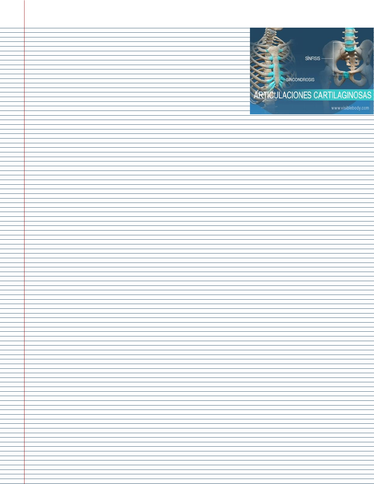 En las articulaciones cartilaginosas primarias, o sincondrosis, los huesos están unidos por cartílago hialino, el cual permite que se doblen ligeramente en las primeras etapas de la vida. Las articulaciones cartilaginosas primarias suelen ser uniones temporales, como las que están presentes durante el desarrollo de un hueso largo. Las articulaciones cartilaginosas secundarias, o sínfisis, son articulaciones fuertes, ligeramente móviles, unidas por fibrocartílago. Los discos intervertebrales fibrocartilaginosos, situados entre las vértebras, están formados por tejido conectivo que une las vértebras entre sí. Colectivamente, estas articulaciones aportan potencia y absorben los choques; además, confieren una notable flexibilidad a la columna vertebral. Articulaciones cartilaginosas jueves, 19 de enero de 2023 10:55 a. m. Huesos página 1
