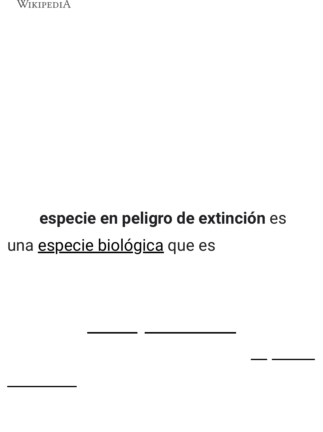 Especie en peligro de extinción especie en riesgo de desaparecer Una especie en peligro de extinción es una especie biológica que está en peligro de desaparecer (extinguirse), ya sea global o regionalmente. Esto puede deberse a la pérdida de hábitat, contrabando de ejemplares silvestres o acción de especies invasoras. https://es.m.wikipedia.org/wiki/Wikipedia:Portada https://es.m.wikipedia.org/wiki/Especie https://es.m.wikipedia.org/wiki/H%C3%A1bitat https://es.m.wikipedia.org/wiki/Contrabando https://es.m.wikipedia.org/wiki/Especie_invasora En la versión de 2008 de la Lista Roja de la UICN (Lista Roja de la Unión Internacional para la Conservación de la Naturaleza), se encuentran bajo la categoría en Peligro, 2448 taxones de animales, 2280 de plantas,[2] a los que se acoplan los encuadrados bajo la categoría «En peligro crítico», los que comprenden 1665 El tigre siberiano es una subespecie de tigre que se encuentra en peligro crítico; tres subespecies ya se han extinguido.[1] https://es.m.wikipedia.org/wiki/Lista_Roja_de_la_UICN https://es.m.wikipedia.org/wiki/Tax%C3%B3n https://es.m.wikipedia.org/wiki/Animalia https://es.m.wikipedia.org/wiki/Plantae https://es.m.wikipedia.org/wiki/Especie_en_peligro_cr%C3%ADtico_de_extinci%C3%B3n https://es.m.wikipedia.org/wiki/Archivo:Siberischer_tiger_de_edit02.jpg https://es.m.wikipedia.org/wiki/Tigre_siberiano taxones de animales,[3] y 1575 de plantas.[2] Antes, la gente apenas se preocupaba por ello, matando tantos animales como necesitaba para obtener comida, pieles y otros muchos recursos derivados de los animales. A medida que la población y el comercio crecían, el número aumentaba, lo que más de una vez llevó a la extinción de algunas especies. No fue hasta mediados del siglo ��� cuando la gente se preocupó de que los cotos de caza estuvieran a veces vacíos, y fue entonces cuando se empezaron a imponer las primeras restricciones a la caza. Sin embargo, dicha prohibición tenía un objetivo diferente: continuar con la caza una vez recuperado el número de animales. Las primeras prohibiciones de la caza y otras crueldades con los animales no se promulgaron antes de finales del siglo ���, cuando incluso en la propia Europa empezaron a desaparecer algunas especies: el bisonte casi se extinguió, en 1627 desapareció el toro y el caballo salvaje euroasiático se extinguió en 1918. Muchos países cuentan con leyes para proteger a estas especies: por ejemplo, prohibiendo la cacería, restringiendo el desarrollo de la tierra o creando reservas https://es.m.wikipedia.org/wiki/Bisonte https://es.m.wikipedia.org/wiki/Bos_primigenius https://es.m.wikipedia.org/wiki/Equus_ferus_ferus https://es.m.wikipedia.org/wiki/Caza https://es.m.wikipedia.org/wiki/Reservas_naturales naturales. De hecho, pocas especies en peligro de extinción reciben protección legal. La mayoría de las especies se extinguen o pueden extinguirse sin una respuesta pública. El gran número de especies que se han extinguido en los últimos ciento cincuenta años es motivo de preocupación. El ritmo actual de extinción es entre diez y cien veces superior al de cualquier otra extinción masiva anterior en la historia de la Tierra. Si este ritmo de extinción persiste o se acelera, el número de extinciones de especies en la próxima década podría calcularse en millones.[4] https://es.m.wikipedia.org/wiki/Reservas_naturales https://es.m.wikipedia.org/wiki/Especie Aunque la mayoría de la gente responde fácilmente a la amenaza de extinción de mamíferos individuales o pájaros, el problema más importante de la ecología es la amenaza a la estabilidad de ecosistemas enteros, siempre que desaparezcan especies clave en algún nivel de la cadena alimenticia. Cuatro razones para preocuparse por la extinción: 1. La extinción de las especies como entidades biológicas. Problema de extinción https://es.m.wikipedia.org/wiki/Mam%C3%ADferos https://es.m.wikipedia.org/wiki/Aves https://es.m.wikipedia.org/wiki/Ecolog%C3%ADa https://es.m.wikipedia.org/wiki/Ecosistema https://es.m.wikipedia.org/wiki/Cadena_alimenticia 2. Desestabilización de los ecosistemas. 3. Amenaza a otras especies. 4. Pérdida de material genético insustituible. La extinción de especies es un factor crítico tanto por la reducción de la riqueza de la naturaleza como por una cuestión moral para quienes creen que los humanos tienen el deber de preservar el entorno natural (así como para quienes creen que las especies animales tienen derechos legales). La "desestabilización" se entiende bien cuando un eslabón de la cadena alimentaria desaparece del ecosistema. Cuando una especie desaparece, es muy frecuente que se produzcan cambios poblacionales en la abundancia de las especies secundarias. Puede darse una situación en la que el ecosistema cambie de forma notable e irreversible. La cuarta razón es más sutil, pero quizá sea la más importante para la humanidad. Cada especie lleva un material genético único en su ADN y produce compuestos químicos únicos según sus instrucciones genéticas. Por ejemplo, en los valles del https://es.m.wikipedia.org/wiki/ADN centro de China existe el ajenjo dulce, una planta parecida al helecho que es la única fuente de artemisinina, un fármaco que es casi 100% eficaz contra la malaria (Jonietz, 2006). Si esta planta desapareciera, el control de la malaria (la temida enfermedad actual), disminuiría. Hay muchos otros ejemplos de compuestos químicos exclusivos de determinadas especies. No se puede determinar el número de compuestos aún no descubiertos que podrían extinguirse como consecuencia de la extinción de especies, pero es un motivo de gran debate, y sin duda muy importante. [cita requerida] https://es.m.wikipedia.org/wiki/Artemisinina https://es.m.wikipedia.org/wiki/Malaria https://es.m.wikipedia.org/wiki/Wikipedia:Verificabilidad Aunque las extinciones pueden ser el resultado natural de la selección natural (por ejemplo, la extinci