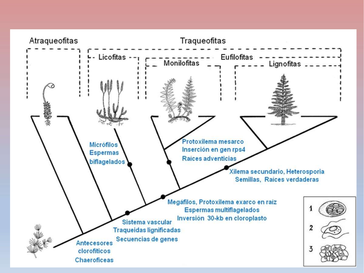 Diversidad de Briofitas, Pteridofitas y Gimnospermas CARACTETRÍSTICAS GENERALES DE LAS PLANTAS Embriones multicelulares. Capítulo I: Generalidades Multicelulares. Eucarióticas. Paredes celulares celulósicas y vacuolas grandes. Cloroplastos. Están adaptadas primariamente para vivir en tierra firme. Ciclo vital: generación gametofítica y generación esporofítica. ORIGEN Y FILOGENIA DE LOS GRANDES GRUPOS VEGETALES Antecesores clorofíticos Chaeroficeas Atraqueofitas Traqueofitas Sistema vascular Traqueidas lignificadas Secuencias de genes Licofitas Micrófilos Espermas biflagelados Eufilofitas Megáfilos, Protoxilema exarco en raíz Espermas multiflagelados Inversión 30-kb en cloroplasto Monilofitas Protoxilema mesarco Inserción en gen rps4 Raíces adventicias Lignofitas Xilema secundario, Heterosporia Semillas, Raíces verdaderas FILOGENIA DE “BRIOFITAS” Y “PTERIDOFITAS” Atraqueofitas (“Briofitas”) Traqueofitas sin semillas (“Pteridofitas”) Marchanti o-fitas Anthoce- rofittas Briofitas Rhyniofitas Licofitas Antecesores clorofíticos Chaeroficeas Monilofitas Eusporangiados Leptosporangiados Zosterophyllofitas Psilotopsidas Trimerofitofitas Marattiopsidas Equisetopsidas Polypodiopsidas FILOGENIA DE LAS LIGNOFITAS L i g n o f i t a s (E s p e r m a t o f i t a s) Gimnospermas Angiospermas GnetalesLyginopteris Medullosa Ginkgoales Coniferales Cycadales Trimerofitofitas (Magnoliofitas) Relaciones filogenéticas inciertas Atraqueofitas Zosterophyllum Licofitas Rhynia Equisetopsidas Psilotopsidas Angiospermas TEORÍAS SOBRE LA EVOLUCIÓN DE LAS PLANTAS 1. Teoría Telomática (Zimmermann, 1930). 2. Teoría de la Enación (Bower, 1908). 3. Teoría Estélica (Van Tieghem & Douliot, finales del siglo XIX). TEORÍA TELOMÁTICA I. Evolución de las plantas terrestres a partir de las algas. “procesos elementales” 1. Interconexión de células Chlamydomonas (Clorofita) Ulothrix (Clorofita) 2. Rotación del eje celular Stigeoclonium (Clorofita) Ulothrix (Clorofita) 3. Diferenciación de meristemas Stigeoclonium (Clorofita) Dictyota (Feofita) 4. Cambio en la alternancia de generaciones Ulothrix (Clorofita) Ulva (Clorofita) TIPOS DE ALTERNANCIA DE GENERACIONES a. Gametofito y b. Esporofito. 1. Isomórfica 2. Heteromórfica “lechuga de mar” (Clorofita) “cola de caballo” (Esfenofita) 5. Diferenciación de bandas centrales de elementos prosenquimáticos Dyctiopteris (Feofita) A partir de aquí se pudieron diferenciar dos líneas. Marchantia (Marchantiofita) Rhynia (Rhyniofita) Plantas sin tejido conductor y gametofito dominante. Plantas con tejido conductor y esporofito dominante. II. Evolución de plantas vasculares a partir de telomas dicotómicos. “procesos elementales” 1. Dominancia Tallos en Lycopodium (Licofita) 2. Aplanamiento Inicio de la formación de hojas. 3. Concrescencia Hojas en Ginkgo biloba (Ginkgoales). De telomas en un solo plano Formación de tallos. De telomas en varios planos 4. Reducción Hojas en Equisetum (Esquisetopsida) 5. Incurvación Esporangióforos en Equisetum (Esquisetopsida) Evolución de los esporofilos en Licofitas Posición terminal en Rhynia fósil. Posición axilar en Lycopodium actual. Cortes de conos de Lycopodium y Selaginella. Evolución de los esporofilos en Equisetopsidas Forma inicial en Protohyenia. Forma final en Equisetum. Formas intermedias en Hienales y Pseudoborniales. Cono y esporangióforos en Equisetum Evolución de los esporofilos en Polypodiopsidas Paso desde Pseudoporochnus y Cladoxylon hasta Polypodium. Foliolo de Polypodium con soros en el envés. Evolución del primordio seminal en Angiospermas Sistema de telomas como en Rhynia. Diferenciación en una nucela fértil y un tegumento como envoltura estéril. Evolución de los esporofilos en Esquisetopsidas Forma inicial en Protohyenia (Devónico inferior). Forma primitiva en Hyenia (Devónico medio). Forma intermedia en Pseudobornia (Devónico sup. – Carbonífero inf.) Forma actual en Equisetum. Micrófilos y Macrófilos Dominancia, aplanamiento y reducción para los micrófilos y dominancia, aplanamiento y concrescencia para los macrófilos. TEORÍA DE LA ENACIÓN Las hojas surgirían como excrecencias o enaciones y luego adquirirían cordones vasculares a partir del eje vascular. EVOLUCIÓN INICIAL DE LAS PLANTAS SOBRE LA TIERRA La evolución inicial de las plantas sobre la tierra en la era paleozoica, fue un hecho importante con consecuencias para la evolución de los organismos terrestres y el medio ambiente global. Desde plantas de cuerpo simple como de las atraqueofitas, evolucionó un elaborado ciclo vital con 2 fases y un extraordinario equipo de órganos y sistemas de tejidos como: 1. Órganos sexuales especializados: gametangios. Anteridios y arquegonios de musgo, licopodio y helecho 2. Tallos con un mecanismo de transporte de fluido: tejidos vasculares. Cortes transversales de tallos de psilotum, licopodio y helecho, mostrando los haces conductores con floema y xilema 3. Tejidos estructurales: leño. Cortes transversales de tallos de araucaria y melocotón 4. Estructuras epidérmicas para realizar intercambio gaseoso: estomas. Poros en hepáticas y estomas en hepáticas corniformes 5. Hojas y raíces de varios tipos. Raíces adventicias y hojas lanceoladas, escuamiformes y compuestas de licopodio, cola de caballo y helecho 6. Diversos órganos conteniendo esporas: esporangios. Sinangio, cono y soro de psilotum, licopodio, selaginela y helecho 7. Estructuras especializadas para la dispersión: semillas. Semillas aladas, emplumadas y de dispersión mecánica 8. Porte arbóreo. Plantas arbóreas de Lepidodendron, Calamites (ambos fósiles) y de Cyathea (helecho actual) ALTERNANCIA DE GENERACIONES Paso de un estado haploide (n) a uno diploide (2n) y viceversa, durante la vida de una planta. Esta consta de 2 fases: a. Gametofito (n); b. Gametangios (arquegonios y anteridios); c. Gametos (ovocélulas y anterozoides); d. Esporofito (2n); e. Esporangios y f.