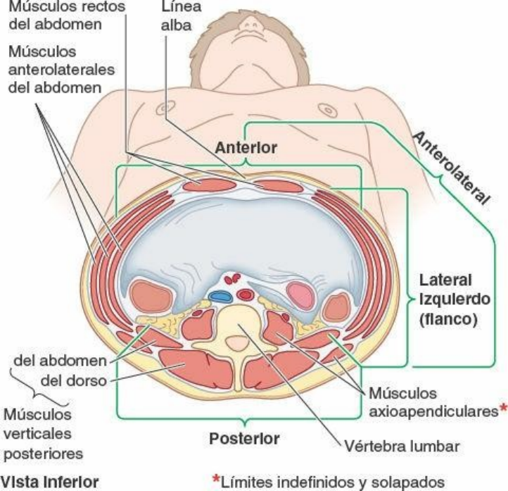 Pared Anterolateral del Abdomen Aunque la pared del abdomen es continua, a efectos descriptivos se subdivide en pared anterior, paredes laterales derecha e izquierda, y pared posterior (fig. 5-3). Se trata de una pared musculoaponeurótica, excepto en su cara posterior, que incluye la porción lumbar de la columna vertebral. El límite entre las paredes laterales y anterior es indefinido. En consecuencia, a menudo se usa el término pared anterolateral del abdomen. Algunas estructuras, como los músculos y los nervios cutáneos, se encuentran tanto en la pared anterior como en las paredes laterales. La pared anterolateral del abdomen se extiende desde la caja torácica hasta la pelvis. Fig. 5-3. Subdivisiones de la pared abdominal. Corte transversal del abdomen que muestra diversos aspectos de la pared y sus componentes. *Los músculos dorsal ancho, relativamente superficial, y psoas mayor, más profundo, son músculos axioapendiculares que se insertan distalmente en los miembros superior e inferior, respectivamente. La pared anterolateral del abdomen está limitada superiormente por los cartílagos de las costillas 7ª a 10ª y el proceso (apófisis) xifoides del esternón, e inferiormente por el ligamento inguinal y los bordes superiores de las caras anterolaterales de la cintura pélvica (crestas ilíacas, crestas púbicas y sínfisis púbica) (fig. 5-4 A). La pared anterolateral del abdomen está formada por la piel, el tejido subcutáneo (fascia superficial) compuesto principalmente por grasa, los músculos y sus aponeurosis, la fascia profunda, la grasa extraperitoneal y el peritoneo parietal (fig. 5-4 B). La piel se une laxamente al tejido subcutáneo, excepto en el ombligo, donde se adhiere con firmeza. La mayor parte de la pared anterolateral del abdomen incluye tres capas musculotendinosas; los haces de fibras de cada capa tienen direcciones distintas. Esta estructura trilaminar es parecida a la de los espacios intercostales del tórax. Fig. 5-4. Contenido abdominal, en su posición natural, y capas de la pared anterolateral del abdomen. A) Se ha extirpado la pared anterior del abdomen y los tejidos blandos de la pared anterior del tórax. La mayor parte del intestino está cubierto, a modo de delantal, por el omento mayor, un repliegue del peritoneo que cuelga desde el estómago. B) Este corte muestra las capas de la pared anterolateral del abdomen, incluidos los músculos planos trilaminares. Fascia de la pared anterolateral del abdomen El tejido subcutáneo de la mayor parte de la pared incluye cantidades variables de grasa, y constituye uno de los principales lugares de depósito. Los varones son especialmente susceptibles a la acumulación subcutánea de grasa en la parte baja de la pared anterolateral del abdomen. En la obesidad mórbida, el panículo adiposo alcanza varios centímetros de grosor, y a menudo forma uno o más faldones. Por encima del ombligo, el tejido subcutáneo es concordante con el que se encuentra en la mayoría de las regiones. Inferior al ombligo, la parte más profunda del tejido subcutáneo está reforzada por numerosas fibras elásticas y de colágeno, de forma que el tejido subcutáneo está compuesto por dos capas: una capa superficial adiposa de la fascia de la pared anterolateral del abdomen (fascia de Camper) y una capa membranosa de la fascia de la pared anterolateral del abdomen (fascia de Scarpa). La capa membranosa se continúa inferiormente en la región perineal como la capa membranosa del tejido subcutáneo del periné (fascia perineal superficial o de Colles), pero no en los muslos (fig. 5-9 B). Las capas superficial, intermedia y profunda de la fascia de revestimiento recubren las caras externas de las tres capas musculares de la pared anterolateral del abdomen y sus aponeurosis (tendones planos extendidos), de los que no puede despegarse fácilmente. Estas fascias de revestimiento son extremadamente delgadas y están constituidas en gran parte por el epimisio (capa externa de tejido conectivo fibroso que envuelve a todos los músculos), situado en la superficie de los músculos o entre ellos. La cara interna de la pared abdominal está revestida por láminas membranosas y areolares de grosor variable: la fascia endoabdominal. Aunque es continua, las diferentes partes de esta fascia se denominan en función del músculo o de la aponeurosis que recubren. La porción que recubre la superficie profunda del músculo transverso del abdomen y su aponeurosis es la fascia transversal (transversalis). El revestimiento brillante de la cavidad abdominal, el peritoneo parietal, está formado por una sola capa de células epiteliales y tejido conectivo de sostén. El peritoneo parietal se localiza interno a la fascia transversal y está separado de ella por una cantidad variable de grasa extraperitoneal. Músculos de la pared anterolateral del abdomen En la pared anterolateral del abdomen hay cinco músculos, emparejados bilateralmente (fig. 5-3): tres músculos planos y dos músculos verticales. En la figura 5-5 se muestran sus inserciones, y en la tabla 5-2 se citan junto a su inervación y principales acciones. Fig. 5-5. Músculos de la pared anterolateral del abdomen. Los tres músculos planos son el oblicuo externo del abdomen, el oblicuo interno del abdomen y el transverso del abdomen. Las fibras musculares de estas tres capas musculares concéntricas tienen orientaciones distintas, de modo que las fibras de las dos capas externas se disponen diagonalmente y perpendiculares entre sí en su mayor parte, y las fibras de la capa profunda discurren transversalmente. Los tres músculos planos terminan anterior y medialmente en fuertes aponeurosis laminares (fig. 5-6 A). Entre las líneas medioclavicular (LMC) y media, las aponeurosis forman la fuerte vaina del músculo recto del abdomen, que envuelve al músculo recto del abdomen (fig. 5-6 B). Allí, las aponeurosis se entrelazan con las del otro lado y forman un rafe (del griego rhaphe, sutura