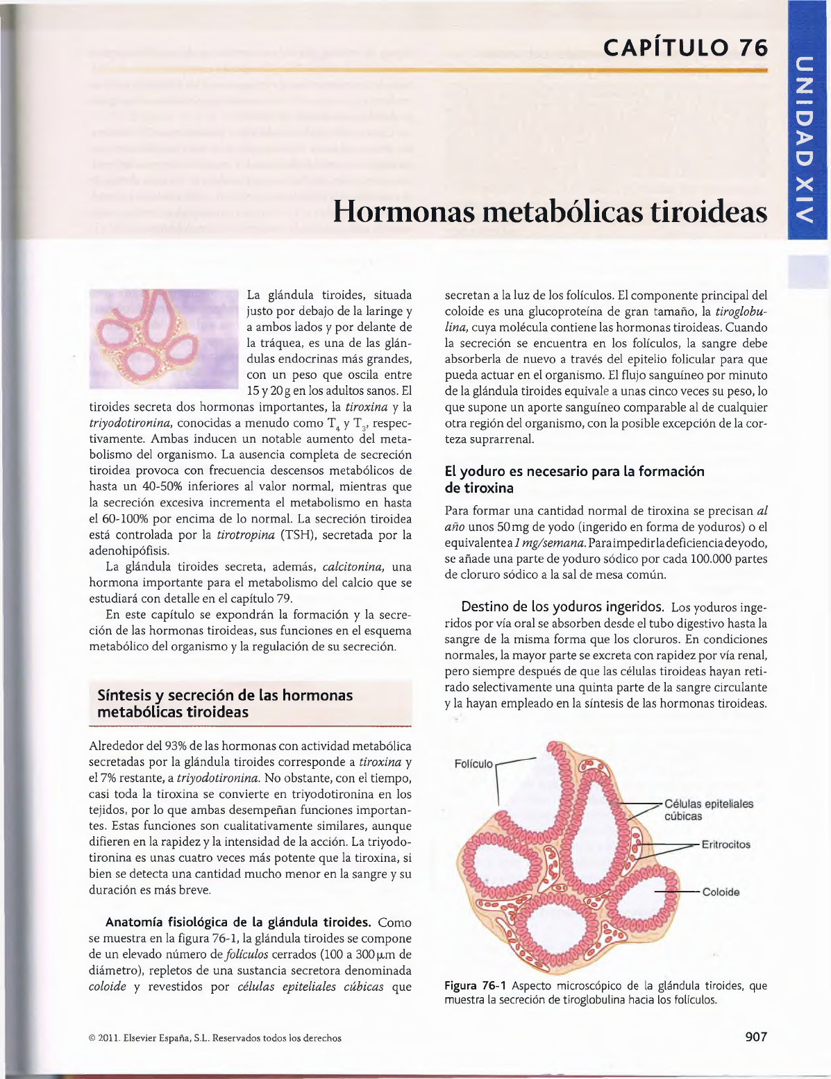 CAPÍTULO 76 Hormonas metabólicas tiroideas La glándula tiroides, situada justo por debajo de la laringe y a ambos lados y por delante de la tráquea, es una de las glán dulas endocrinas más grandes, con un peso que oscila entre 15 y 20 g en los adultos sanos. El tiroides secreta dos hormonas importantes, la tiroxina y la triyodotironina, conocidas a m enudo como T4 y T3, respec tivamente. Ambas inducen un notable aum ento del m eta bolismo del organismo. La ausencia completa de secreción tiroidea provoca con frecuencia descensos metabólicos de hasta un 40-50% inferiores al valor normal, mientras que la secreción excesiva incrementa el metabolismo en hasta el 60-100% por encima de lo normal. La secreción tiroidea está controlada por la tirotropina (TSH), secretada por la adenohipófisis. La glándula tiroides secreta, además, calcitonina, una horm ona im portante para el metabolismo del calcio que se estudiará con detalle en el capítulo 79. En este capítulo se expondrán la formación y la secre ción de las hormonas tiroideas, sus funciones en el esquema metabòlico del organismo y la regulación de su secreción. Síntesis y secreción de las horm onas m etabólicas tiroideas Alrededor del 93% de las horm onas con actividad metabólica secretadas por la glándula tiroides corresponde a tiroxina y el 7% restante, a triyodotironina. No obstante, con el tiempo, casi toda la tiroxina se convierte en triyodotironina en los tejidos, por lo que ambas desempeñan funciones im portan tes. Estas funciones son cualitativamente similares, aunque difieren en la rapidez y la intensidad de la acción. La triyodo tironina es unas cuatro veces más potente que la tiroxina, si bien se detecta una cantidad mucho m enor en la sangre y su duración es más breve. Anatomía fisiológica de la glándula tiroides. Como se muestra en la figura 76-1, la glándula tiroides se compone de un elevado número de folículos cerrados (100 a 300 |xm de diámetro), repletos de una sustancia secretora denominada coloide y revestidos por células epiteliales cúbicas que secretan a la luz de los folículos. El com ponente principal del coloide es una glucoproteína de gran tamaño, la tiroglobu- lina, cuya molécula contiene las horm onas tiroideas. Cuando la secreción se encuentra en los folículos, la sangre debe absorberla de nuevo a través del epitelio folicular para que pueda actuar en el organismo. El flujo sanguíneo por minuto de la glándula tiroides equivale a unas cinco veces su peso, lo que supone un aporte sanguíneo comparable al de cualquier otra región del organismo, con la posible excepción de la cor teza suprarrenal. El yoduro es necesario para la formación de tiroxina Para formar una cantidad normal de tiroxina se precisan al año unos 50 mg de yodo (ingerido en forma de yoduros) o el equivalenteai mg/semana. Paraimpedirladeficienciadeyodo, se añade una parte de yoduro sódico por cada 100.000 partes de cloruro sódico a la sal de mesa común. Destino de los yoduros ingeridos. Los yoduros inge ridos por vía oral se absorben desde el tubo digestivo hasta la sangre de la misma forma que los cloruros. En condiciones normales, la mayor parte se excreta con rapidez por vía renal, pero siempre después de que las células tiroideas hayan reti rado selectivamente una quinta parte de la sangre circulante y la hayan empleado en la síntesis de las horm onas tiroideas. Figura 76-1 Aspecto microscópico de la glándula tiroides, que muestra la secreción de tiroglobulina hacia los folículos. © 2011. Elsevier España, S.L. Reservados todos los derechos 907 U N ID A D X IV http://booksmedicos.org http://booksmedicos.org Unidad X IV Endocrinologia y reproducción Bomba de yoduro: el simportador del yoduro de sodio (atrapamiento de yoduro) La prim era etapa de la formación de las horm onas tiroideas, ilustrada en la figura 76-2, consiste en el transporte de los yoduros desde la sangre hasta las células y los folículos de la glándula tiroides. La membrana basal de estas células posee la capacidad específica de bom bear de forma activa el yoduro al interior celular. Esto se consigue mediante la acción de un simportador del yoduro de sodio (NIS), que cotransporta el ion yoduro a lo largo de dos iones sodio a través de la m em brana basolateral (plasma) a la célula. La energía para el transporte del yoduro en contra de un gradiente de concen tración proviene de la bomba de sodio-potasio ATPasa, que bombea sodio al exterior de la célula, con lo que establece una baja concentración de sodio intracelular y un gradiente para facilitar la difusión de sodio en la célula. El proceso de concentración de yoduro en la célula se denomina atrapamiento de yoduro. En una glándula normal, la bomba de yoduro concentra esta sustancia hasta que su concentración supera en 30 veces la de la sangre. Cuando la glándula tiroides alcanza su máxima actividad, la relación entre ambas concentraciones puede elevarse hasta 250 veces. El atrapamiento de yoduro por la glándula tiroides depende de diversos factores, el más im portante de los cuales es la concentración de TSH; esta horm ona estimula la actividad de la bomba de yoduro en las células tiroideas, mientras que la hipofisectomía la disminuye. El yoduro es transportado fuera de las células tiroideas a través de la membrana apical hacia el folículo por una molé cula de contratransporte de cloruro-yoduro denominada pendrina. Las células epiteliales tiroideas secretan también en el folículo tiroglobulina que contiene aminoácidos de tiro- sina a los que se unirán los iones yoduro, tal como se expone en el siguiente apartado. Tiroglobulina y química de la formación de tiroxina y triyodotironina Formación y secreción de tiroglobulina por las célu las tiroideas. Las células tiroideas constituyen un ejemplo típico de células glandulares secretoras de proteínas, como demuestra la figura 76-2. El retículo endoplásmico y el apa rato de 