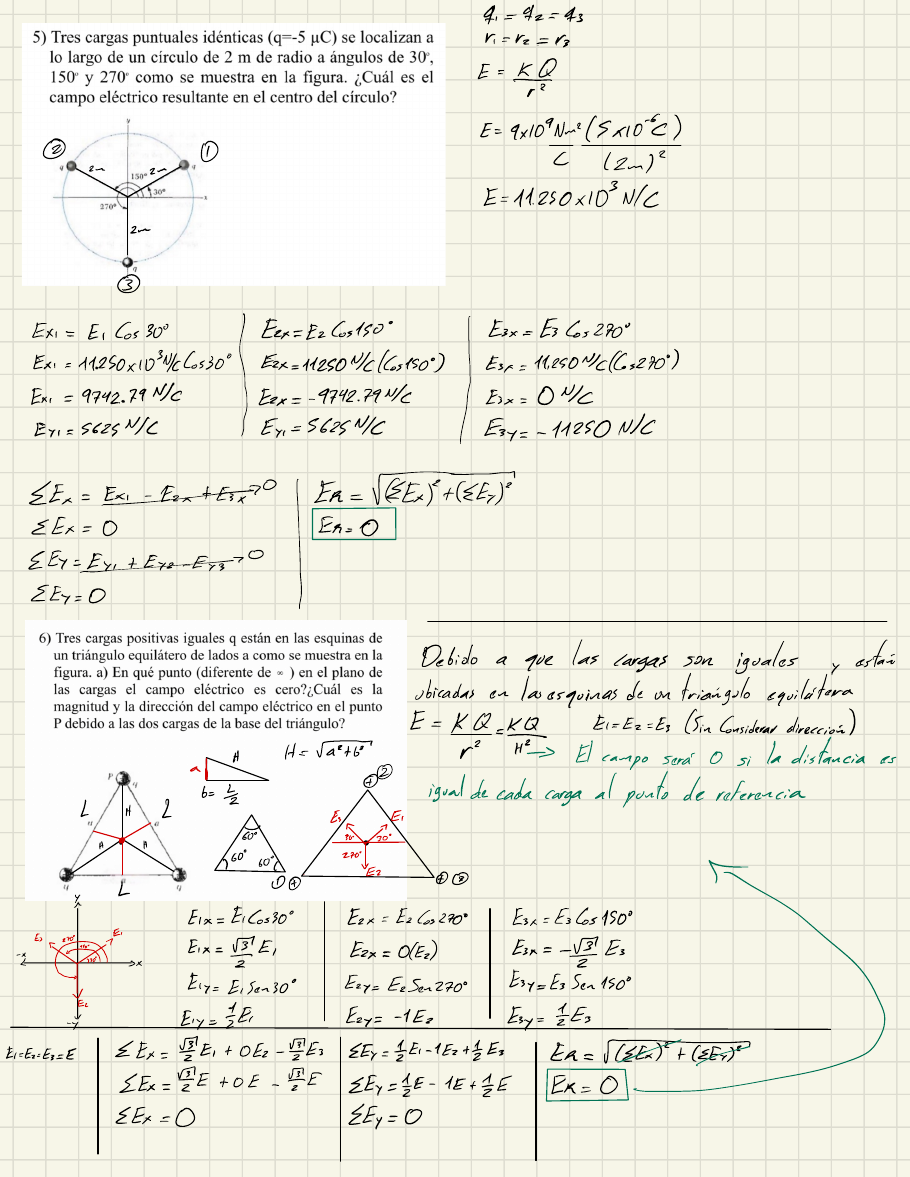 11 =72 =43 N, =Ne =N3 E =ED E=4x109Nm: (Sx10) ⑫ Ire zu ⑪ L (2m) E=11.250x10N/ zm ③ Exi=E, Cor 300 EcxeEl Cor190. E3x=En los 270 Ex1 =1.250x10N/cCos30° EEx = 112504/c(or150 Es= =11,250c(.5270. Ex1 =9742.79NC Exx = - 9742.794 Esx =0NC Ex1 =5624// I Ex, =5624N/C I Esy= -11250 N/C SE, =Atex+Es 7 0 Er=ExX SEx =0 ER =0 SETEEye-E,, 0 I SET=0 Debido a que las cargar son igualor yertain Ubicadar en laesquinar de un triángulo equilatera E =Wa=r E1=Ez=Es (in Considerar dirección A H= er 2 El campo seráo sila distanciaesa ⑰ 6=2 igual de cada carga al punto de referencia LA 2 Es 36. A ⑧A esojos Ene2700 L ①O ⑰ ↑ Y 1 Eix=EiCos30° Ezx =Ec (o 2700 Esx =Es Cor 1500 - 1500<170 & Ex =E, E2x=0(E Esx =- EsCLE -X 2 Eiy =Eiren 30 Ezy=Erfer2700 Esy= Es en 1500v Es Eiy =E, Ezy= -1Ez Esy=Esv El=Ez =Es=E SEx=E, +Ok-Es SEy=E-rezteEs Ere( -X Es - ExEO-IEE-ETELEn e dEx =0 SEy =0