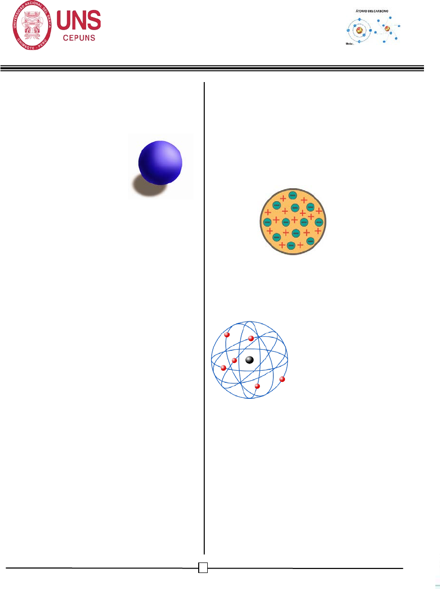 1 Centro Preuniversitario de la UNS S-03 Ingreso Directo QUÍMICA Ciclo 2022 - II “TEORIAS ATÓMICAS DE LA MATERIA” Docente: Equipo Docente INICIOS DE LA TEORÍA ATÓMICA (Dalton 1805) El profesor inglés Dalton, postulo una hipótesis razonable sobre la existencia de los átomos cuyo contenido son los siguientes: • Los elementos químicos consisten de partículas muy pequeñas llamados átomos. • Existen tantas clases de átomos como elementos existen. • En un elemento sus átomos son idénticos. • Los compuestos están formados por átomos de más de un elemento. • Una reacción química implica sólo una separación, combinación o reordenamiento de átomos Cabe mencionar que aquí no nos referimos a reacciones nucleares. MODELO ATÓMICO DE THOMSON Y EL DESCUBRIMIENTO DEL ELECTRÓN. Joseph J. Thomson, químico Danés que en 1897 experimentó en su laboratorio con tubos Crookes y rayos catódicos, El tubo herméticamente cerrado y conectado a dos electrodos, dejo fluir un alto voltaje de corriente eléctrica del electrodo cargado negativamente ( - ) llamado cátodo, al electrodo cargado positivamente ( + ) llamado ánodo. Al observar el experimento, un rayo de luz amarillo verdoso resplandeció entre los electrodos, esto llevo a señalar a Thomson que el rayo producido entre los electrodos es el mismo independientemente de la clase de gas en el tubo. Esto indicó que toda materia debe contener la sustancia que produce el rayo. Esto realmente fue sorprendente para Thomson, llegando a la conclusión que este flujo de partículas tienen carga eléctrica, que ya anteriormente Stoney le llamó electrones. Estos rayos catódicos al ser colocados cerca de un campo eléctrico o magnético son atraídos por el polo positivo y desviados por el polo negativo. Posteriormente J. J. Thomson determinó la relación entre la carga eléctrica y la masa del electrón llegando al valor de 1,76 x 1019 coulomb por gramo que le sirvió para ganar el premio Nobel de física en 1906. El modelo atómico de Thomson consideró al átomo como una esfera de masa cargada positivamente y sobre la cual se encuentran los electrones dispersos en la superficie, es decir; parecido a un “budín de pasas” MODELO ATÓMICO DE RUTHERFORD Y EL DESCUBRIMIENTO DEL NÚCLEO ATÓMICO. Ernest Rutherford fue un británico que en 1911, bombardeando con partículas alfa a una lámina muy delgada de oro, y colocando una pantalla de sulfuro de zinc. La pantalla resplandecía cuando es alcanzada por las partículas alfa, siendo el átomo mayormente un espacio vació, las partículas deben pasar las laminas de oro sin desviarse o con una pequeña desviación por la atracción de los electrones; para sorpresa de Rutherford algunas partículas alfa eran desviadas y otras rebotaban, llegando a la conclusión de que los átomos tienen núcleo muy pequeño y denso, cargado positivamente. El modelo atómico de Rutherford fue semejante a un sistema planetario solar en miniatura, donde los electrones se movían como planetas alrededor del núcleo. Semana Nº 03 Equipo Docente Ciclo 2022 – II Semana 03 2 Centro Preuniversitario de la UNS S-03 Ingreso Directo EXPERIMENTO DE RUTHERFORD DESCUBRIMIENTO DEL PROTÓN Cuando se arranca un electrón, a un átomo, este queda con una carga igual a aquel electrón removido pero con signo contrario. Así por ejemplo, cuando el más ligero de todos los átomos, el hidrógeno, pierde su electrón, se convierte en una partícula denominada protón. El descubrimiento se discute unos le atribuyen a Rutherford otros a E. Goldstein. LA LUZ Y LA TEORÍA CUÁNTICA SOBRE LA MATERIA Al final del siglo XIX la ciencia aceptaba la idea de la cuantización de la materia, pero se creía que la energía radiante era continua, es decir, que la energía de una radiación puede tener cualquier valor. Basándose en los datos sobre el carácter de la luz emitida por sólidos a varias temperaturas, Max Planck enuncio en 1900 su teoría cuántica, los átomos no emiten radiaciones continuas, sino lo hacen en cantidades definidas de energía llamadas cuantos. Cuanto es la mínima cantidad de energía que puede absorber o liberar un electrón MODELO ATÓMICO DE NIELS BOHR Y EL ÁTOMO DE HIDRÓGENO En 1913 Bohr explicó básicamente la naturaleza del espectro de líneas del hidrógeno y postuló su modelo atómico a través de tres razones o postulados. • El átomo de hidrógeno está formado por un núcleo central donde está localizado toda su carga positiva y casi toda la masa y el electrón que describe orbitas circulares alrededor del núcleo, cuyos radios son: rn = 0, 529 n2. n = nivel de energía • Cuando el electrón se mueve en una órbita de radio definido, tiene una energía constante, no gana ni pierde energía. Se dice que el átomo está en un estado fundamental. 2 181018,2 n xEn − −= • Cuando el electrón es excitado y pasa a una órbita permitida de menor energía a otra de mayor energía, se produce una absorción de energía y cuando retorna libera una energía absorbida en forma de luz. νhEE if =− SERIE ESPECTRALES DE EMISIÓN DEL ÁTOMO DE HIDRÓGENO El espectro de emisión y espectro de absorción de hidrógeno atómico fueron descubiertos por diferentes científicos. J.R.Rydberg descubrió que las longitudes de ondas (λ) de las diversas líneas del espectro de Equipo Docente Ciclo 2022 – II Semana 03 3 Centro Preuniversitario de la UNS S-03 Ingreso Directo hidrógeno se relacionan mediante la siguiente ecuación matemática: NATURALEZA DUAL DEL ELECTRÓN (ONDA - PARTÍCULA) En 1923 Louis De Broglie, fue quien sugirió que los electrones tenían tanto propiedades de onda (corpúsculo que posee masa), como propiedades de partícula (naturaleza ondulatoria), esta propuesta constituyó la base de la "mecánica cuántica". De acuerdo con De Broglie, un electrón enlazado a un núcleo, se comporta como una onda estacionaria cuya longitud de onda (λ) se determina conociendo la constante
