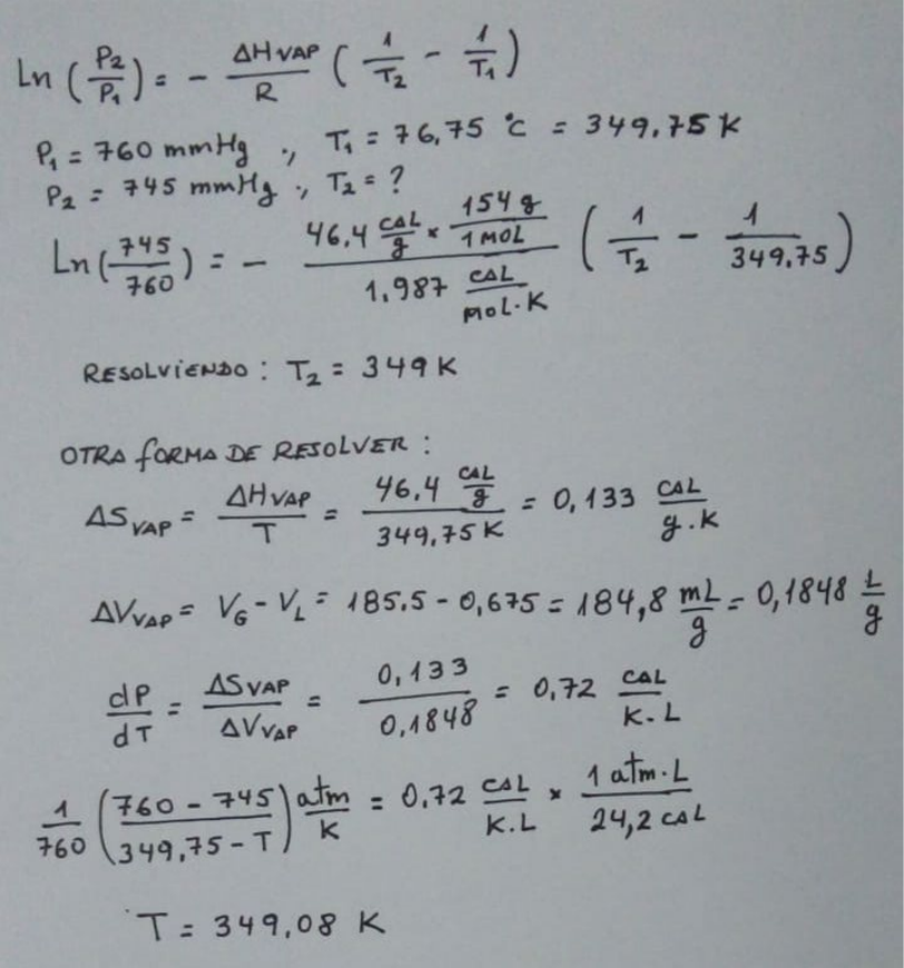EJERCICIOS RESUELTOS: EQUILIBRIO DE FASES EN SISTEMAS DE UN COMPONENTE 3. El calor latente de vaporización del tetracloruro de carbono (CCl4) en su punto de ebullición normal de 76,75 °C es de 46,4 cal/g. Los volúmenes específicos del líquido y de su vapor saturado, en el punto de ebullición, son de 0,675 y 185,5 mL/g, respectivamente. Calcular su temperatura de ebullición bajo una presión atmosférica de 745 mm Hg. 5. Para el benceno líquido, la ecuación de la variación de su presión de vapor, en mm Hg, en relación a la temperatura absoluta, es la siguiente: log P = –1686/T + 7,652. Calcular: a) El calor latente molar de vaporización; y b) El punto de ebullición normal 15. El punto de ebullición normal del yodo es 183 oC. Su presión de vapor (del líquido) a 116,5 oC es 100 mm Hg. Si el calor de fusión es 3,74 kcal/mol y la presión de vapor del sólido es 1 mm Hg a 38,7 oC, calcular la temperatura y la presión del punto triple. A las temperaturas de 20°C y 50 °C, las presiones de vapor de la acetona son de 185 y 613 mm Hg, respectivamente. Halle una ecuación para la acetona, que relacione su presión de vapor (en mm Hg) con la temperatura absoluta.
