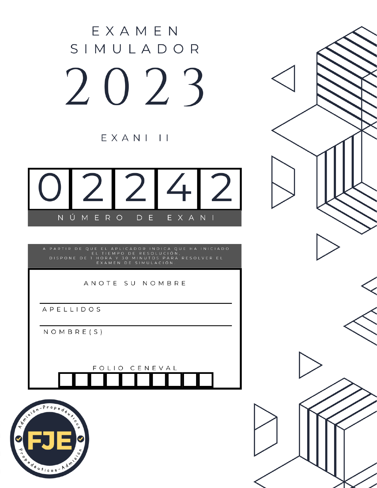 SIMULADOR EXANI 2: ÁREA PENSAMIENTO MATEMÁTICO 1. ¿Cuál es el resultado de la siguiente operación combinada? (3 + 5)(9 − 6) ÷ (16 − 4) + (−1 + 5)(4 + 6) ÷ (15 − 7) a) 13.5 b) 7 c) -3 2. Si A = 1/3 y B = 2/5, elija el resultado de 1/(A+B) a) 11/15 b) 8/3 c) 15/11 3. Se tiene una televisión en la que se pueden sintonizar los canales del 2 al 21. Si se oprime el botón de avance 126 veces, ¿a qué canal llegamos si estamos inicialmente en el canal 10? a) 14 b) 15 c) 16 4. Sí tres personas pueden pintar una casa en 12 días ¿cuántas personas más son necesarias para pintarla en 4 días? a) 6 b) 9 c) 1 5. Carmen quiere dividir una cartulina de 12 decímetros de largo y 10 centímetros de ancho. Si quiere que cada pedazo de la cartulina sea cuadrado y que todos sean iguales y no le sobre cartulina, ¿cuál es la medida más grande de lado que puede obtener? a) 1 b) 2 c) 4 6. Las rutas de circuito colonias, metropolitano y brisas pasan por la puerta de cierto centro comercial cada 30, 45 y 24 minutos, respectivamente. Si a las 5 A.M coincidieron los 3 en la puerta de la plaza. ¿A qué hora volverán a coincidir? a) 8:00 h b) 10:00 h c) 12:00 h 7. En una competencia de atletismo participaron 𝑥 número de corredores. Si 𝑛 de ellos fueron descalificados, 𝑚 abandonaron la competencia y el resto terminaron la carrera, ¿cuál es la expresión que representa el número de atletas que terminaron? a) 𝑥 − (𝑛 − 𝑚) b) 𝑥 − (𝑛 + 𝑚) c) (𝑛 + 𝑚) − 𝑥 8. Una balanza está en equilibrio si se pone una pastilla de jabón en uno de sus platillos y en el otro se pone 2/3 de una pastilla igual y una pesa de 2/3 de kilo. Si 𝑥 representa el peso de una pastilla, ¿cómo debe plantearse el problema para encontrar el valor de 𝑥? a) 𝑥 = 2 3 𝑥 + 2 3 b) 𝑥 = 2 3 𝑥 + 2 c) 𝑥 = 2 3 𝑥 − 2 3 9. Cuál es la cantidad que se obtiene al resolver la operación? (1−4 − 2−3 − 3−2 − 50)−1 a) − 35 72 b) − 72 35 c) 72 35 Jesus Martinez 1 Jesus Martinez 1 Jesus Martinez 1 Jesus Martinez 1 Jesus Martinez 1 Jesus Martinez 1 10. Un terreno tiene por lados a las siguientes expresiones: 3𝑥𝑦 + 2, 𝑥2 + 𝑥𝑦 + 1, 1 − 5𝑥𝑦, 𝑥2 + 2𝑥𝑦 − 3 ¿cuál es su perímetro? a) 2𝑥4 + 𝑥4𝑦4 + 1 b) 𝑥4 − 30𝑥𝑦 − 6 c) 2𝑥2 + 𝑥𝑦 + 1 11. (3𝑎2𝑏 + 2𝑏2)3 = a) 9𝑎6𝑏3 + 6𝑎2𝑏3 + 6𝑎2𝑏4 + 4𝑏6 b) 27𝑎6𝑏3 + 54𝑎4𝑏4 + 36𝑎2𝑏5 + 8𝑏6 c) 27𝑎6𝑏3 + 36𝑎2𝑏5 + 54𝑎2𝑏4 + 8𝑏6 12. ¿Qué expresión es equivalente a 27( 𝑎 – 2𝑏)( 𝑎 – 2𝑏)3 : a) (9𝑎 − 18𝑏) 2 b) (27a − 6b) 2 c) (9a + 18b)2 13. La suma de un número, más sus dos antecesores, menos el sucesor, es 474. ¿Cuál es el siguiente número del original? a) 234 b) 240 c) 241 14. Las soluciones de la ecuación 𝑥2 + 4𝑥 + 3 = 0 son: a) 1, 3 b) -1, -3 c) 1, -3 15. Don Renato tiene 37 animales, entre conejos y gallinas. Todos juntos suman 100 patas. ¿Cuántos conejos y gallinas tiene? a) 12 conejos y 25 gallinas b) 20 conejos y 17 gallinas c) 13 conejos y 24 gallinas 16. Si de la función lineal 𝑦 = 𝐴𝑥 + 𝐵 se obtuvo la siguiente tabla de valores 𝑥 𝑦 0 4 3 6 ¿Cuál es el valor de 𝐴? a) 3 2 b) 2 3 c) 3 4 17. ¿Cuál es la función cuadrática cuya gráfica pasa por (2,6) y su vértice está en (1,2)? a) 𝑓(𝑥) = 4𝑥2 − 8𝑥 + 6 b) 𝑓(𝑥) = 8𝑥2 − 16𝑥 + 6 c) 𝑓(𝑥) = 4 9 𝑥2 − 8 9 𝑥 + 22 9 18. La manera simbólica en que se expresa que un número x está entre -5 y 5 es: a) −5 < 𝑥 < 5 b) 𝑥 > 5 𝑜 𝑥 < −5 c) 𝑥 > −5 𝑜 𝑥 < 5 d) −5 > 𝑥 > 5 19. ¿Cuál de las siguientes gráficas representa la función 𝑓(𝑥) = 𝑠𝑒𝑛(𝑥) + 2? a) b) c) 20. En la figura, PQ=PT, PR=PS, el ángulo PTQ mide 62° y el ángulo RPS mide 34°. ¿Cuánto mide el ángulo QPR? a) 28° b) 17° c) 11° Jesus Martinez 2 21. ¿Cuál es la cosecante? sí Seno ⅘ a) 5 4 b) 5 3 c) 3 5 22. El valor de 𝑎 en el triángulo es: a) 15 𝑠𝑒𝑛50° 𝑠𝑒𝑛60° b) 15 𝑠𝑒𝑛60° 𝑠𝑒𝑛50° c) 𝑠𝑒𝑛50° 15𝑠𝑒𝑛60° 23. La ley de los senos para determinar elementos de un triángulo puede emplearse en todos los casos siguientes, excepto: a) Cuando tenemos dos ángulos y un lado cualquiera. b) Si se tienen dos lados y cualquiera de los tres ángulos. c) Si se tienen los tres lados y alguno de los ángulos. 24. La medida del lado 𝑠 en el siguiente triángulo, es: a) √25 + 36 − 60𝑐𝑜𝑠30° b) √25 − 36 − 60𝑐𝑜𝑠30° c) √25 + 36 + 60𝑐𝑜𝑠30° 25. Se siembran árboles alrededor de un terreno en forma de rectángulo, cuya base es el doble de la altura; los árboles se siembran a una distancia de 2m el uno al otro. ¿Cuántos árboles se siembran si el perímetro del terreno es de 60m? a) 40 b) 34 c) 30 26. Una empresa se encuentra diseñando diferentes presentaciones de un empaque para cierto producto. ¿Cuál de los empaques conviene seleccionar si se requiere tener la mayor capacidad? a) Empaque A b) Empaque B c) Empaque C 27. ¿Cuánto mide la altura de un triángulo equilátero cuyo lado mide 12? a) 6 b) 6√3 c) 3√3 28. Determine la distancia entre los puntos (0,2) y (10,15) a) √169 b)17 c) √269 29. La ecuación 3𝑥 − 4𝑦 + 8 = 0 representa una recta con: a) pendiente ¾ y ordenada al origen 2 b) pendiente ¾ y ordenada al origen -2 c) pendiente -¾ y ordenada al origen -2 30. ¿Cuál es la ecuación de la circunferencia que tiene el centro en el origen y pasa por el punto (2,3)? a) 𝑥2 + 𝑦2 = 13 b) 𝑥2 − 𝑦2 = 21 c) 𝑥2 + 𝑦2 = 17 31. La ecuación general de una parábola con vértice en (3,1) y foco en (3,0), es: a) 𝑥2 − 6𝑥 + 4𝑦 + 5 = 0 b) 𝑥2 − 6𝑥 + 4𝑦 + 5 = 0 c) 𝑦2 − 6𝑥 + 4𝑥 + 5 = 0 32. Se realizó un estudio para conocer la cantidad de días soleados durante el año en el estado de Yucatán. ¿Cuál de la