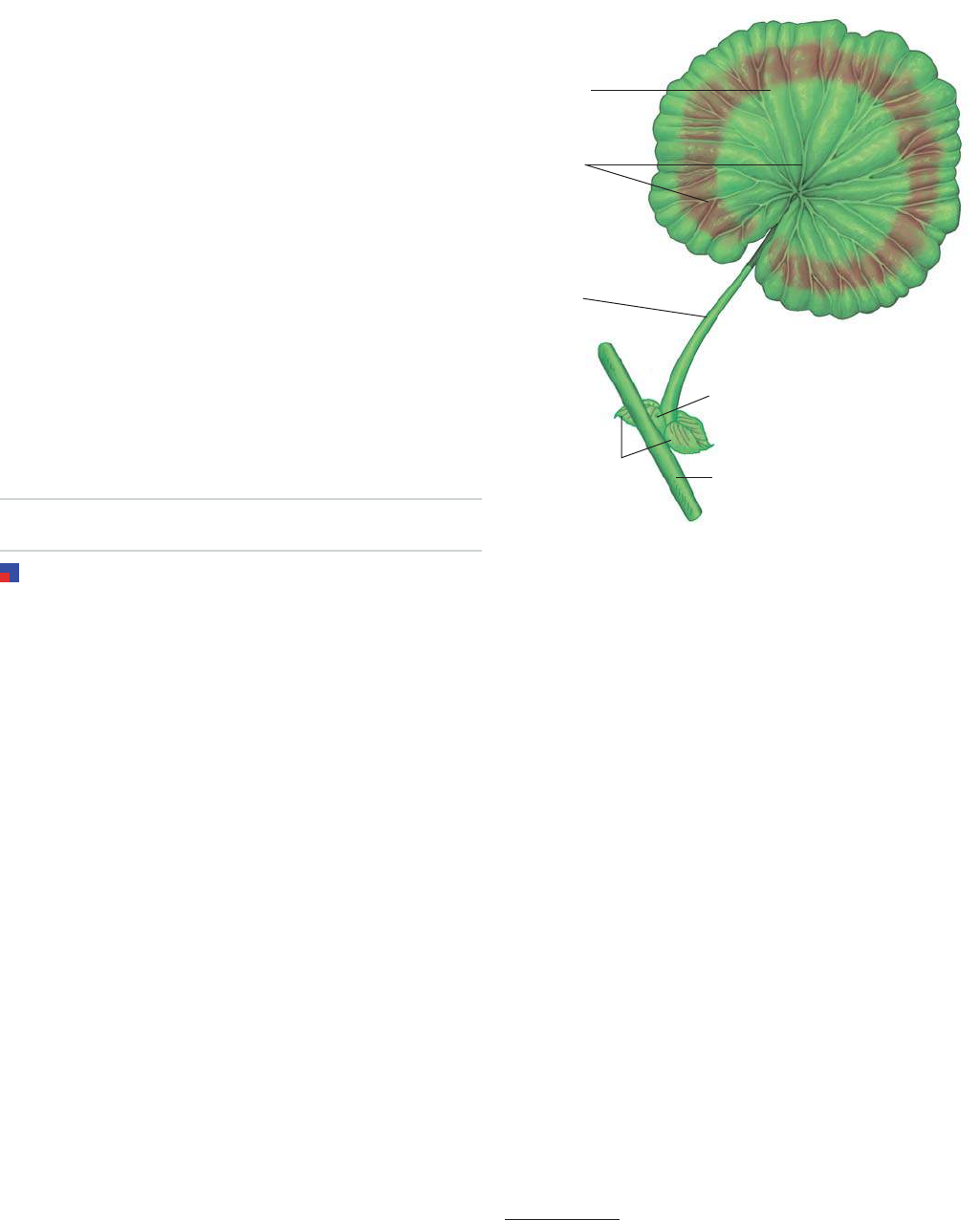 Estructura y función de la hoja 729 axilares nunca se desarrollan en la base de los foliolos. Además, los fo- liolos de una hoja compuesta se encuentran en un solo plano (es posible acostar una hoja compuesta plana sobre una mesa), mientras que las ho- jas simples por lo general no están ordenadas en un plano sobre un tallo. Las hojas están ordenadas en el tallo en una de tres formas posibles (FIGURA 34-2b). Las plantas como hayas y nogales tienen un arreglo fo- liar alternado, con una hoja en cada nodo, el área del tallo donde se unen una o más hojas. En un arreglo foliar opuesto, como ocurre en arces y fres- nos, en cada nodo crecen dos hojas. En un arreglo foliar en espiral, como en los árboles catalpa, en cada nodo crecen tres o más hojas. Las láminas foliares pueden poseer venación paralela, en la que las ve- nas primarias, hebras de tejido vascular, corren aproximadamente para- lelas unas a otras (por lo general característica de las monocotiledóneas), o venación reticulada, en la que las venas se ramifi can de tal forma que parecen una red (generalmente característica de las eudicotiledóneas; FI- GURA 34-2c).1 La venación reticulada puede ser reticular pinnada, donde las venas principales ramifi can en sucesión a lo largo de toda la longitud de la nervadura media (vena principal o central de una hoja), o reticular palmada, con muchas venas principales que radian desde un punto. Los científi cos botánicos usan avanzadas técnicas moleculares para estudiar la base genética de varios aspectos del crecimiento y del desa- rrollo vegetal, incluida la forma de la hoja. Muchos de los genes bajo estudio codifi can factores de transcripción. Como estudió en el capítulo 14, los factores de transcripción son proteínas que enlazan ADN que re- gulan la síntesis de ARN a partir de una plantilla de ADN. Un ejemplo y la efi ciente difusión interna de gases como CO2 y O2. Como resultado de su arreglo ordenado en el tallo, las hojas capturan efi cientemente los rayos del Sol con un mínimo de “interferencia” de hojas vecinas. Las hojas forman un intrincado mosaico verde, bañado en luz solar y gases atmosféricos. Para controlar la pérdida de agua, una delgada capa transparente de cera cubre la superfi cie de la hoja. Tales adaptaciones estructurales están comprometidas entre las necesidades de competencia, y algunas características que optimizan la fotosíntesis para promover la pérdida de agua. Por ejemplo, las plantas tienen poros diminutos que permi- ten el intercambio de gases para la fotosíntesis, pero estas aberturas también dejan escapar el vapor de agua hacia la atmósfera. Por ende, la estructura de la hoja representa una “negociación” entre la fotosíntesis y la conservación de agua. En este capítulo se examinará la forma y la función de la hoja. La forma de la hoja es enormemente variable, y miles de diferentes formas de hoja evolucionaron a lo largo de millones de años. A pesar de esta diversidad, la mayoría de las hojas “funcionan” de la misma forma, y sus estructuras internas (vea fotografía) apoyan esta semejanza en función. 34.1 FORMA Y ESTRUCTURA DE LA HOJA OBJETIVOS DE APRENDIZAJE 1 Discutir la variación en forma de hoja, incluidas las hojas simples frente a las compuestas, el orden de las hojas en el tallo y los patrones de venación. 2 Describir los principales tejidos de la hoja (epidermis, tejido fundamental fotosintético, xilema y fl oema) y marcarlos en un diagrama de la sección transversal de una hoja. 3 Comparar la anatomía foliar en eudicotiledóneas y monocotiledóneas. 4 Relacionar la estructura foliar con su función de fotosíntesis. Las hojas de follaje son los más variables de los órganos vegetales, tanto que los biólogos vegetales crearon terminología específi ca para describir sus formas, márgenes (bordes), patrones de venas y la forma en que se adhieren a los tallos. Dado que cada hoja es característica de la especie en la que crece, muchas plantas pueden identifi carse por sus hojas solas. Las hojas pueden ser redondas, con forma de aguja, en forma de escama, cilíndricas, con forma de corazón o de abanico, o delgadas y estrechas. Varían en tamaño desde las que pertenecen a la palmera rafi a (Raphia ruffi a), cuyas hojas con frecuencia crecen a más de 20 m de largo, hasta las de las Wolffi a, cuyas hojas son tan pequeñas que 16 de ellas puestas extremo con extremo sólo medirían 2.5 cm. La ancha porción plana de una hoja es la lámina; el pedúnculo que une la lámina al tallo es el peciolo. Algunas hojas también tienen estí- pulas, que son protuberancias parecidas a hojas usualmente presentes en pares en la base del peciolo (FIGURA 34-1). Algunas hojas no tienen peciolos (esto es: las láminas se adhieren directamente al tallo) o estípu- las; se dice que las hojas sin peciolo son sésiles. Las hojas pueden ser simples (tener una sola lámina) o compuestas (tener una lámina foliar dividida en dos o más foliolos) (FIGURA 34-2a). En ocasiones es difícil decir si una planta formó una hoja compuesta o un tallo pequeño tiene muchas hojas simples. Una forma sencilla para de- terminar si una planta tiene hojas simples o compuestas es buscar yemas axilares, llamadas así porque cada una se desarrolla en la axila (el ángulo entre el tallo y el peciolo) de una hoja. Las yemas axilares se forman en la base de una hoja, ya sea simple o compuesta. Sin embargo, las yemas Lámina Venas Peciolo Estípulas Tallo Yema axilar FIGURA 34-1 Partes de una hoja Una hoja de geranio consiste en una lámina, un peciolo y dos estípulas en la base de la hoja. Observe la yema axilar en la axila de la hoja. 1 Recuerde que las plantas con fl ores, el punto central de este capítulo, se dividen en dos grupos principales, llamados de manera informal eudicotiledóneas y mono- cotiledóneas (vea el capítulo 28). Los ejemplos de eudicotiledóneas incluyen fri- jol, petunias, robles, cerezos, rosas y cabeza de dragón