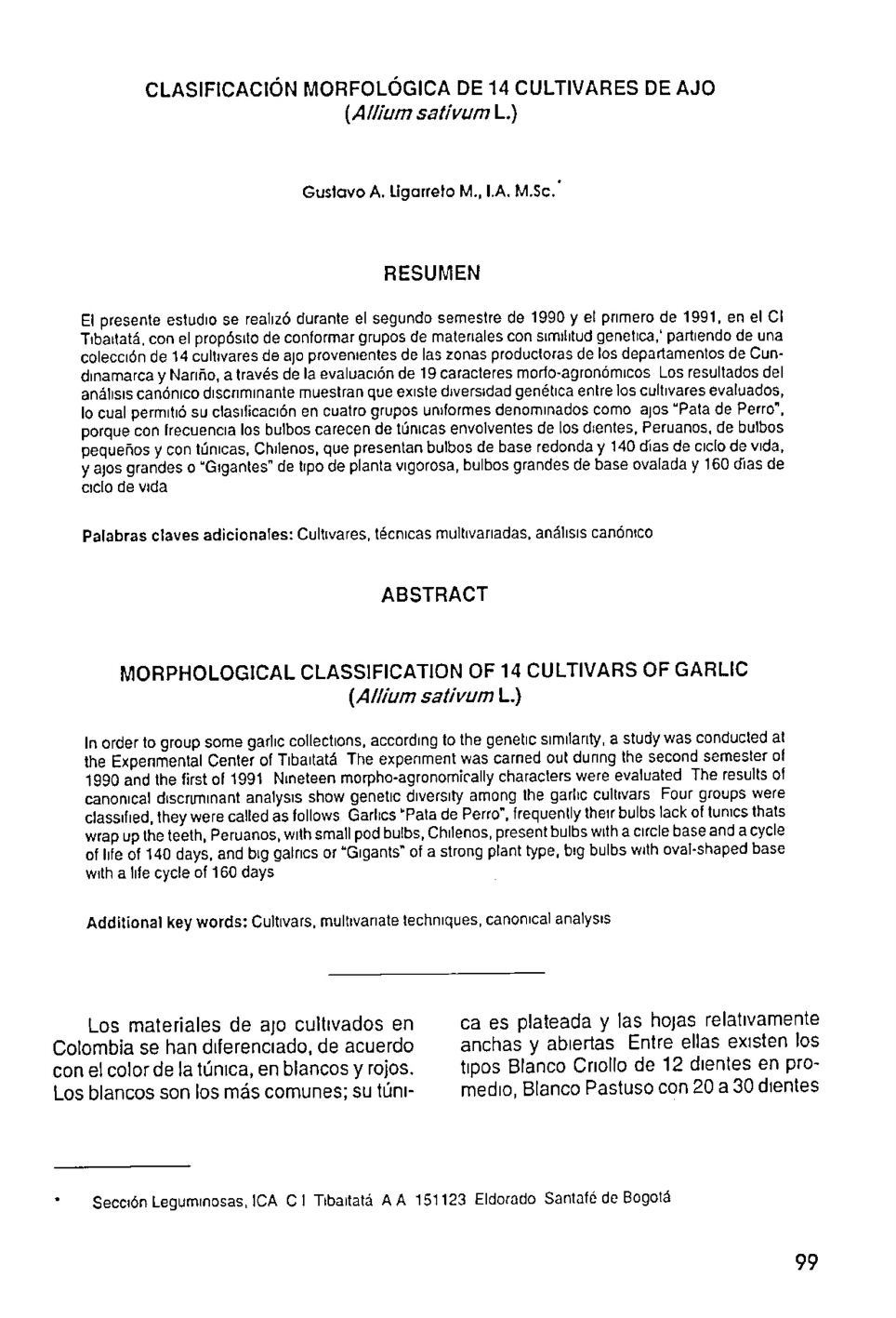LIGARRETO M.,G.A. Clasificaci6n de cuItivares de ajo