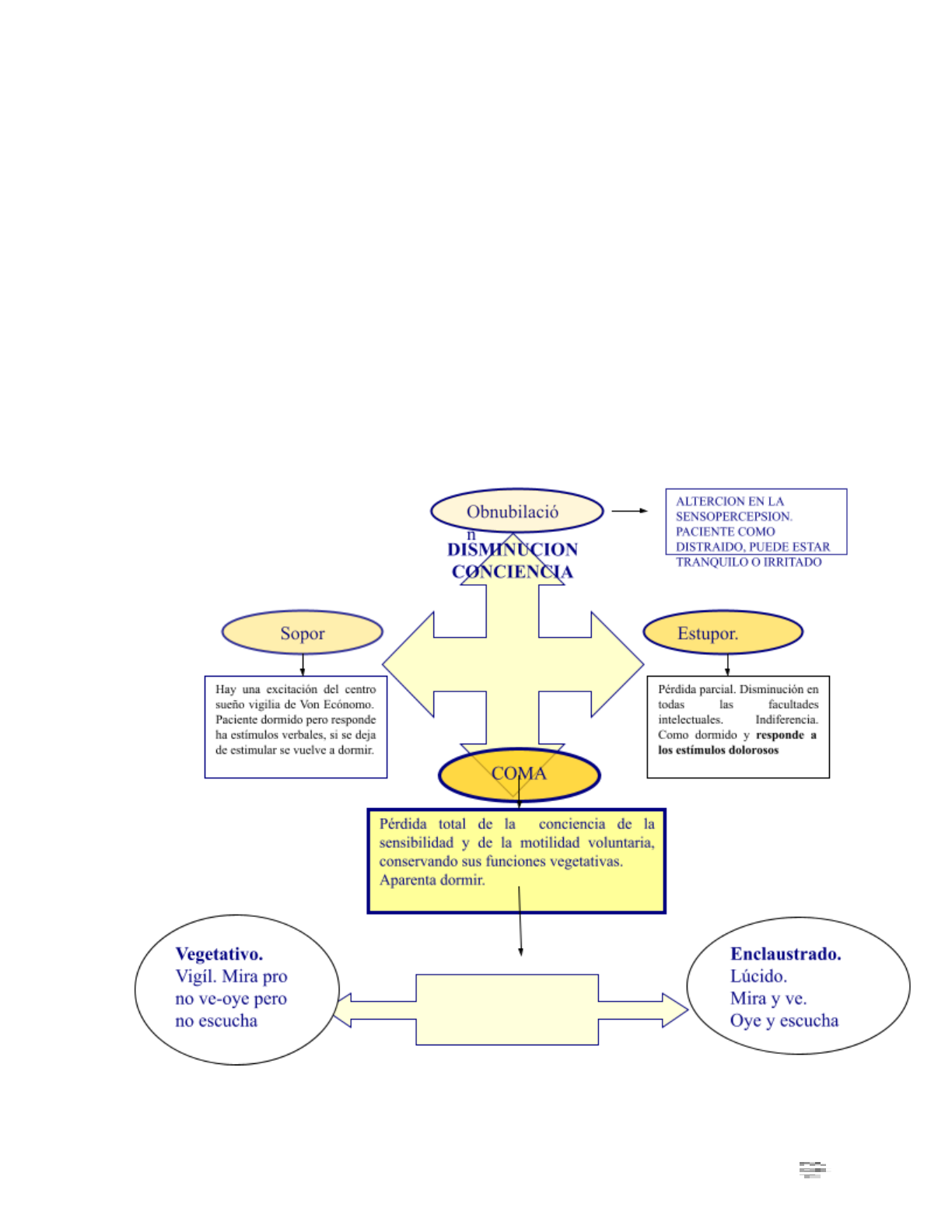INSPECCION GENERAL. ESTADOS DE LA CONCIENCIA. Conciencia: es la facultad de percibir los estímulos internos y externos, que nos permite analizarlos y tomar noción de la realidad de nuestra existencia y del medio que nos rodea. Es decir es el pleno conocimiento que tiene un individuo sobre sí mismo y del medio que lo rodea. Consta de un contenido que está representado por las funciones mentales superiores – aprendizaje, memoria, asociación de ideas, taxia, fasia, praxia- en donde su localización anatómica es básicamente cortico subcortical. y una reactividad representada por la capacidad de despertar o reaccionar frente a los estímulos y por el mantenimiento ciclo sueño-vigilia, su localización anatómica es básicamente mesen céfalo-pontina con proyecciones hacia la corteza y bulbumedulares – cordones posteriores, sistema activador reticular ascendente. Se evalúa al paciente con la escala de Glasgow; normal es 15/15, se habla de coma cuando el puntaje es 8/15. La postura de flexión de ambos MMSS y la extensión de los MMII o flexión se llama postura de decorticación, indica que el nivel de la lesión es corticosubcortical. La postura de extenso pronación de MMSS y MMII se llama postura de descerebración indica que la lesión esta en el mesencéfalo o protuberancia. La ausencia de respuesta motora indica lesión pontino baja o bulbar. ETIOLOGÍA DEL COMA. ACV isquémico ACV hemorrágico Hematoma intracraneano. Tumores. Abscesos. Hidrocefalia. Meningitis. Encefalitis. Status epiléptico. Encefalopatía hipertensiva. Hipertensión endocraneana. Hay causas carenciales como la enfermedad de Wernick la cual se da en el alcohólico más frecuentemente debido a un déficit de vitamina B1 –tiamina. Causas traumáticas como el TCE, que entraría dentro de las estructurales. Las alteraciones de la conciencia por excitación son: DELIRIO. ALUCINACIONES. ILUSIÓN. IRRITABILIDAD. DELIRIO: estado de perversión de la conciencia por un desorden de las facultades mentales con o sin alteración de la moral, que lleva a la asociación de ideas incoherentes o actos y actitudes desordenadas sin advertir el error. Luego de pasado el delirio el enfermo no recuerda nada de lo sucedido. ALUCINACIONES – equivocarse- El enfermo percibe algo inexistente, pueden acompañar a los delirios y son pasajeras. Las causas más frecuentes son los tóxicos internos o externos. Estas pueden ser: -Internas o cinestésicas: las percepciones se refieren a un órgano interno. -psíquicas: los pensamientos son dictados por voces interiores. -sensoriales: sensaciones irreales –oyen voces, ven objetos o personas- Aquí el objeto no existe. ILUSION: se trata de percepciones erróneas por acción de la imaginación exaltada o por engaño de los sentidos. Aquí hay objeto pero son interpretaciones erróneas. IRRITABILIDAD: se refiere más al carácter que ala conciencia. Otras alteraciones son: -amnesia: disminución o pérdida total de algunas formas de memoria. Abulia: disminución o pérdida de la voluntad. Afasia: disminución o abolición de la facultad de expresarse, nos orienta hacia procesos cerebrales fronto-parietales –hemorragias, tumores, traumatismos.- Insomnio: falta de sueño o dificultad para dormirse. En neurosis de angustia, procesos dolorosos, estados subfebriles, asma bronquial. Hipersomnia: sueño prolongado y deseo de dormir durante el día. En anemias, histeria, hipotiroidismo, dispepsias, tumores cerebrales, depresión. Narcolepsia. Sueño irresistible y profundo en forma paroxismal en cualquier circunstancia. Se observa en tumores cerebrales ubicados en el tercer ventrículo, encefalitis, uremia, poliglobulias- ACTITUD: Manera de estar de pié. Hemiplejia espástica. En ACV, hemorragias cerebrales, tumores, etc., el lado paralizado el brazo está flexionado sobre el brazo y la mano en ligera pronación, semicerrada, el muslo y la pierna ligeramente flexionada y el pié en ligero equinismo y rotación interna. Se acompaña de contractura y los signos de piramidalismo.- Babinsky, clonus, hiperreflexia, hipertonía con el signo de la navaja y abolición del reflejo cutáneo abdominal. -paraplejia esvástica: se observa en procesos medulares que han lesionado el haz piramidal –tu. Medulares, traumatismos- el tronco se encuentra ligeramente flexionado hacia delante, los brazos en balancín, las piernas ligeramente flexionadas, las rodillas en genu valgum y los pies en rotación interna. -Parkinson: todo el cuerpo está rígido, parece una estatua, la cabeza ligeramente hacia delante formando un bloque con el cuello y el tronco, los brazos semiflexionados y pegados al tronco, las piernas semiflexionadas. Tienen bradicinesia y temblor generalizado, que en las manos es característicos en cuenta moneda. Espondilitis rizomélica: hay una anquilosis vertebral y las articulaciones del hombro y cadera. Se caracteriza por: xifosis Cerviño-dorsal, rigidez de las articulaciones del hombro y cadera, hay ligera flexión de los brazos y piernas, lo que le da un aspecto senil. Sus movimientos son difíciles, lentos y el cuerpo está encorvado. -gigantismo asténico: en individuos jóvenes de crecimiento exagerado y rápido. Presentan xifosis dorsal y lordosis lumbar, que llevan la cabeza hacia adelante, los hombros hacia atrás y la pelvis hacia adelante, todo esto necesario para mantener la estática comprometida por la hipotonía muscular y ligamentosa, es decir el eje de equilibrio. DECUBITO Es la manera de yacer en el lecho. -lateral sobre el lado enfermo: en pleuresías con derrames grandes; de ésta forma la presión que se ejerce sobre el mediastino disminuye, consiguiendo calmar las molestias cardíacas y la disnea. También se observa en neumotórax, grandes quistes, bronquiectasias. -lateral sobre el lado sano: se observa en las neuritis intercostales, pleuresías incipientes, de ésta forma se alivian los dolores, si se acostara del lado enfermo el dolor aumentaría. - Supino dorsal. En