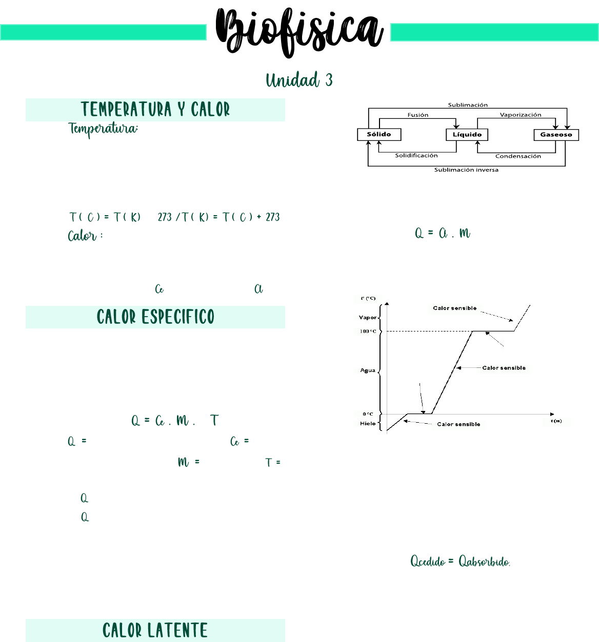 • La propiedad de todo sistema macroscópico que indica su estado térmico. La temperatura es un indicador de la velocidad del movimiento de las moléculas de la sustancia. ° ° – ° ° • Forma de energía que pasa de un cuerpo a otro cuando están a diferentes temperaturas. Existen dos tipos de calor: Calor específico ( ) y Calor Latente ( ). • La cantidad de calor que hay que entregarle a uno gramo de una sustancia para que aumente su temperatura en 1°C. En ese caso, no hay cambio de estado. • Para el agua en estado líquido: 1cal/g.°C. ∆ • calor intercambiado (cal), calor específico (cal/g.°C). masa (g), ∆ diferencia de temperatura (°C). • Si es(+) el cuerpo recibió calor (absorbió) Si es(–) el cuerpo entregó calor (cedió) Para practicar: Un cuerpo de 150 hectogramos se encuentra dentro de un sistema adiabático. Calcule cuántas calorías necesita absorber para que su temperatura se eleve en 11 Kelvin. Considere que el cuerpo no sufre ningún cambio de estado y que su Ce = 0,6 cal/g °c. Respuesta:………….. Q = 99000 cal • Los cambios de estados de agregación de la materia son consecuencia de la pérdida o ganancia de calor, y la temperatura se mantiene durante la transformación. • Es la cantidad de calor que hay que entregarle a uno gramo de una sustancia para que cambie su estado de agregación. • Calor latente en el agua: Fusión: 80cal/g; Solidificación: -80cal/g; Vaporización: 540cal/g; Condensación: -540cal/g. • Transmisión de calor: “Si se pone en contacto dos o más cuerpos a diferentes temperaturas, intercambiarán calor entre sí hasta que todo el todo el sistema tenga la misma temperatura. La cantidad cedida por uno de los cuerpos es igual a la absorbida por el otro. Para practicar: Un freezer absorbe 2,3 kilocalorías por minuto en forma constante. Se coloca en el mismo 1 decímetro cúbico (1 dm3 ) de agua a 10 °C y 1 atm. Se lo deja en este sistema hasta que alcanza una temperatura de -18°C. ¿Cuánto tardará el freezer en convertir el agua en hielo a -18°C? Exprese el resultado en segundos. Considere al freezer como un sistema adiabático. Datos: Cfusión hielo = 80 cal/g Ce hielo = 0,5 cal/g°C. Respuesta:…………… 2.582,6 segundos. Calor latente de fusión o solidificación Calor latente de vaporización o de condensación 3 3 – • Conducción: Al calentar la parte más prójima de la fuente de calor, las moléculas de ahí empiezan a vibrar más rápido y de esa manera atingen a las que tienen al lado y así el calor se va propagando al largo de toda la superficie. Ocurre solamente en sólidos. • Ley de Fourier: ∆ ∆ • Flujo de calor (cal/s; cal/h; Kcal/h), Constante de conductibilidad del material ( 𝑐𝑎𝑙 𝑐𝑚.𝑠.°𝐶 o 𝐾𝑐𝑎𝑙 𝑚.𝑠.°𝐶 ) área (m² o cm²), ∆ longitud (cm o m), ∆ diferencia de temperatura (°C). • Convección: La transformación de calor por consecuencia del desplazamiento del flujo por el cambio de densidad. Ocurre solamente en fluidos (líquidos y gaseosos). • Radiación: El calor es transmitido a través de ondas electromagnéticas, puede propagarse en un medio material o en el vacío. La velocidad de la propagación de la luz en el vacío es: 300.000 km/s. Para practicar: El extremo de una barra cilíndrica de metal de 2 cm de radio y 10 cm de longitud, se coloca al fuego. Al cabo de 10 segundos se produce un flujo de 500 calorías. Si la constante de conductibilidad (k) del metal es 0,0125Kcal/m.s.°C indique cuanto es la variación de temperatura entre los extremos de la barra metálica Respuesta:…………. ∆ = 318,4 °C. • Es el cambio de estado de un sistema, puede ocurrir de dos maneras: mecánica (trabajo) o térmica (calor). • Para gases ideales: ∆ • trabajo (l.atm o dm .atm), presión (atm), ∆ final – inicial (l o dm ) • Si ∆ > 0 : > 0 (+): el gas se expande. • Si ∆ < 0 : < 0 (-) : el gas se comprime. Para practicar: Un gas se expande desde los 1,5 litros, hasta 10 veces su volumen inicial, a 1 atm de presión. Calcule que masa de agua (expresada en Kg) podría aumentar su temperatura de 20°C a 20,5°C aplicando un trabajo igual al realizado por dicho gas. Dato: Ceagua = 1cal/g°C. Respuesta:………….. 0,658Kg • El contenido de un sistema termodinámico. • Depende de la temperatura del gas. ↑ :↑ ∆ : ∆ > 0 : > : ↑ : > 0 ↓ :↓ ∆ : ∆ < 0 : < : ↓ : < 0 = : ∆ = 0 • Primer principio de la termodinámica: “la energía interna de un sistema puede modificarse al intercambiarse calor y/o a realizar trabajo. ∆ – • (Unidad: Cal) • ∆ (Unidad: Joule) • 2 cal = 8,31 Joule = 0,082 l.atm/K.mol Para practicar: Un mol de gas ideal evoluciona de un estado A, con un volumen de 30 litros y una presión de 1 atm, a un estado B, con la misma presión y volumen de 25 litros. Indique la opción correcta respecto de la variación de energía interna y el trabajo realizado en el proceso A → B a) ∆ > 0 y > 0 b) ∆ > 0 y < 0 c) ∆ < 0 y > 0 d) ∆ < 0 y < 0 Respuesta:…………. d) ∆ < 0 y < 0 Experimento de Joule • En 1850 el físico Joule desarrolló un experimento usando un dispositivo que contaba con unas pesas conectadas por un cable a un eje que hacia girar unas paletas dentro de un recipiente adiabático con un volumen de agua conocido. Por la acción de las paletas, la temperatura del agua aumentaba en una cantidad que Joule fue capaz de medir en 3 milésimos de grado. Calculó el trabajo mecánico generado por la caída de las pesas a través de la fórmula: • : peso de cada pesa. • cantidad de veces que las pesas caen. • altura desde donde caen las pesas. • Luego aplicó la ecuación general de la calorimetría para calcular la cantidad de calor que sería necesario para generar el mismo incremento de temperatura que produjo el trabajo de las presas en cada caída. ∆ • Obtuvo un valor constante: w 𝑄 4,18 J 1 cal Para practicar: Calcule el peso (calc