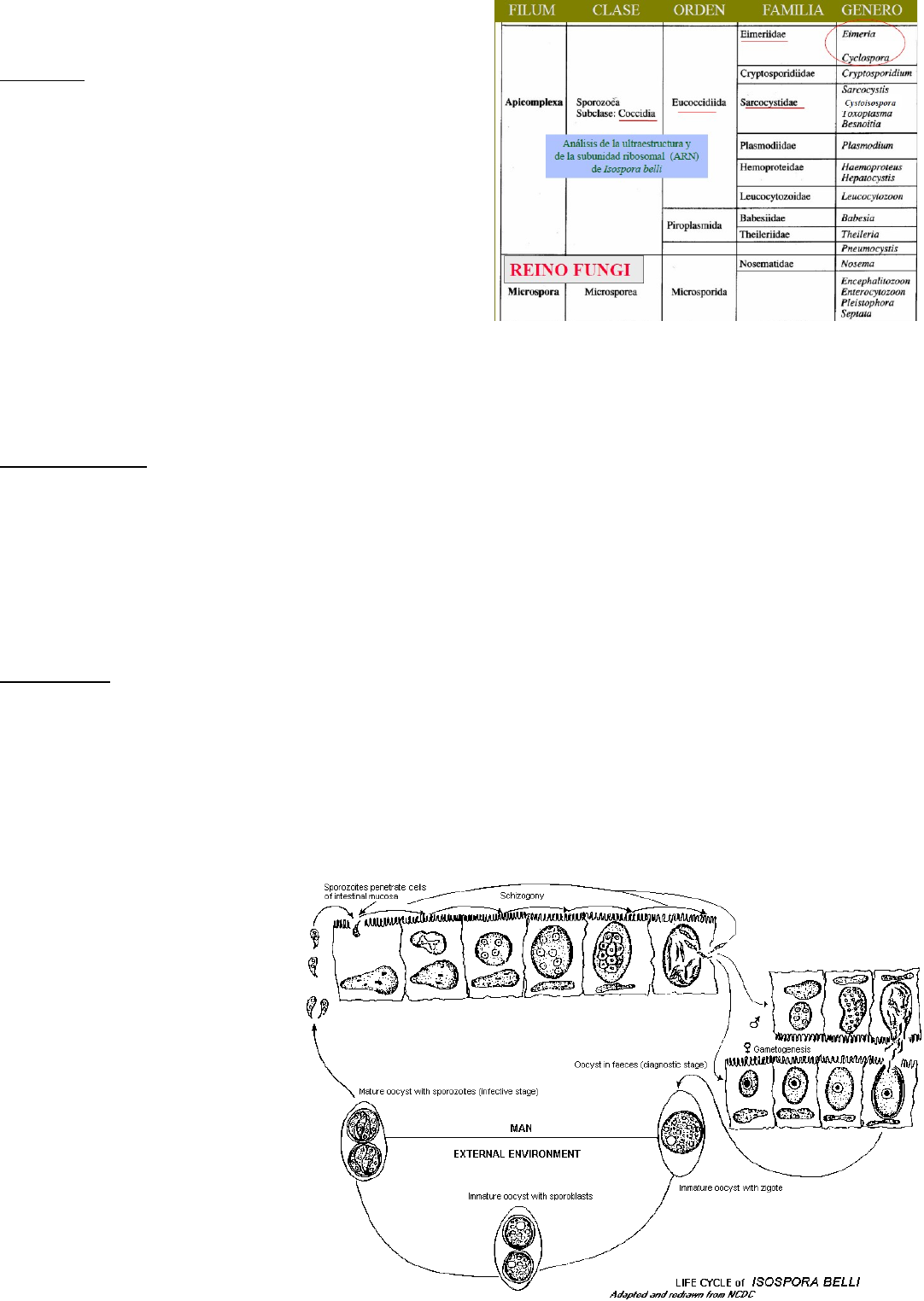 COCCIDIOS Taxonomía Reino: protista Subreino: protozoa Filum: apicomplexa Clase: sporozoea Subclase: coccidia Orden: eucoccidiida Familia: Sarcocystidae - Eimeriidae Géneros: Cystoisospora – Cyclospora, Eimeria Especies: C.belli - C.cayetanensis, Eimeriasp Los coccidios son protozoos, parásitos intracelulares de las células epiteliales del intestino, o endoteliales de los vasos de órganos internos. Efectúan un ciclo asexual (esquizogonia) y uno sexual (esporogonia) en el mismo individuo, ciclo monoxénico, no necesitando hospedador intermediario. Cystoisospora belli · Protozoo, formador de espora (esporoquistes). · Enfermedad cosmopolita. · Pasó de ser una enfermedad rara a causa frecuente de diarrea en inmunosuprimidos. · El numero de casos coincide con el incremento de pacientes con HIV. · Ooquiste de forma oval, con membrana delgada y transparente de 30x14μm. · En inmunocompetentes la enfermedad es autolimitada o puede ocurrir de manera asintomática Ciclo biológico · Ciclomonoxénico, desarrollándose en el mismo individuo la reproducción sexuada y asexuada. · Hábitat: Intestino delgado (duodeno distal-yeyuno proximal) · El ciclo asexuado es el que mayor daño produce y es el responsable de casi toda la patología presente en el paciente. · La fase sexuada da como resultado un ooquiste inmaduro, que es eliminado con las heces. · El ooquiste madura en el medio externo, convirtiéndose en el elemento infectante para el hombre. La infección se inicia con la ingestión de ooquistes esporulados (maduros). Los esporozoítos liberados penetran las células epiteliales de intestino delgado, en las que se lleva a cabo la reproducción asexual: esquizogonia o merogonia, que da lugar a merozoítos, los cuales invaden nuevas células. Algunos sufren la diferenciación a micro y macrogametos, que se fusionan (reproducción sexual), con la formación de un cigoto y posteriormente, de un ooquiste inmaduro (forma diagnóstica), oval y translúcido, de unos 14 a 30μm, en cuyo interior se encuentra un cuerpo esférico, el blastómero, el cual se divide posteriormente en dos esporoblastos. Una vez eliminado el ooquiste con las heces fecales, se desarrollan en su interior 2 esporoquistes, cada uno con 4 esporozoítos móviles (ooquistemaduro, forma infectiva). La esporulación requiere de condiciones de humedad, temperatura y oxígeno adecuados y se lleva a cabo en unas 24 a 48 horas. Patología y Sintomatología · Reacciones inflamatorias con diferentes grados de necrosis de mucosa y submucosa. · Aplanamiento de las microvellosidades. · Diarreas acuosas (85%) de duración prolongada (5 a 10/día). Sin sangre ni moco. · Diarreas recurrentes, de aparición espontanea. · Malabsorción y pérdida de peso. · Dolor abdominal (30 al 68%), meteorismo (40 a 65%) fiebre (30 al 50%), anorexia (30 al 65%), deshidratación, nauseas, vómitos, síndrome de mala absorción y esteatorrea. · En casos graves, la muerte. Diagnóstico · Hallazgo de ooquistes en examen en fresco de materia fecal ó liquido duodenal. Puede presentar fases negativas. · Ooquistes de características ácido-alcohol resistentes. Se tiñen con Ziehl-Neelsen (frío) (coloración de Kinyou). · Coloración Auramina (no es inmunofluorescencia!!!), algunos libros o autores la mencionan, nuestra experiencia indica que podría dar falsos +. · Métodos de concentración (flotación). · No conservar las muestras con alcohol polivinílico (PVA) ya que deforma los ooquistes y dificulta la observación. · Maduración (esporulación) de los ooquistes en dicromato de potasio(2%), a temperatura ambiente. · En pacientes HIV se emplea con éxito biopsia duodenal (heces negativas) y algunos métodos de inmunofluorescencia directa. · La hipereosinofilia es un rasgo característico de esta enfermedad, alcanzando valores entre 20 a 50%. · Pueden hallar cristales de Charcot–Leyden (producto de la degradación de los eosinófilos) Cyclospora cayetanensis · Parásito de reciente descubrimiento (1979/1993). · Existen 13 especies de Cyclospora, solo una parasita al hombre. · Parásito de distribución cosmopolita, existen áreas endémicas (Peru, Nepal, Haiti) · Enfermedad altamente relacionada a pacientes inmunodeprimidos HIV-SIDA. · Presenta un ooquiste esférico, de membrana fina y transparente, de 8 a 10μm de diámetro. · En inmunocompetentes la enfermedad es autolimitada o puede ocurrir de manera asintomática. Ciclo biológico · Tiene un ciclo de reproducción sexuado (gametogonia) y otro asexuado (esquizogonia) que se llevan a cabo en el mismo hospedador. Es un protozoo intracelular obligado, desarrollándose en los enterocitos del intestino delgado dentro de una vacuola parasitófora. Durante la reproducción asexuada se forman merontes de tipo I y tipo II y merozoítos. · Estos últimos conducen a la formación de gametocitos. El gametocito masculino fertiliza al femenino produciendo un zigoto y finalmente a partir de éste, y como producto de reproducción sexuada, se forman ooquistes que se eliminan inmaduros con las heces · El ooquiste madura en el exterior entre 5 a 13 días, bajo condiciones de humedad y temperatura. · Puede observarse estacionalidad en la infección por Cyclospora, produciéndose especialmente en períodos lluviosos y cálidos. · Las manifestaciones clínicas severas se presentan en pacientes con HIV Diagnostico · Hallazgo de ooquistes en materia fecal. · Los ooquistes presentan groseras granulaciones con auto fluorescencia (refringencia). · No se tiñen con lugol, y toman selectivamente la coloración de Kinyou. Coloración Auramina?. · Esporulación de los ooquistes condicromato de potasio, para diferenciar de Cryptosporidium y de algas verde-azuladas. · Medición con micrómetro ocular para diferenciar de Cryptosporidiummuris (7,8μm). La prevalencia reportada de C. cayetanensis en niños con diarrea aguda es de 6 a 18% en Perú; 5,3% en niños venezolanos de zona rural, 4,4% 